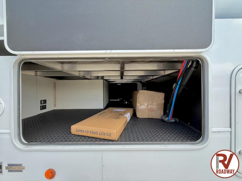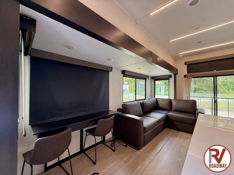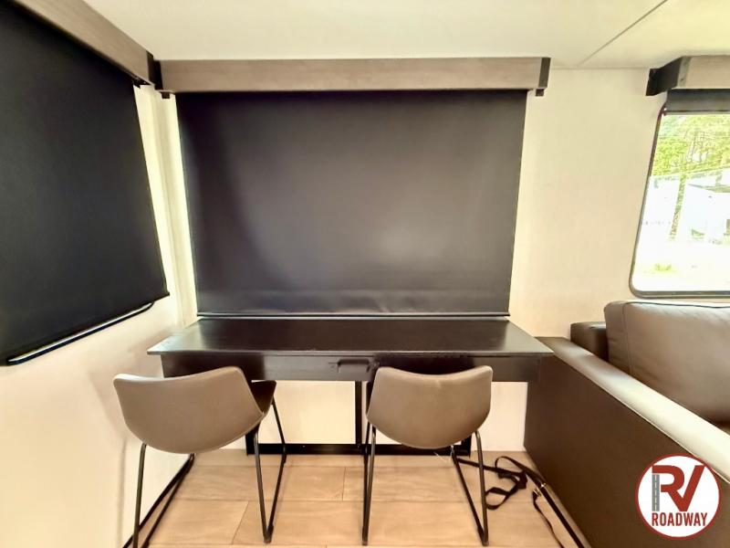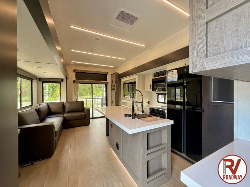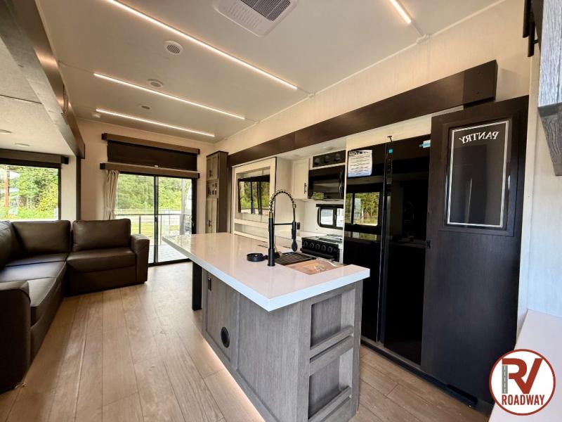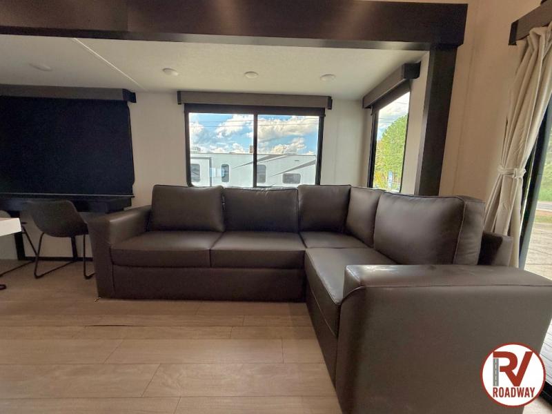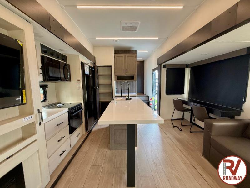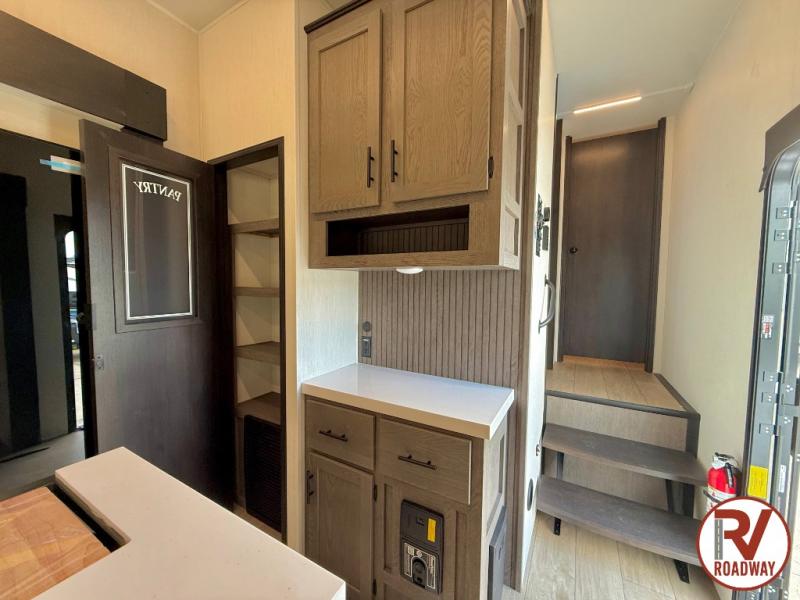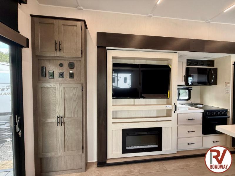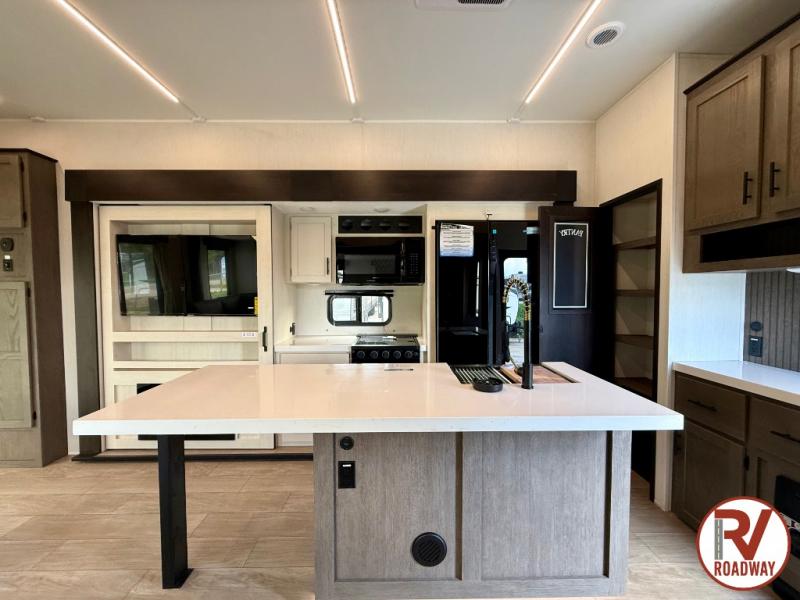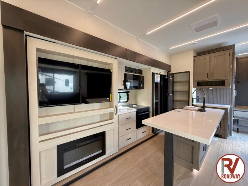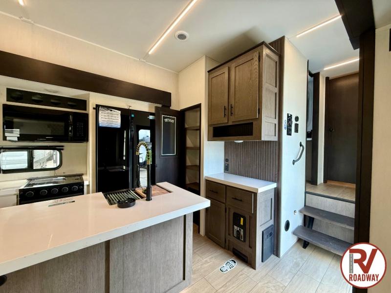 You're going to love camping in this triple slide out fifth wheel that is packed with amenities! The rear deck with a covered patio will provide a place to visit with campground neighbors, and inside, there is an L-shaped tri-fold sofa where guests can sleep. You'll find a king bed slide in the front master bedroom for you, along with a spacious wardrobe and dresser, a bedroom fireplace, plus washer and dryer prep if you choose to add these appliances. The kitchen is any chef's dream with its large island with two chairs, solid surface kitchen countertops, spacious 16 cu. ft. refrigerator, plus a hidden pantry behind the TV for all the dry goods.