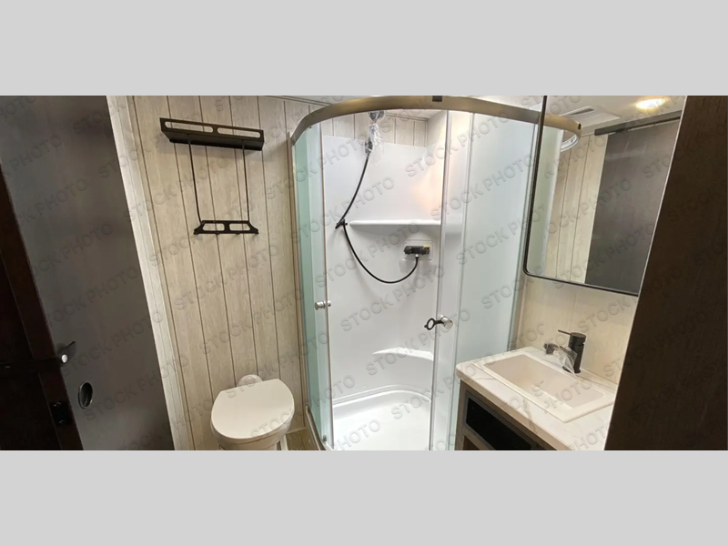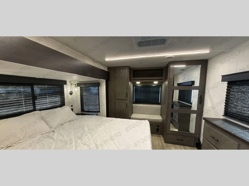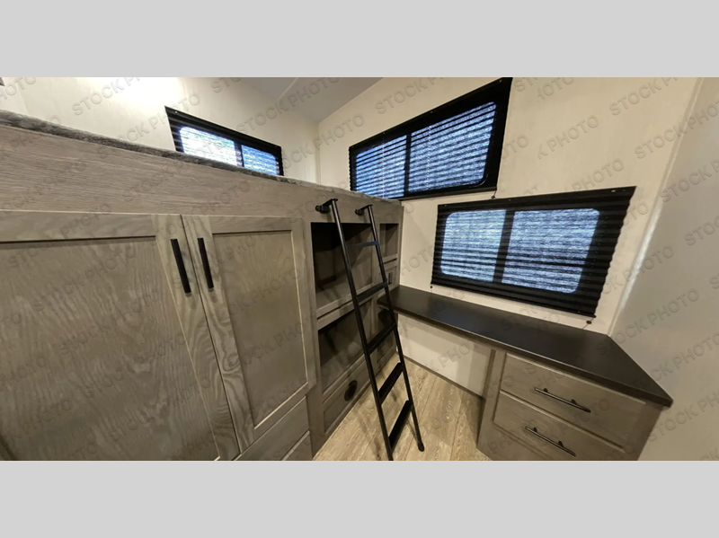You can't beat this dual entry fifth wheel packed with luxury amenities! Your guests will love the rear private bunkhouse which maximizes sleeping capacity with a 28" x 72" bunk, 54" x 74" bunk, and jack knife sofa with a trundle! This room also has its own full bath with an exterior entry door for ultimate convenience. Up front you will find a luxurious master bedroom, with a king bed slide, fireplace, wardrobe with a sun bench, and washer/dryer prep. The full bath here features a radius shower and plenty of storage. The main kitchen and living area includes dual opposing slides, a tri-fold sofa across from the fireplace, and a dinette. The kitchen includes a 16 cu. ft. 12V residential refrigerator, a hutch, and a pantry for storage as well. Head outdoors to enjoy the exterior griddle and two exterior awnings, plus the pass-through storage!