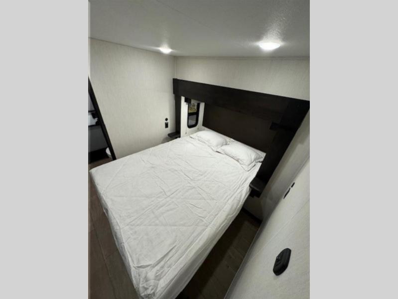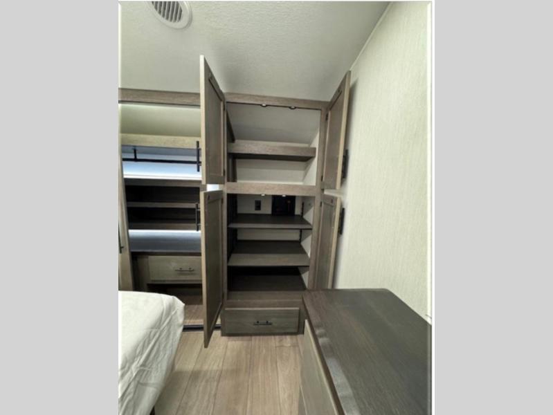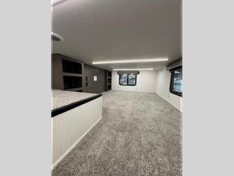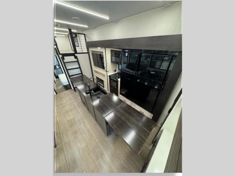 This quad-slide layout is set up for long stays and easy routines. The kitchen centers around a beautiful kitchen island for prep, the free-standing range is perfect for making full-size meals, and clean-up is a breeze with the built-in dishwasher. Across the living/kitchen zone you’ll find seating oriented to the entertainment wall and an LED TV, so movie nights don’t fight the cook space. Up front, the suite’s king bed slide faces a bedroom fireplace, with deep hanging space and drawers to keep wardrobes organized. Outside, the dual entry design improves campsite flow, and the triple-awning coverage stretches usable patio space. There is also more space for kids or guests in the upper loft!