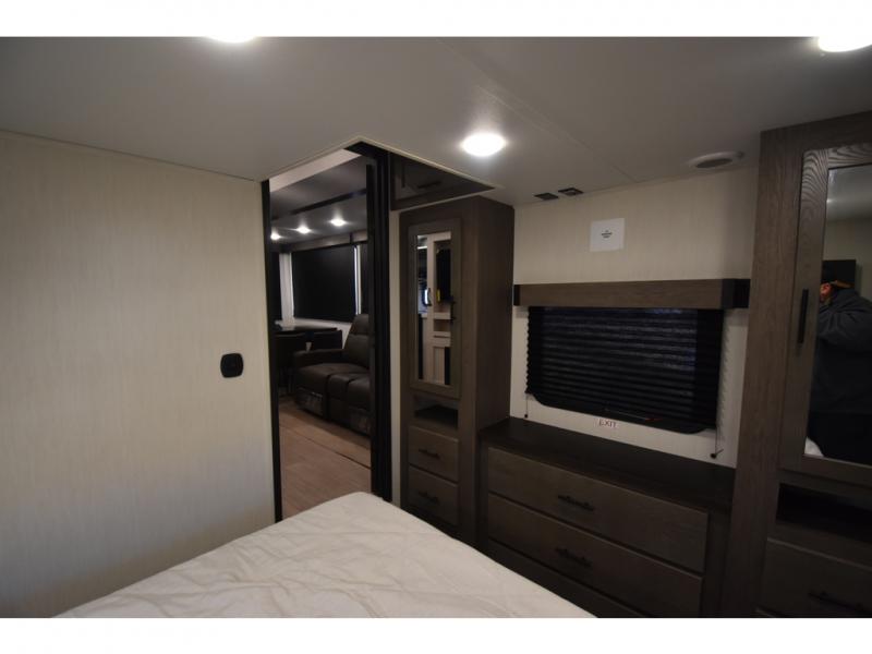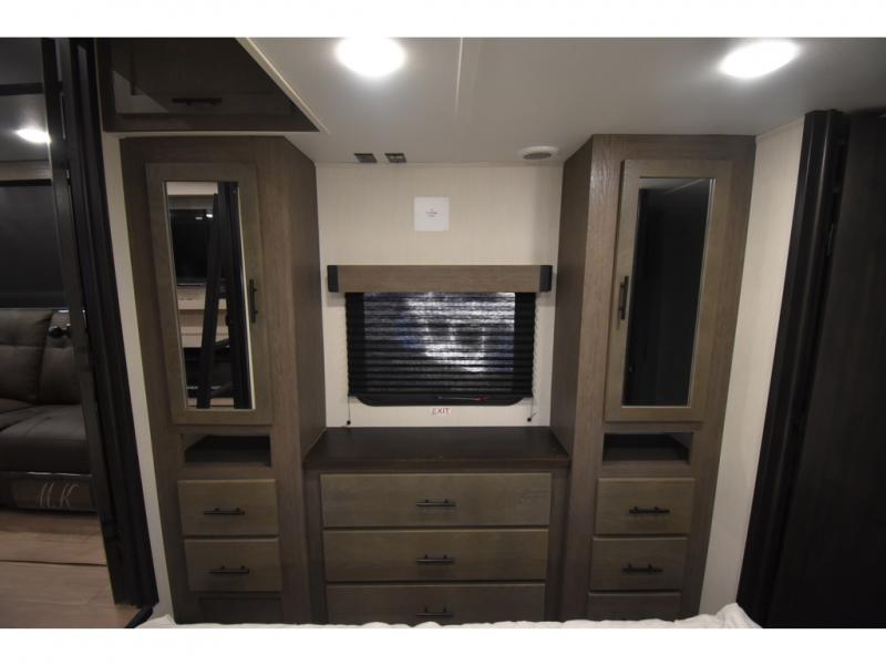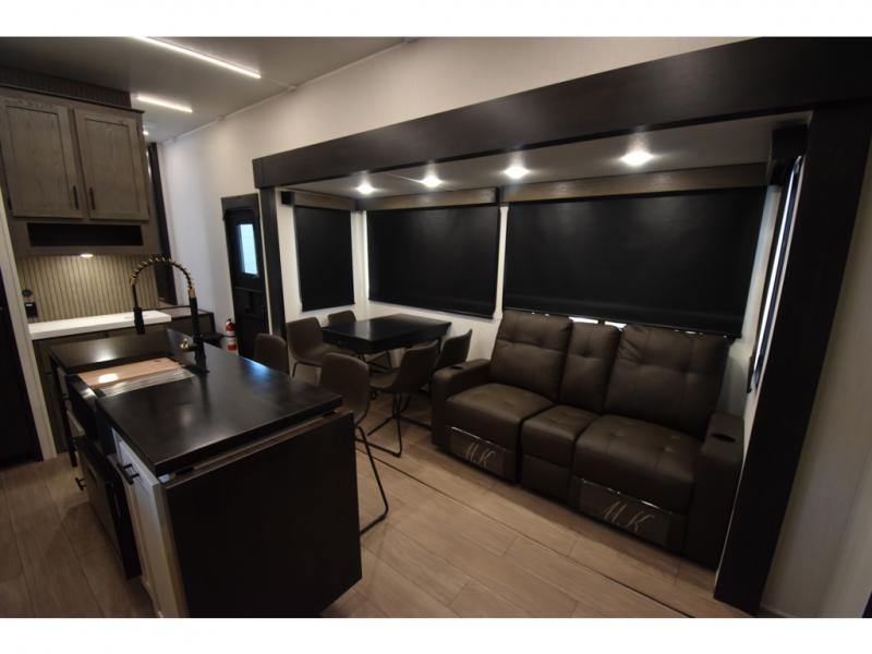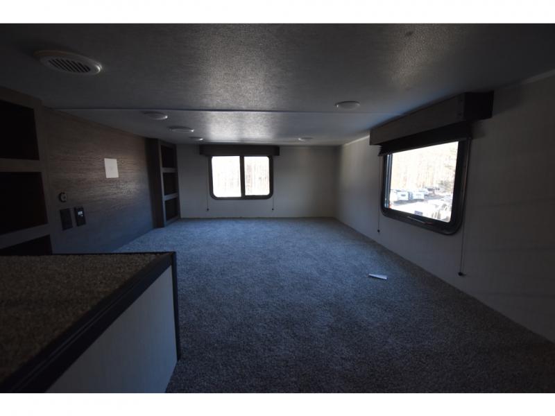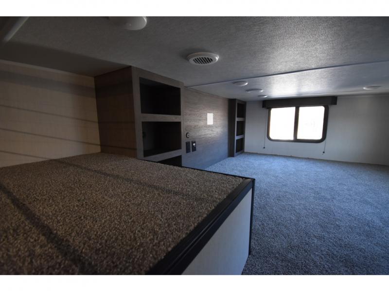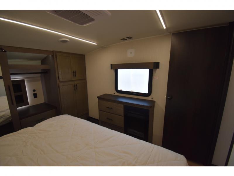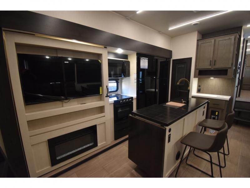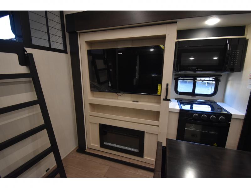 This quad-slide layout is set up for long stays and easy routines. The kitchen centers around a beautiful kitchen island for prep, the free-standing range is perfect for making full-size meals, and clean-up is a breeze with the built-in dishwasher. Across the living/kitchen zone you’ll find seating oriented to the entertainment wall and an LED TV, so movie nights don’t fight the cook space. Up front, the suite’s king bed slide faces a bedroom fireplace, with deep hanging space and drawers to keep wardrobes organized. Outside, the dual entry design improves campsite flow, and the triple-awning coverage stretches usable patio space. There is also more space for kids or guests in the upper loft!