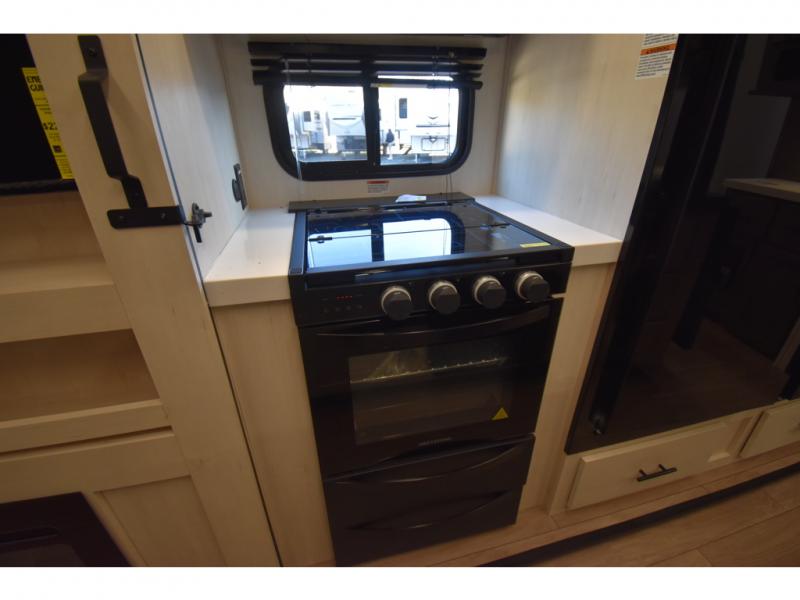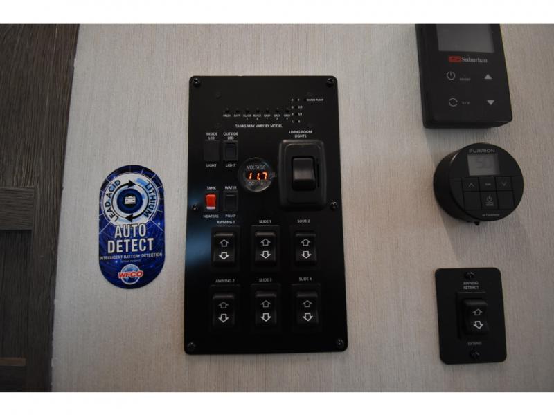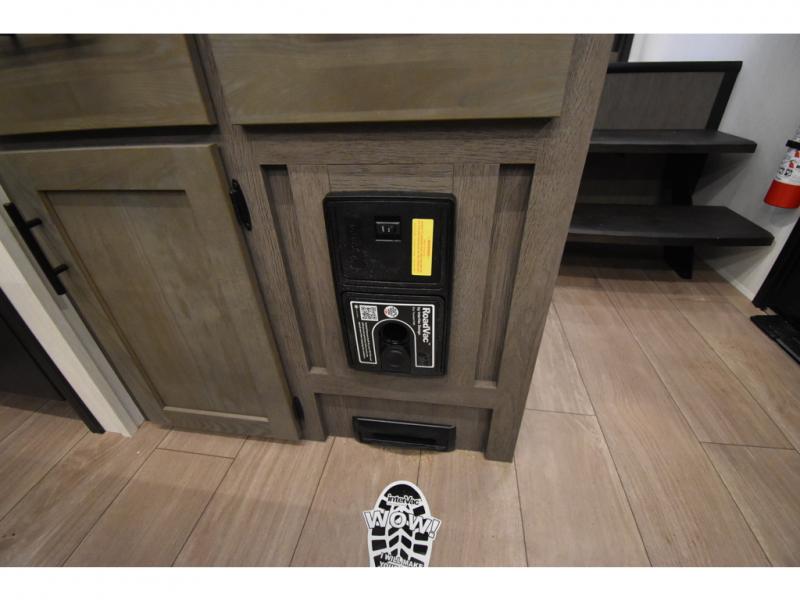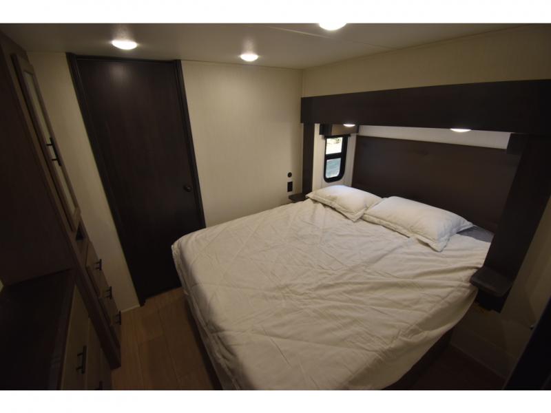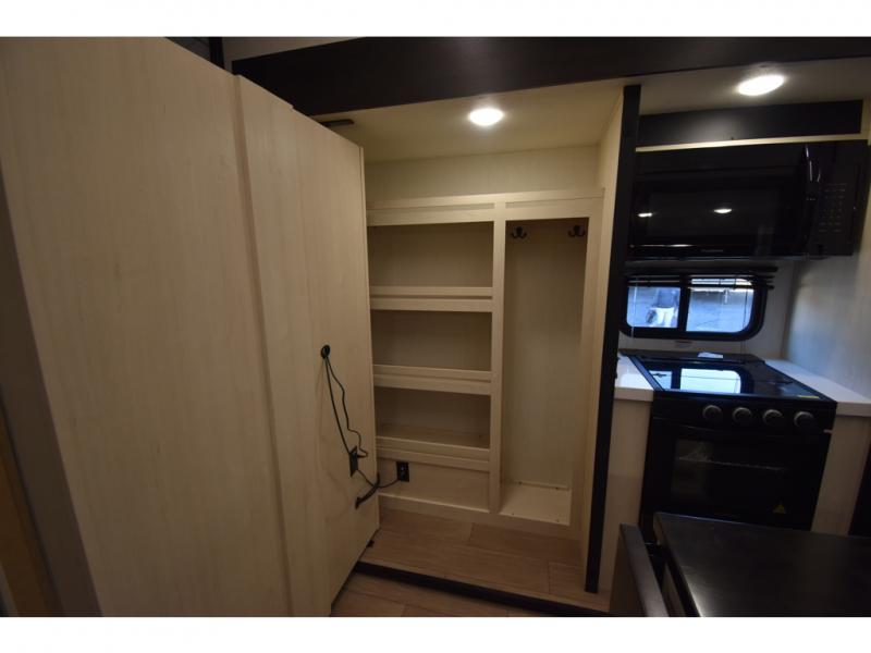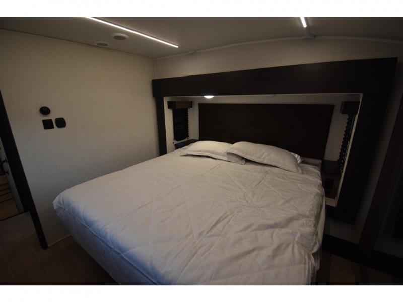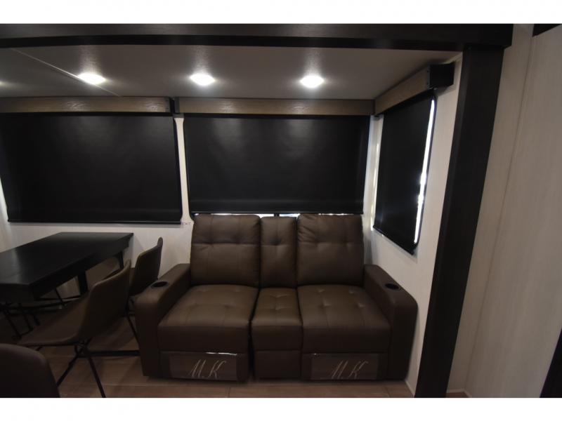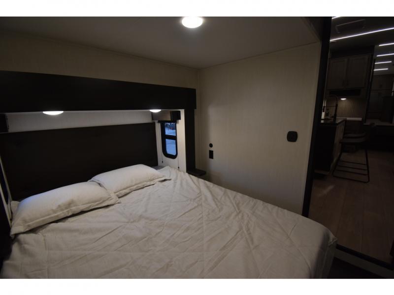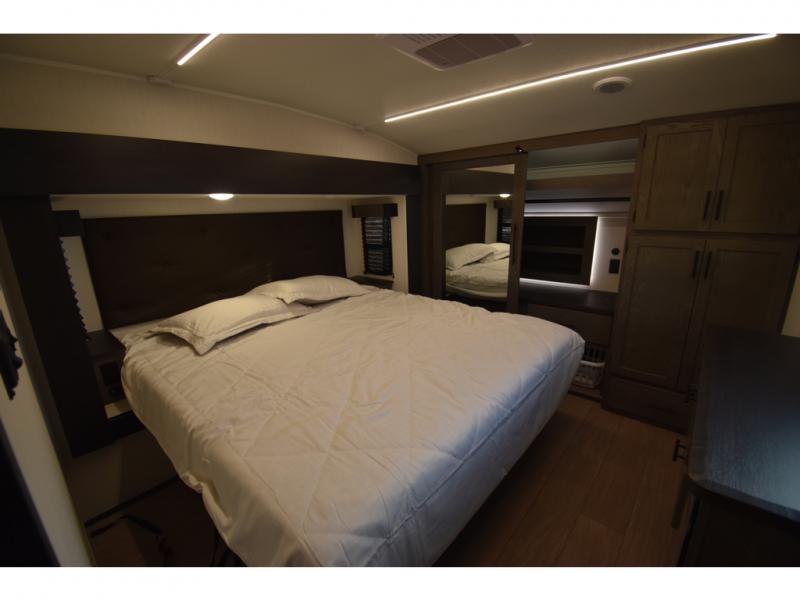 This quad-slide layout is set up for long stays and easy routines. The kitchen centers around a beautiful kitchen island for prep, the free-standing range is perfect for making full-size meals, and clean-up is a breeze with the built-in dishwasher. Across the living/kitchen zone you’ll find seating oriented to the entertainment wall and an LED TV, so movie nights don’t fight the cook space. Up front, the suite’s king bed slide faces a bedroom fireplace, with deep hanging space and drawers to keep wardrobes organized. Outside, the dual entry design improves campsite flow, and the triple-awning coverage stretches usable patio space. There is also more space for kids or guests in the upper loft!