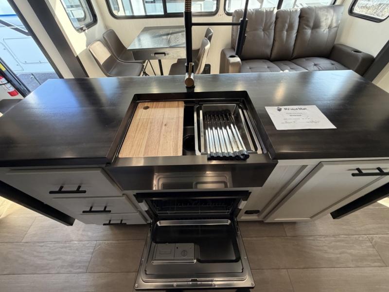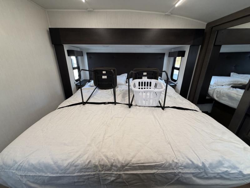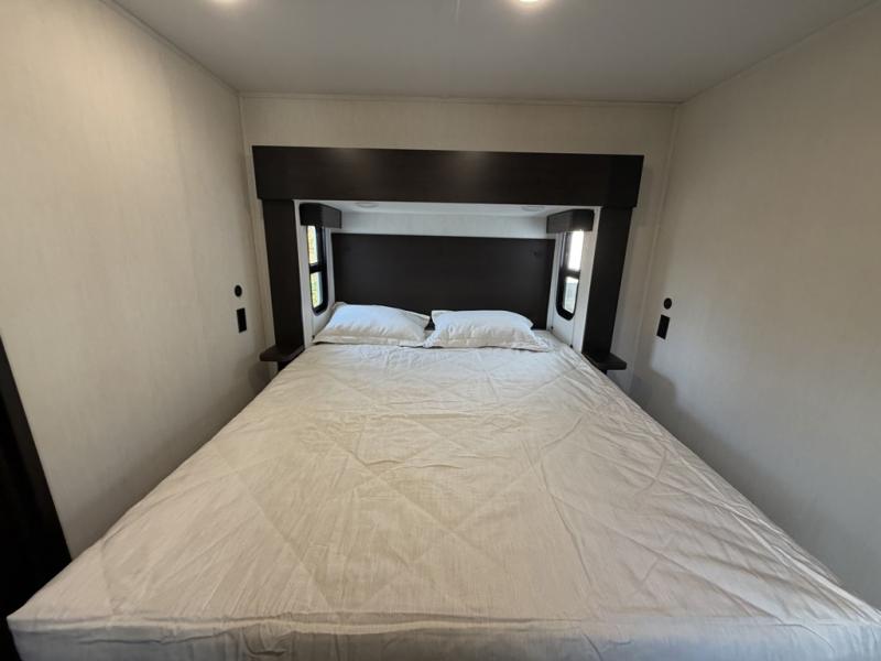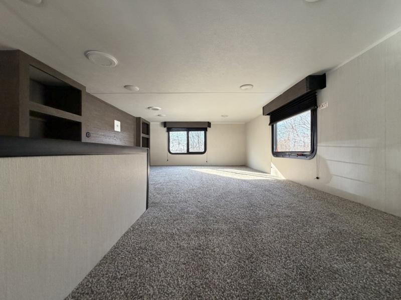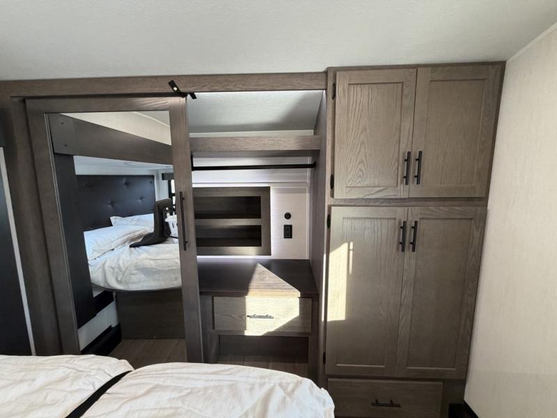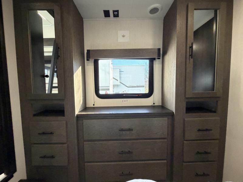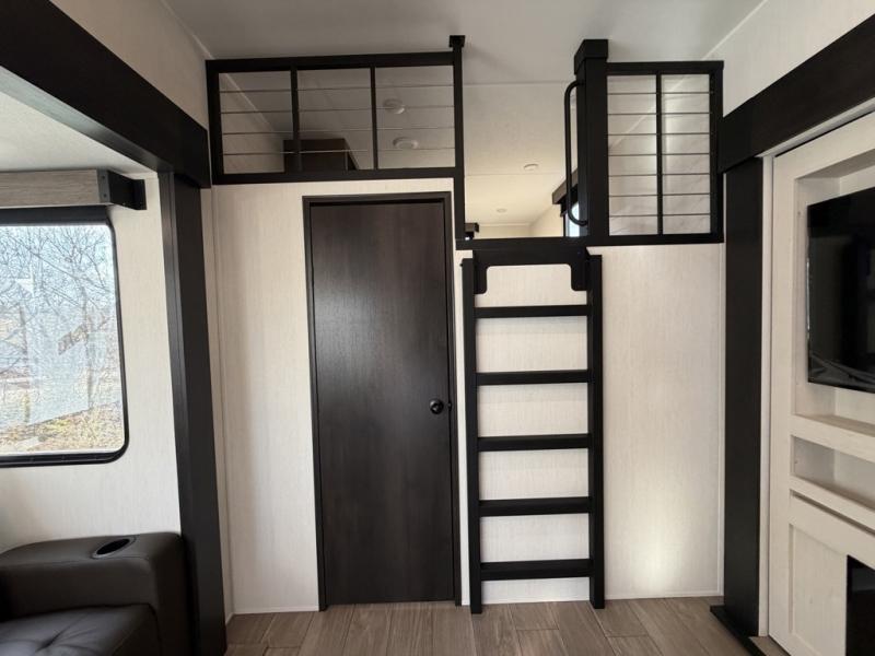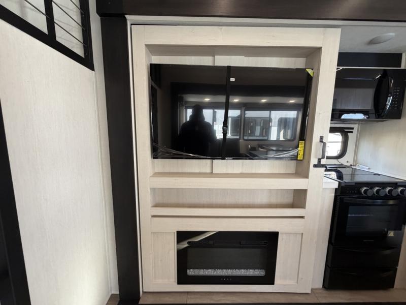 This quad-slide layout is set up for long stays and easy routines. The kitchen centers around a beautiful kitchen island for prep, the free-standing range is perfect for making full-size meals, and clean-up is a breeze with the built-in dishwasher. Across the living/kitchen zone you’ll find seating oriented to the entertainment wall and an LED TV, so movie nights don’t fight the cook space. Up front, the suite’s king bed slide faces a bedroom fireplace, with deep hanging space and drawers to keep wardrobes organized. Outside, the dual entry design improves campsite flow, and the triple-awning coverage stretches usable patio space. There is also more space for kids or guests in the upper loft!