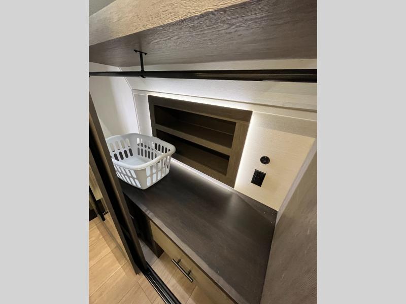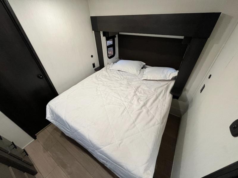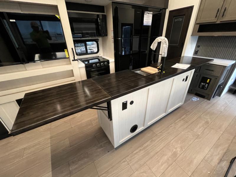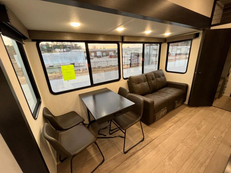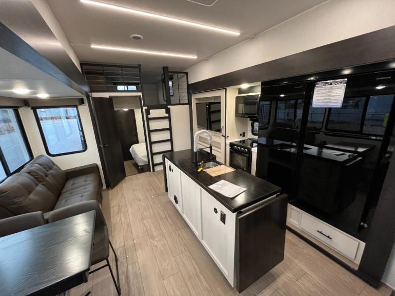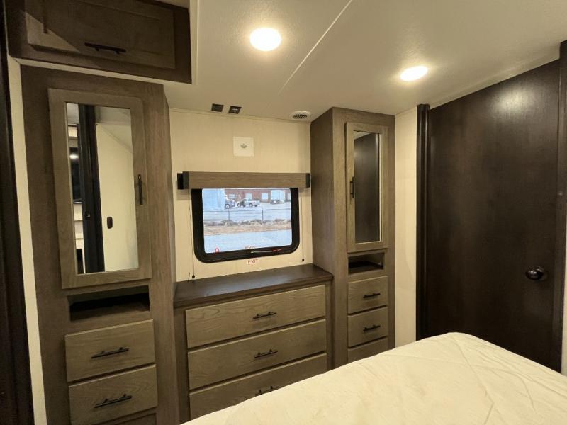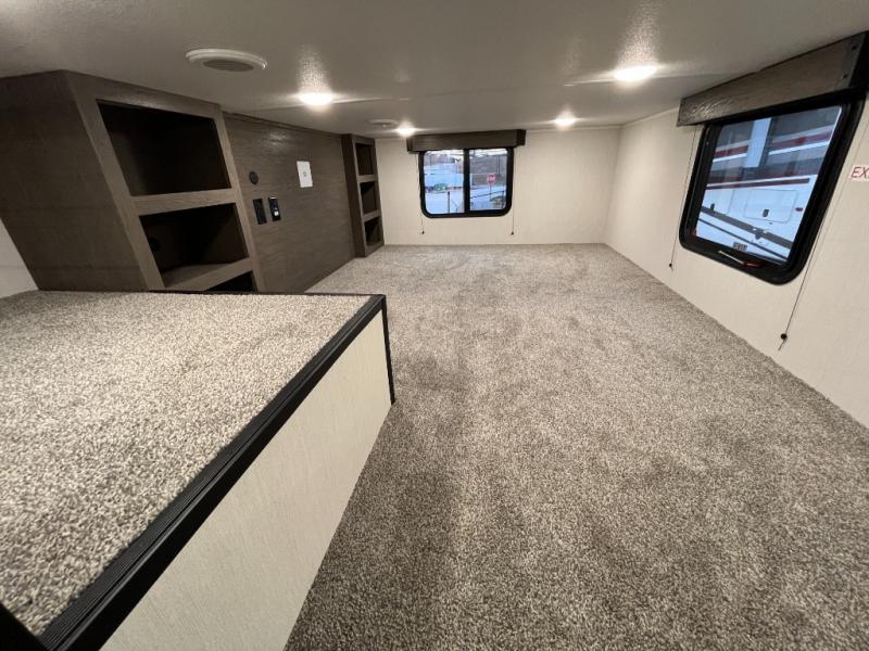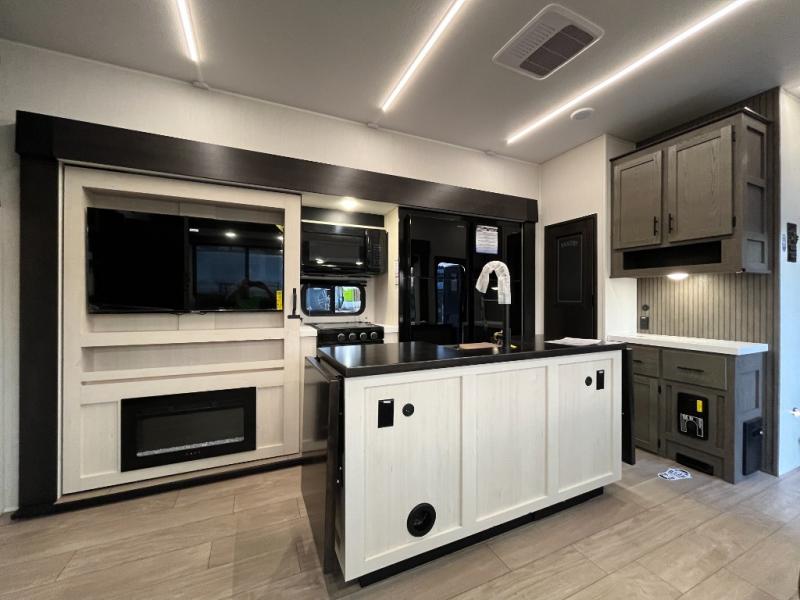 This quad-slide layout is set up for long stays and easy routines. The kitchen centers around a beautiful kitchen island for prep, the free-standing range is perfect for making full-size meals, and clean-up is a breeze with the built-in dishwasher. Across the living/kitchen zone you’ll find seating oriented to the entertainment wall and an LED TV, so movie nights don’t fight the cook space. Up front, the suite’s king bed slide faces a bedroom fireplace, with deep hanging space and drawers to keep wardrobes organized. Outside, the dual entry design improves campsite flow, and the triple-awning coverage stretches usable patio space. There is also more space for kids or guests in the upper loft!