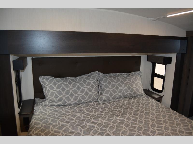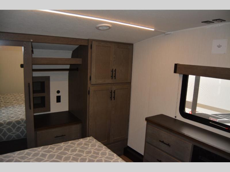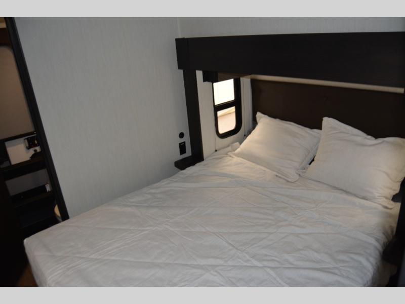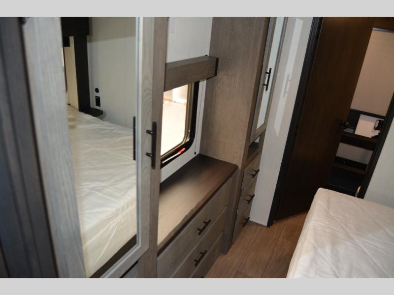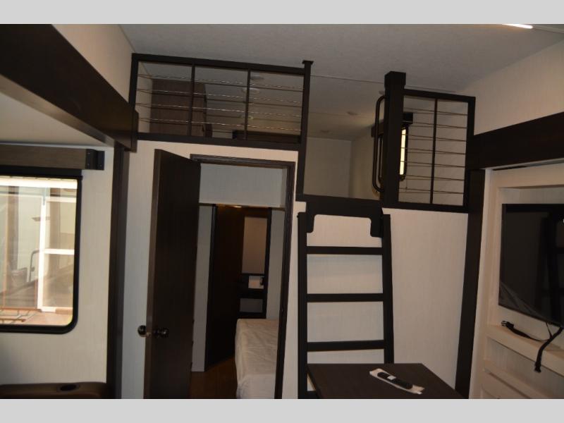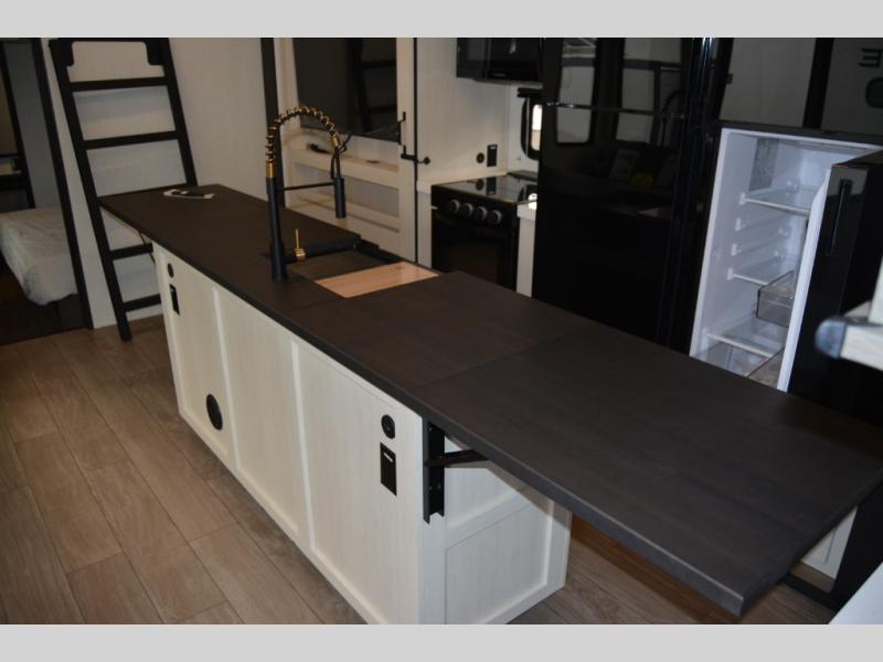 This quad-slide layout is set up for long stays and easy routines. The kitchen centers around a beautiful kitchen island for prep, the free-standing range is perfect for making full-size meals, and clean-up is a breeze with the built-in dishwasher. Across the living/kitchen zone you’ll find seating oriented to the entertainment wall and an LED TV, so movie nights don’t fight the cook space. Up front, the suite’s king bed slide faces a bedroom fireplace, with deep hanging space and drawers to keep wardrobes organized. Outside, the dual entry design improves campsite flow, and the triple-awning coverage stretches usable patio space. There is also more space for kids or guests in the upper loft!