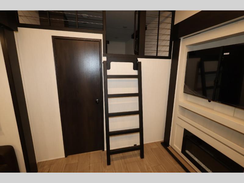 This quad-slide layout is set up for long stays and easy routines. The kitchen centers around a beautiful kitchen island for prep, the free-standing range is perfect for making full-size meals, and clean-up is a breeze with the built-in dishwasher. Across the living/kitchen zone you’ll find seating oriented to the entertainment wall and an LED TV, so movie nights don’t fight the cook space. Up front, the suite’s king bed slide faces a bedroom fireplace, with deep hanging space and drawers to keep wardrobes organized. Outside, the dual entry design improves campsite flow, and the triple-awning coverage stretches usable patio space. There is also more space for kids or guests in the upper loft!