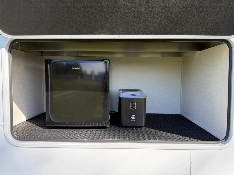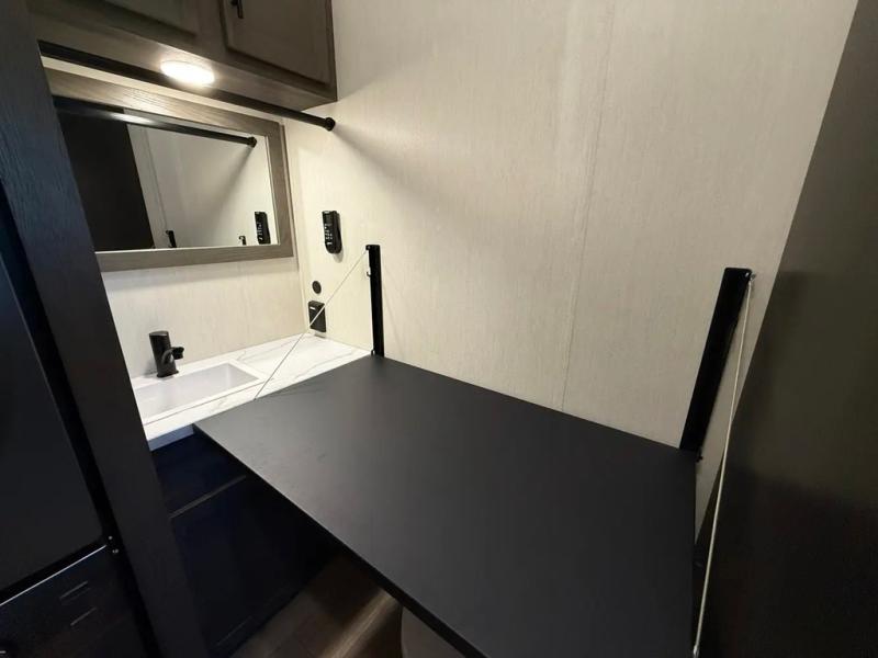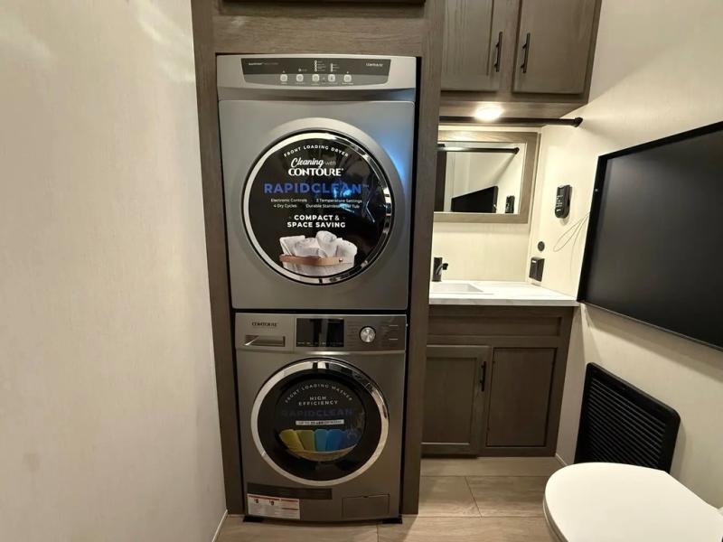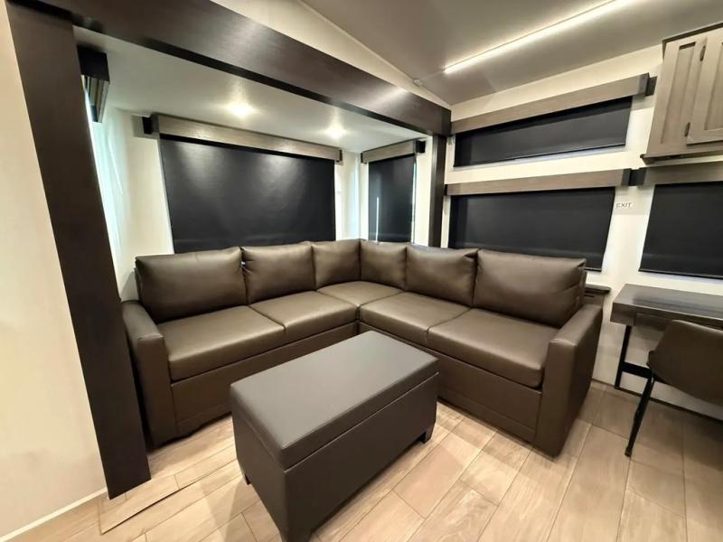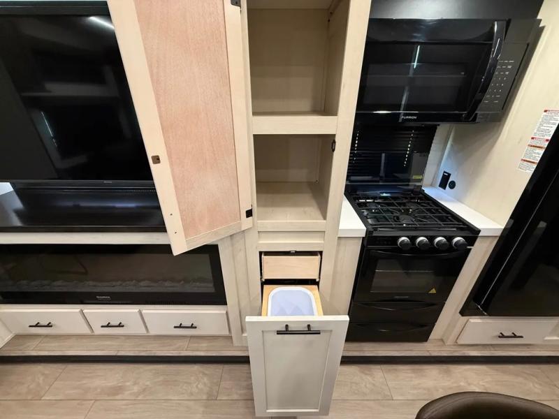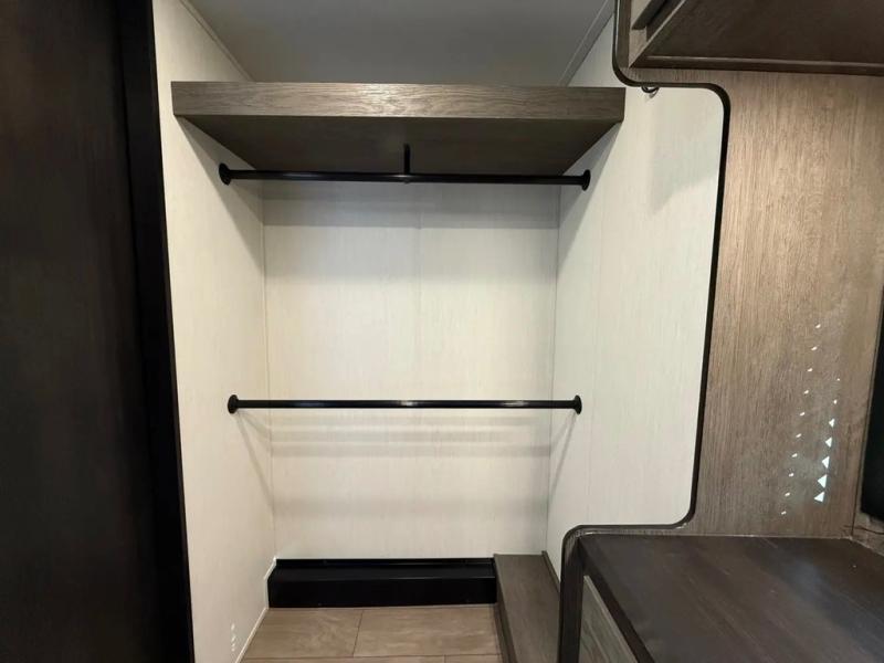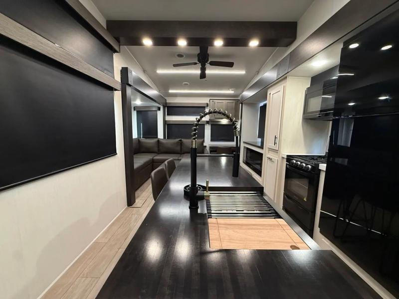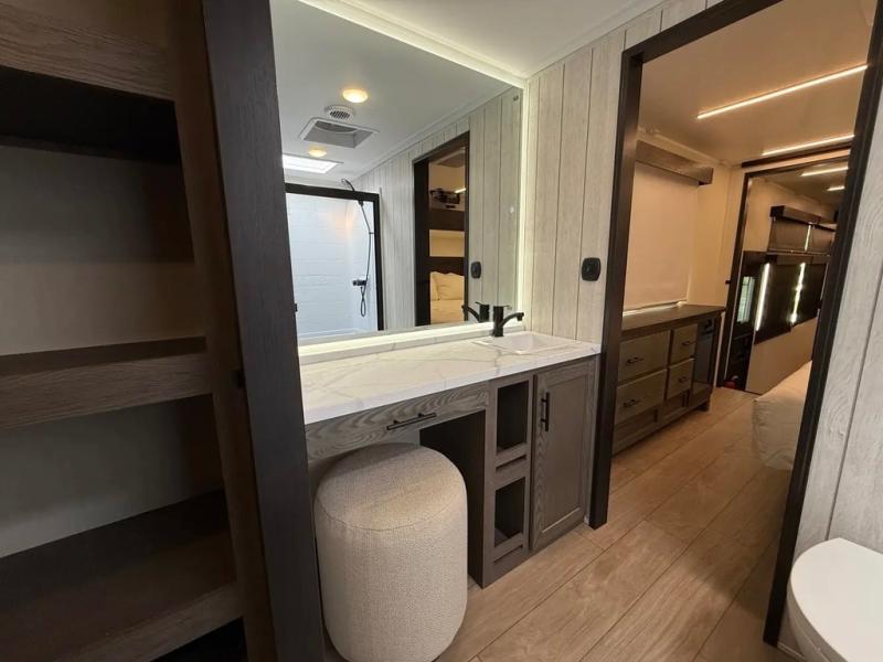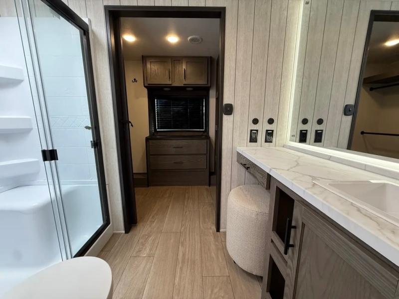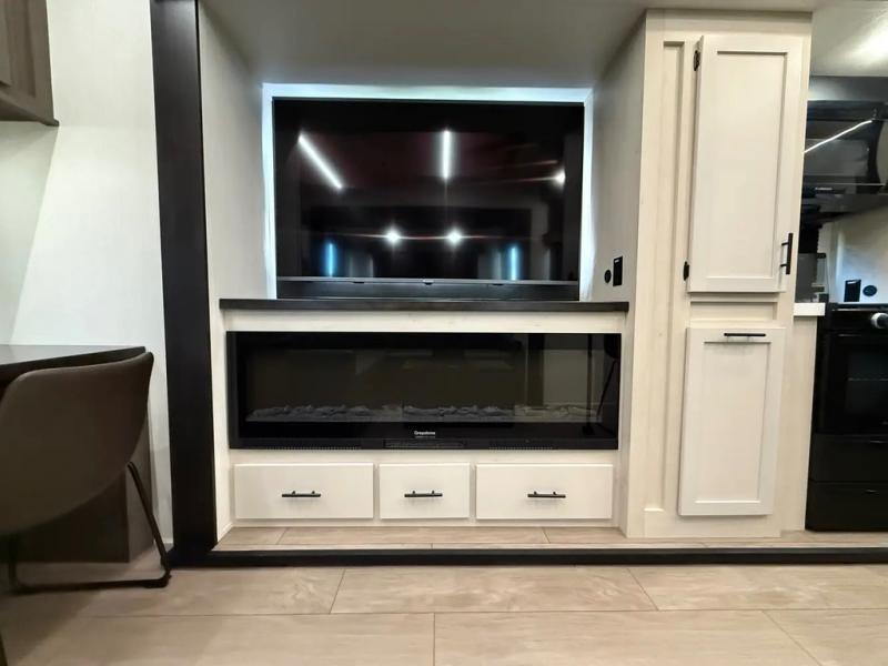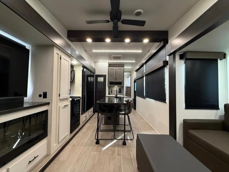 This thoughtfully arranged floorplan is built for extended stays and easy daily living. The rear lounge centers around an L-shaped sectional facing the entertainment wall and fireplace, with a nearby desk for work or hobbies. The kitchen’s island anchors a generous prep area, oversized pantry, and full cooking suite, so meals are simple whether you’re weekending or full-timing. Mid-coach, the guest half bath is convenient for all. Up front, the private bedroom’s king bed slide connects to a spa-style bath with large shower and dressing space, plus a substantial wardrobe to keep clutter out of sight. Outside, enjoy the campsite under dual power awnings that stretch along the patio side.