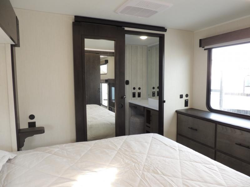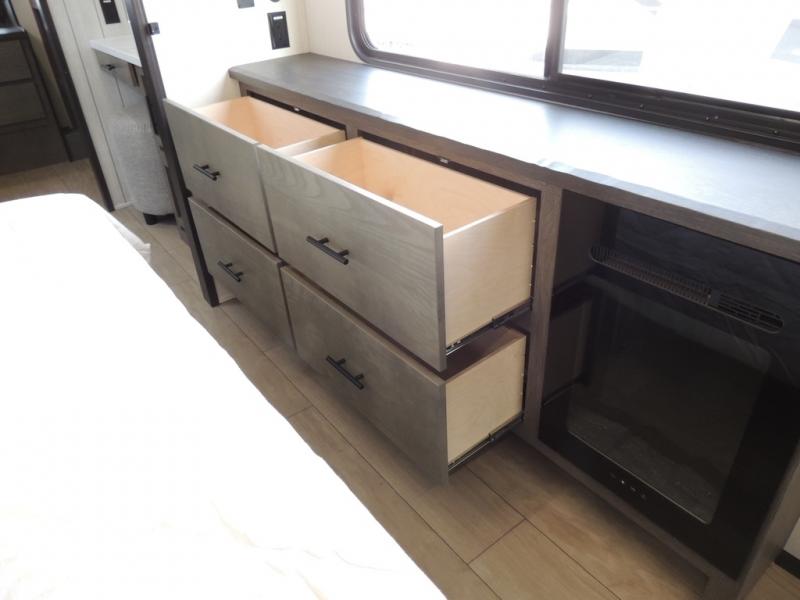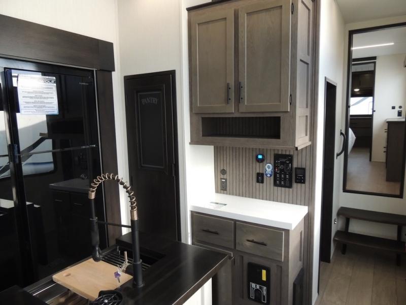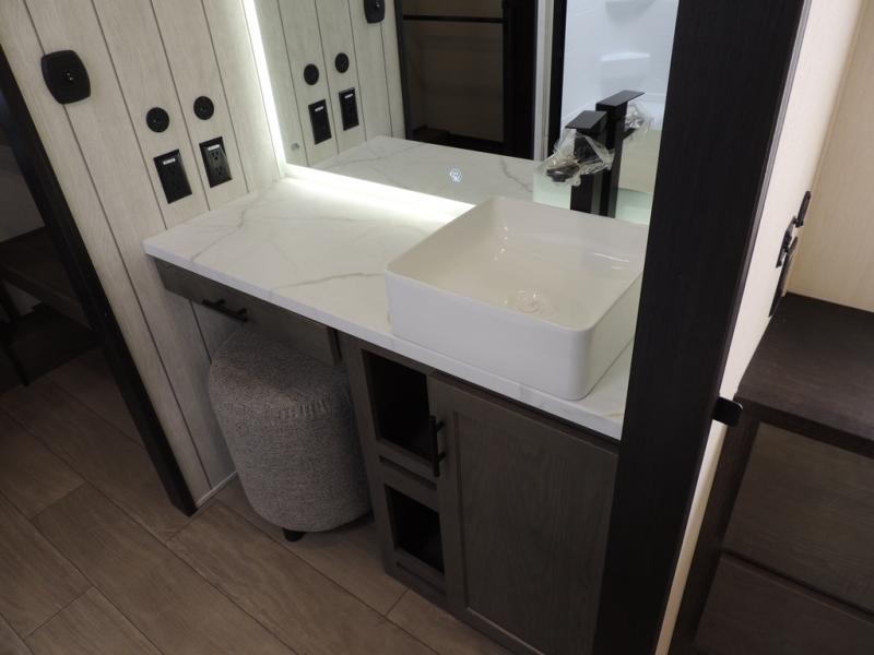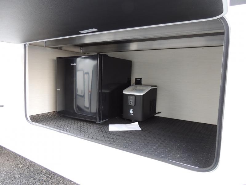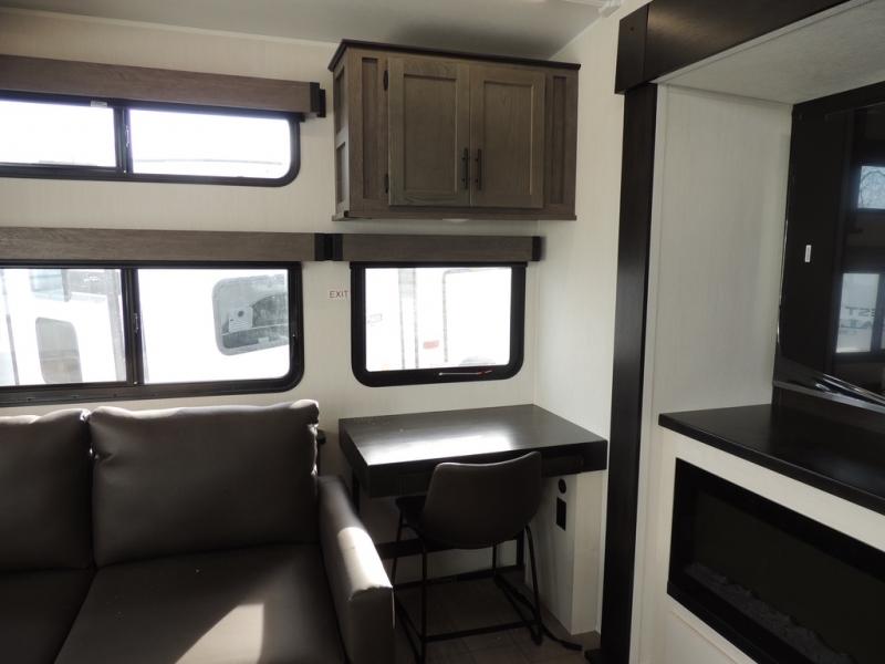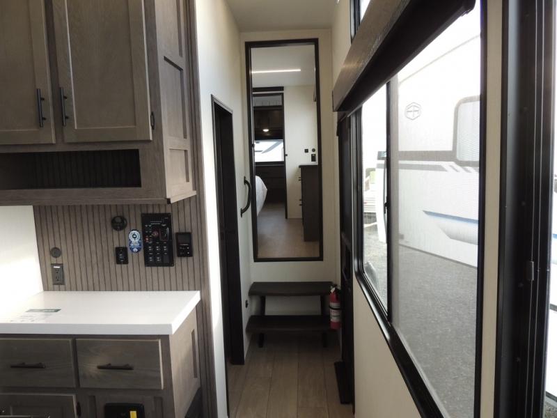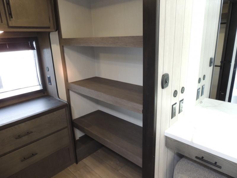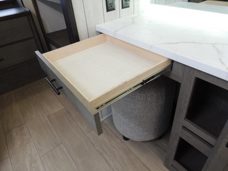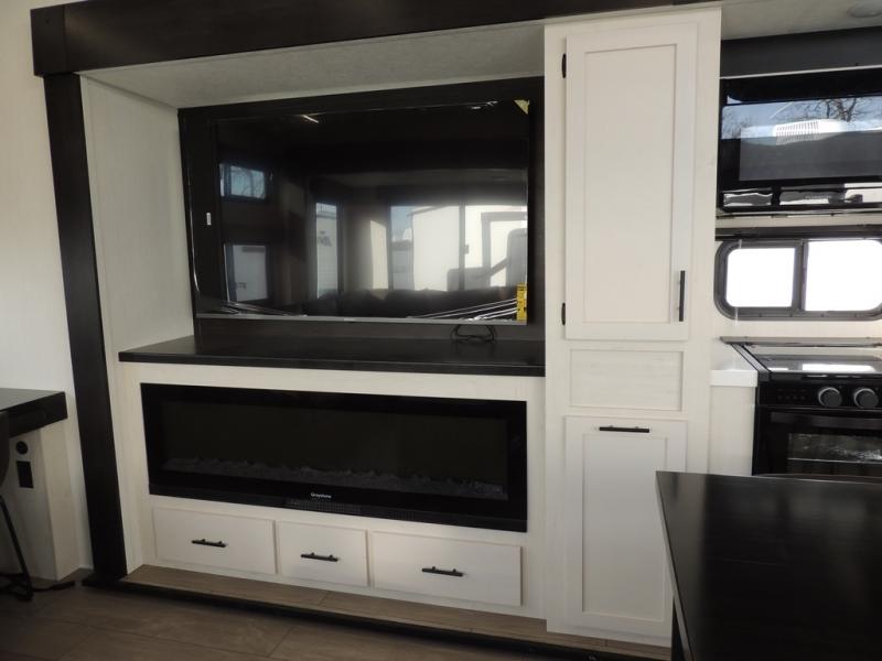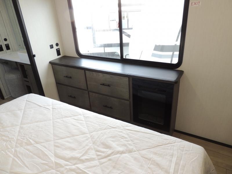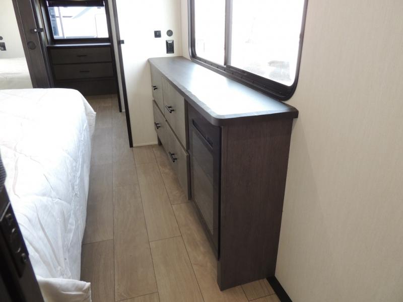This thoughtfully arranged floorplan is built for extended stays and easy daily living. The rear lounge centers around an L-shaped sectional facing the entertainment wall and fireplace, with a nearby desk for work or hobbies. The kitchen’s island anchors a generous prep area, oversized pantry, and full cooking suite, so meals are simple whether you’re weekending or full-timing. Mid-coach, the guest half bath is convenient for all. Up front, the private bedroom’s king bed slide connects to a spa-style bath with large shower and dressing space, plus a substantial wardrobe to keep clutter out of sight. Outside, enjoy the campsite under dual power awnings that stretch along the patio side.