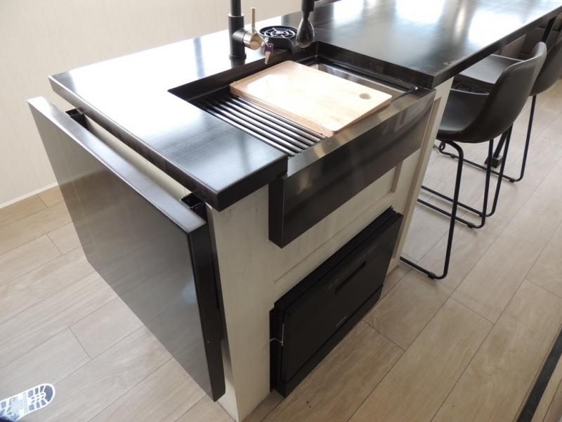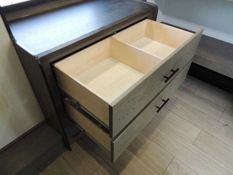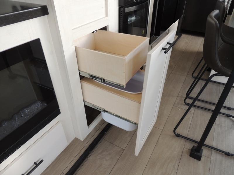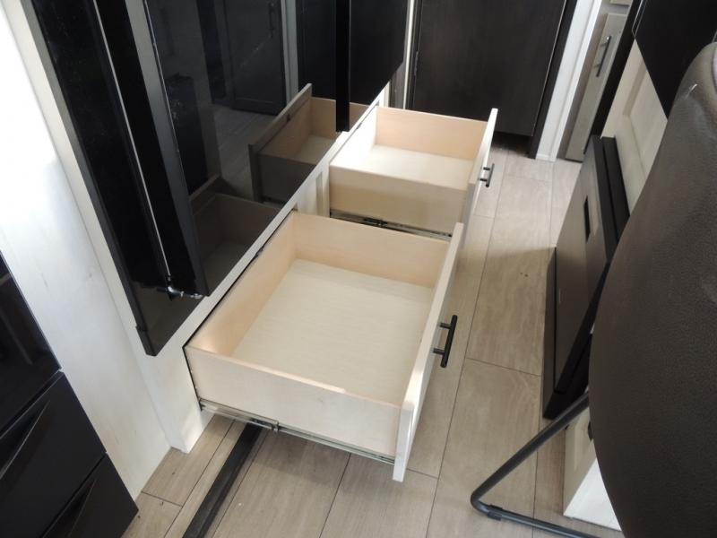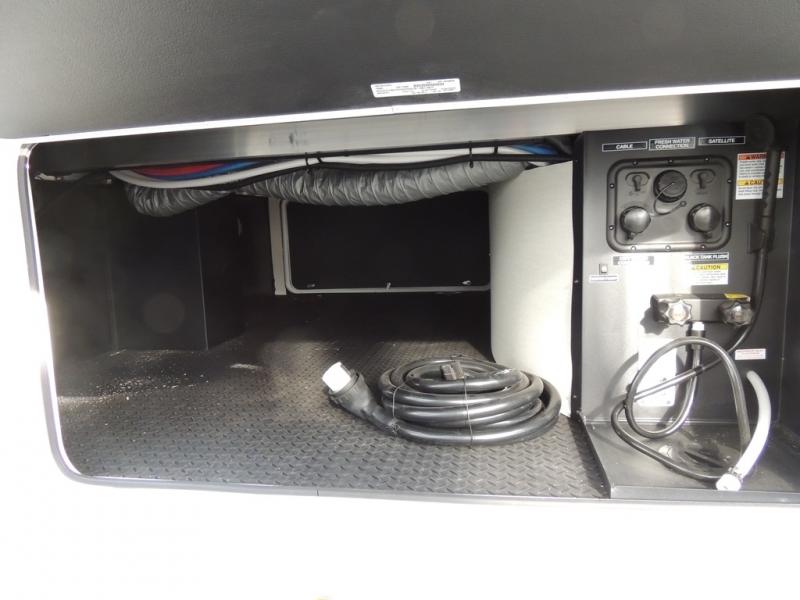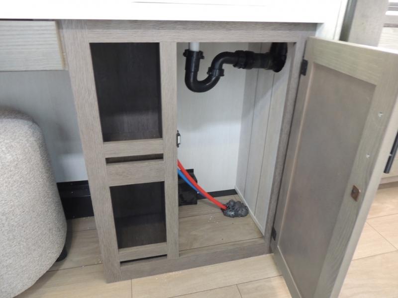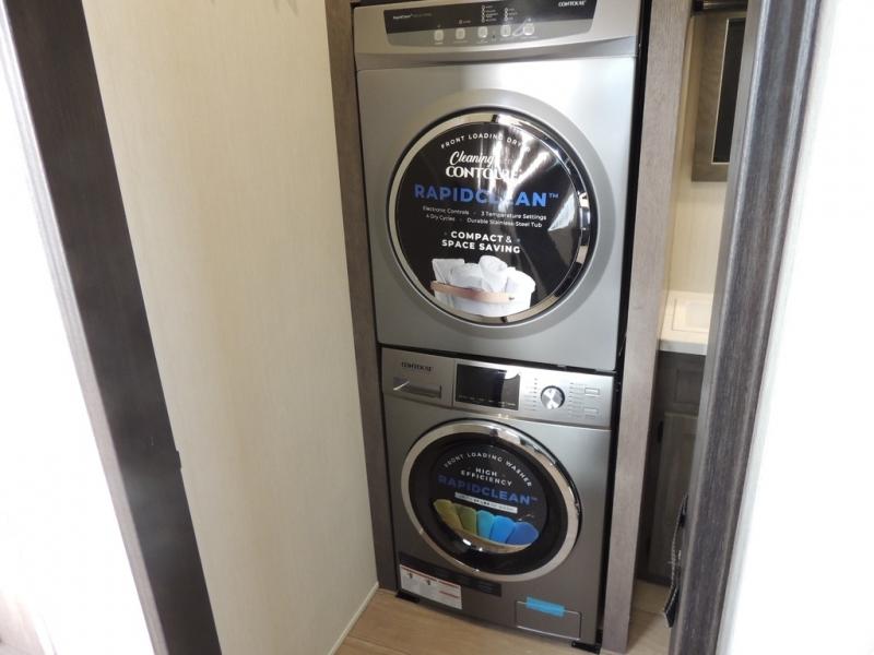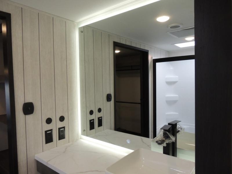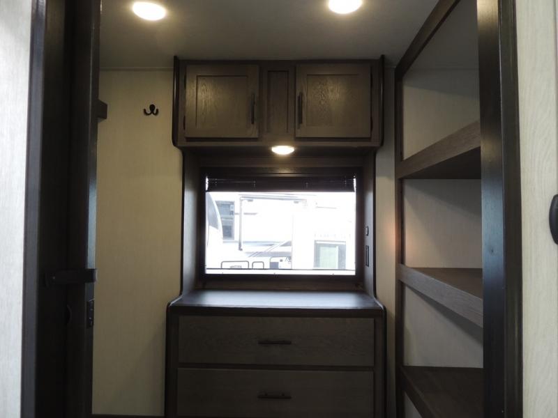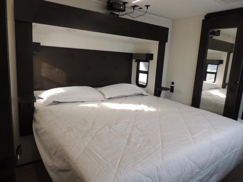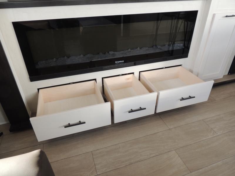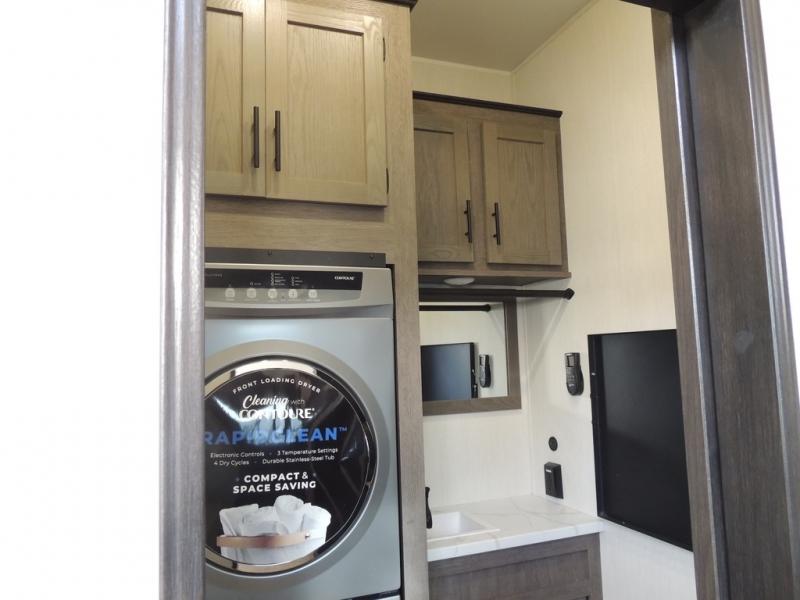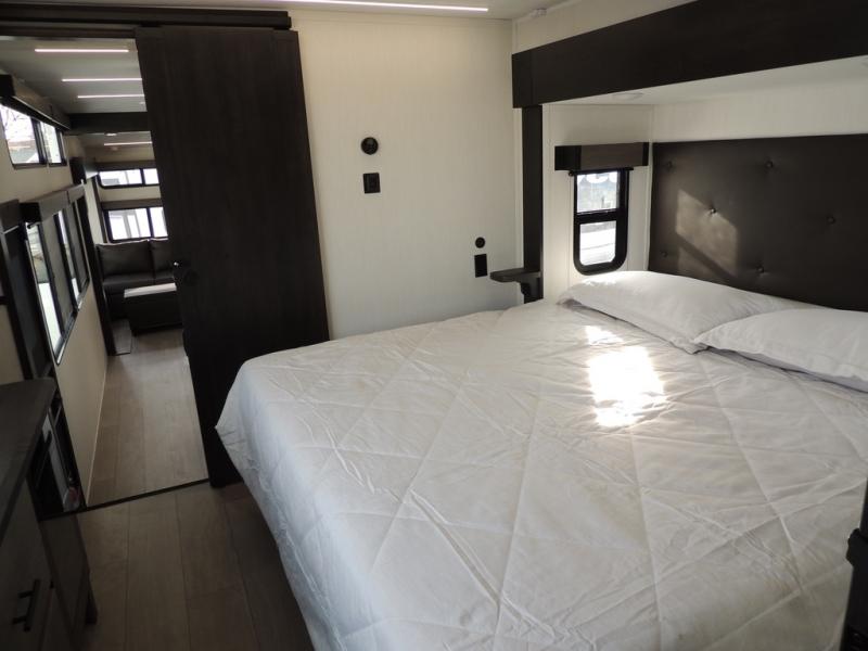 This thoughtfully arranged floorplan is built for extended stays and easy daily living. The rear lounge centers around an L-shaped sectional facing the entertainment wall and fireplace, with a nearby desk for work or hobbies. The kitchen’s island anchors a generous prep area, oversized pantry, and full cooking suite, so meals are simple whether you’re weekending or full-timing. Mid-coach, the guest half bath is convenient for all. Up front, the private bedroom’s king bed slide connects to a spa-style bath with large shower and dressing space, plus a substantial wardrobe to keep clutter out of sight. Outside, enjoy the campsite under dual power awnings that stretch along the patio side.