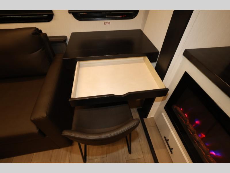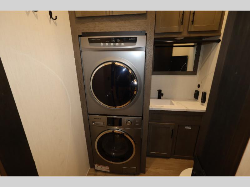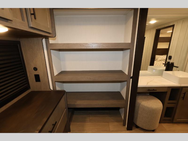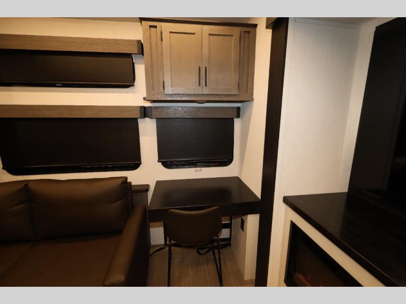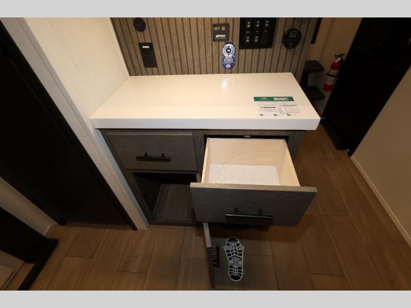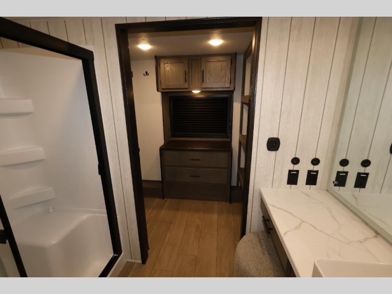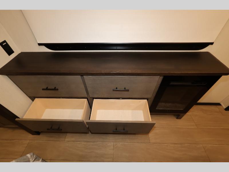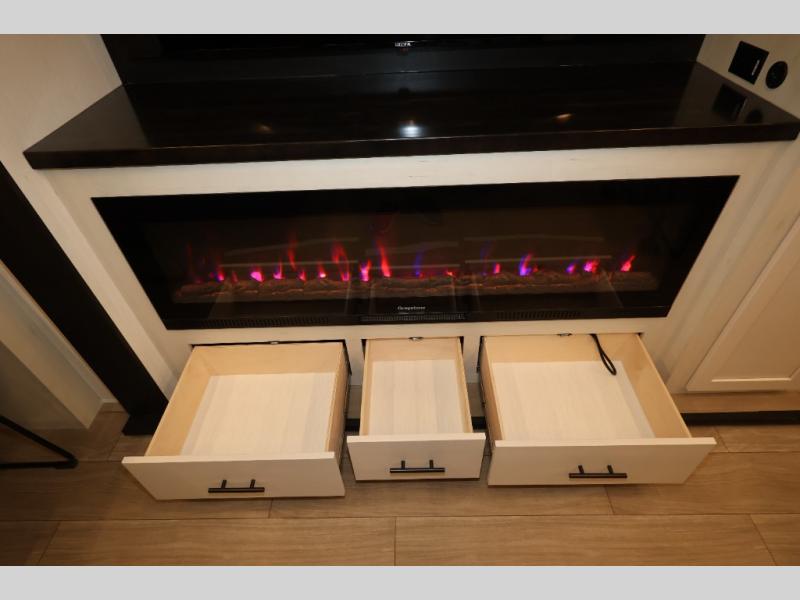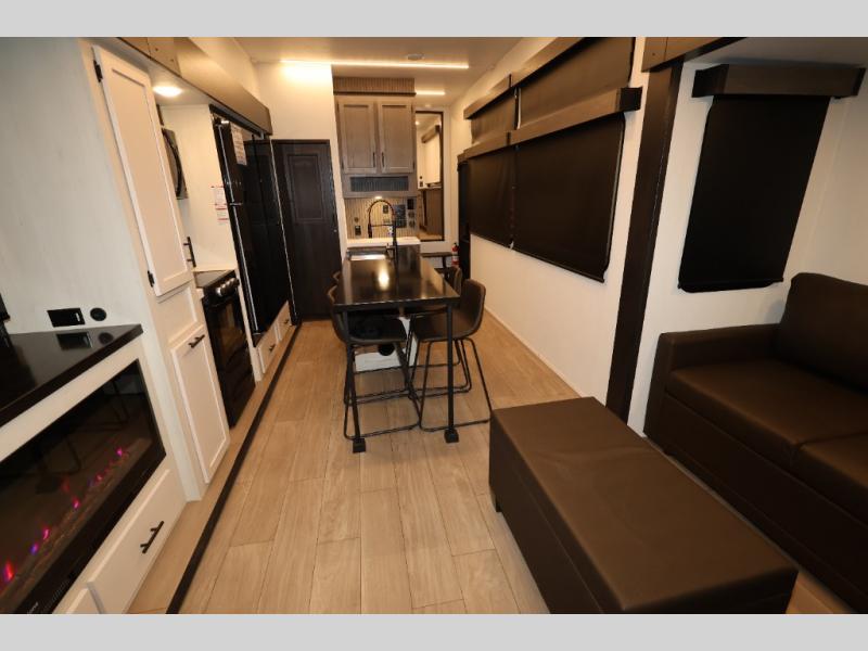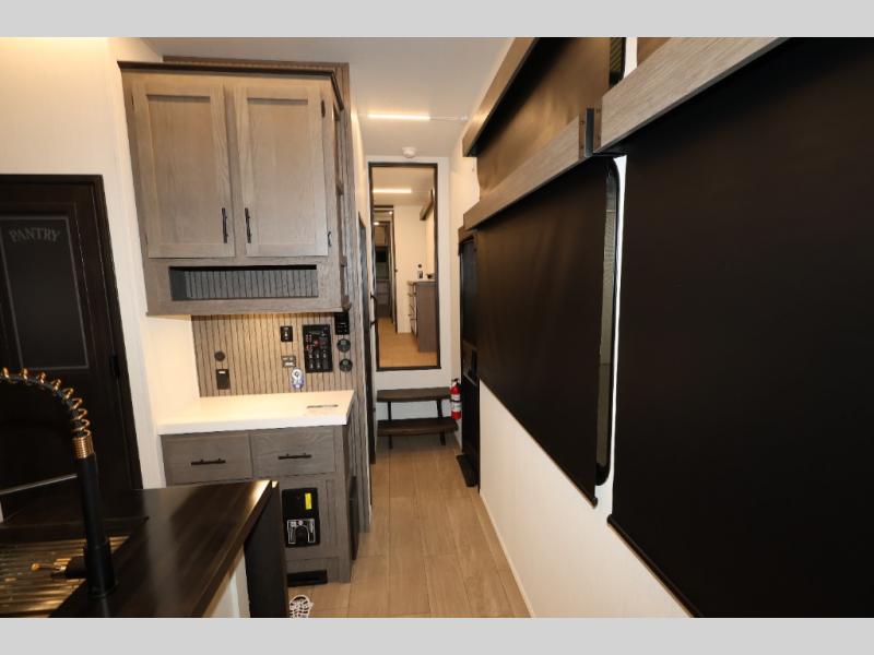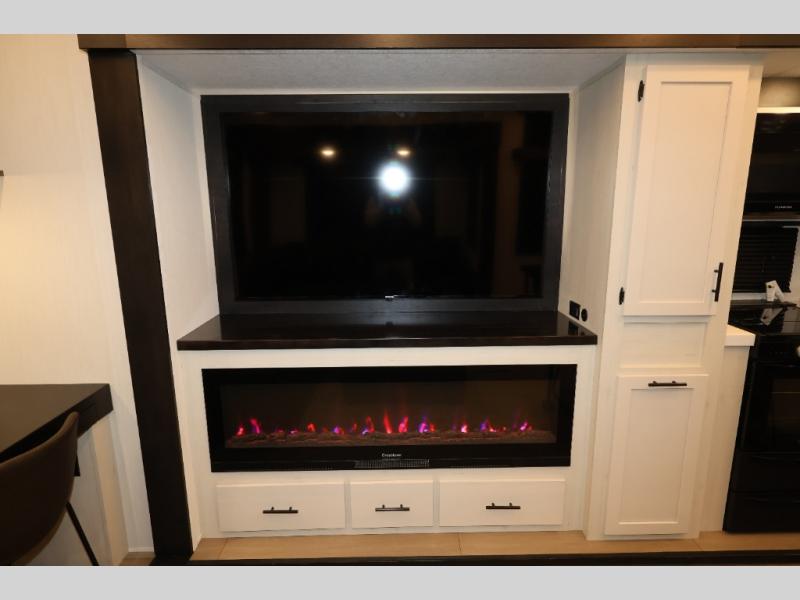 This thoughtfully arranged floorplan is built for extended stays and easy daily living. The rear lounge centers around an L-shaped sectional facing the entertainment wall and fireplace, with a nearby desk for work or hobbies. The kitchen’s island anchors a generous prep area, oversized pantry, and full cooking suite, so meals are simple whether you’re weekending or full-timing. Mid-coach, the guest half bath is convenient for all. Up front, the private bedroom’s king bed slide connects to a spa-style bath with large shower and dressing space, plus a substantial wardrobe to keep clutter out of sight. Outside, enjoy the campsite under dual power awnings that stretch along the patio side.