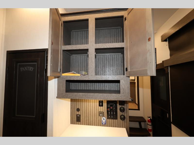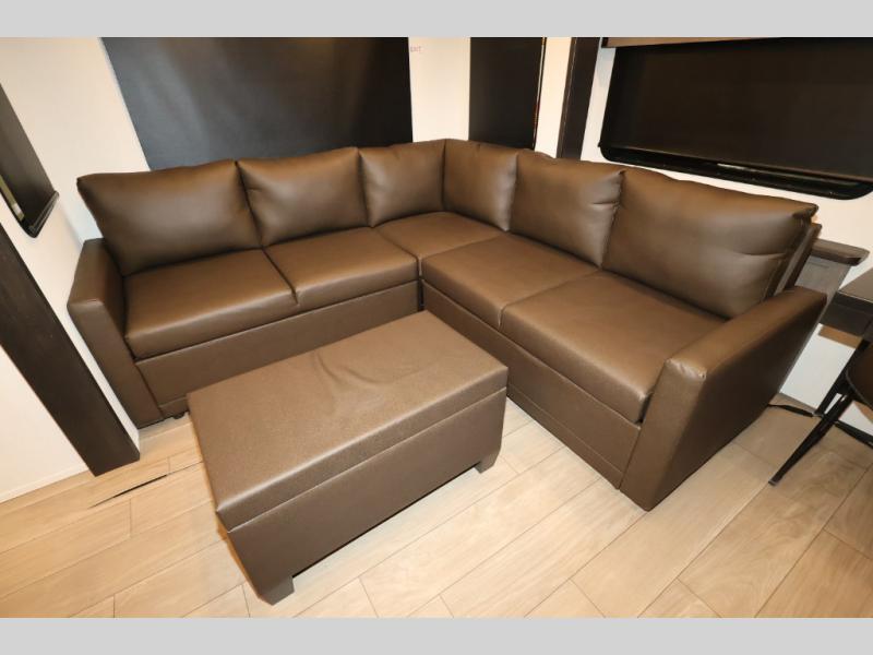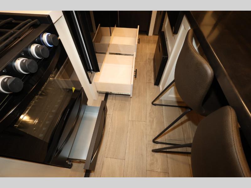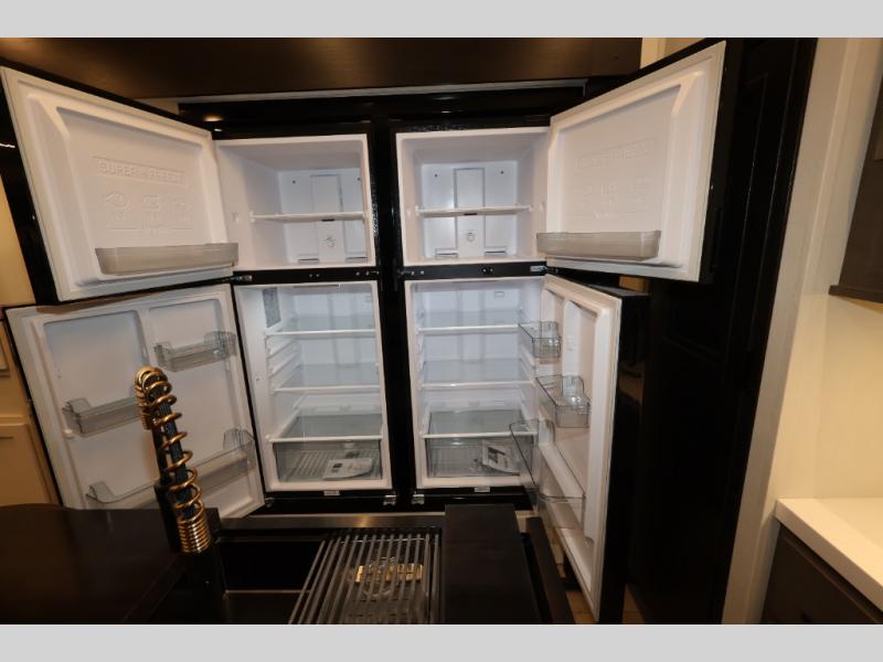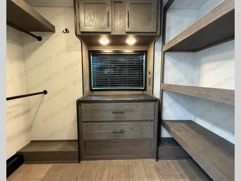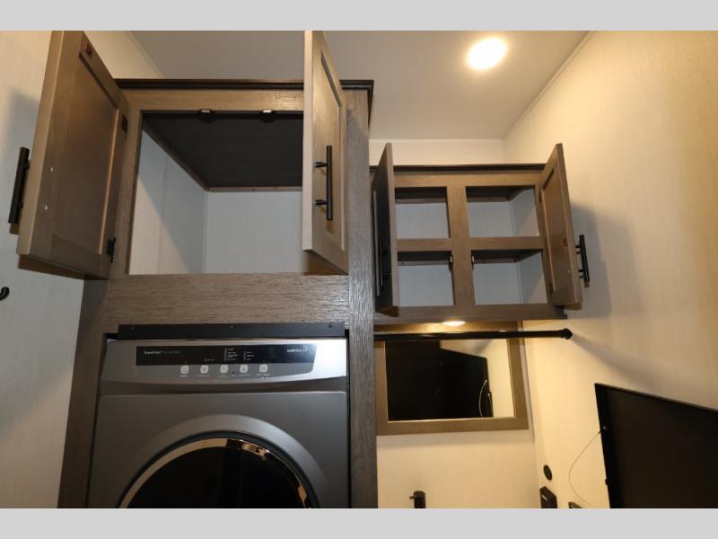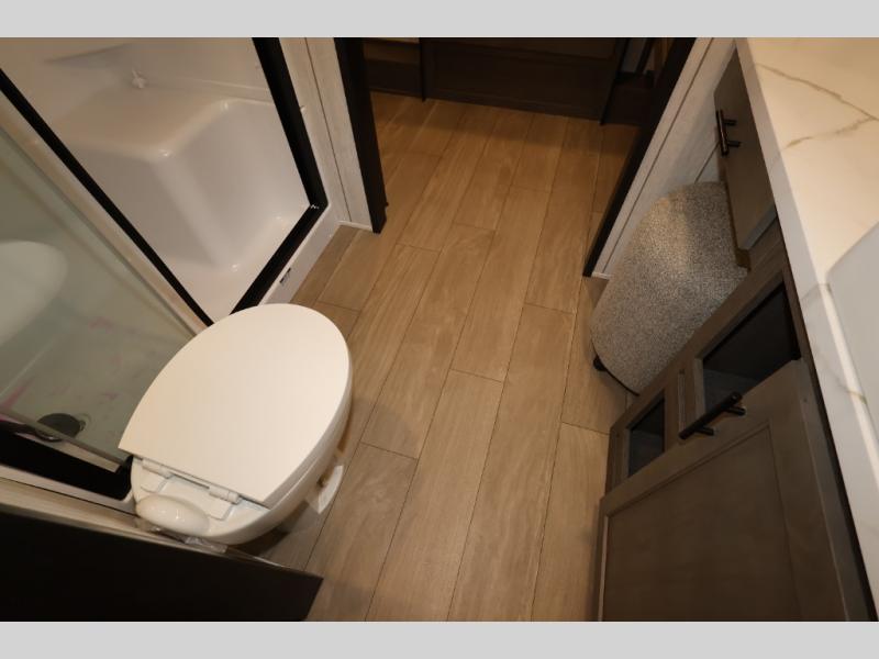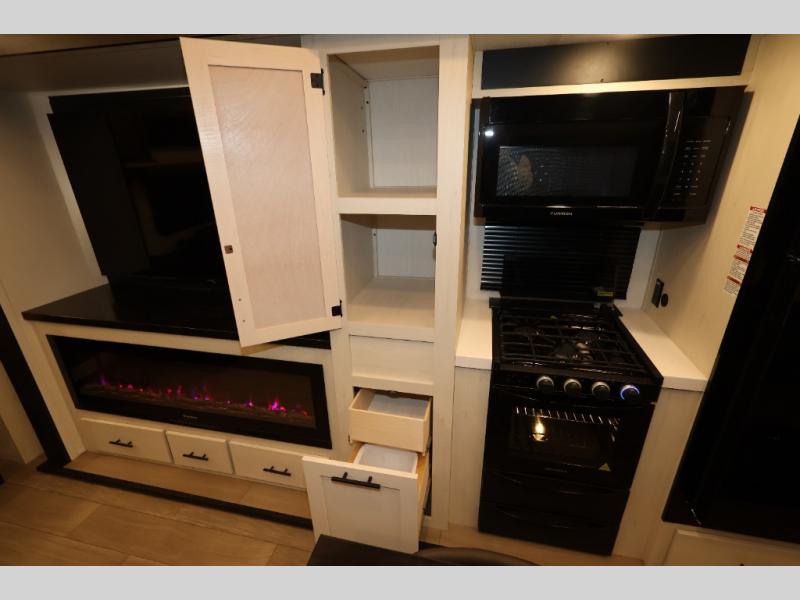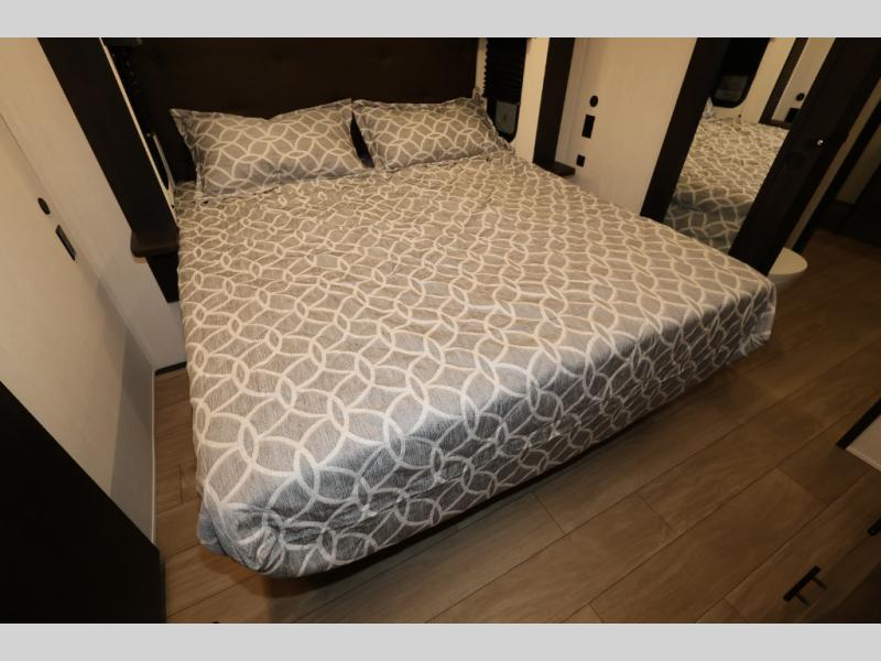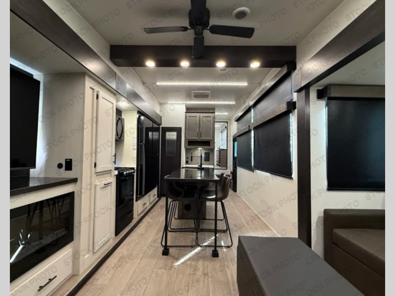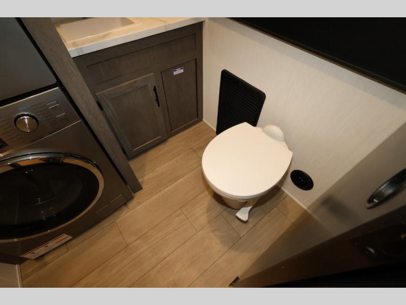 This thoughtfully arranged floorplan is built for extended stays and easy daily living. The rear lounge centers around an L-shaped sectional facing the entertainment wall and fireplace, with a nearby desk for work or hobbies. The kitchen’s island anchors a generous prep area, oversized pantry, and full cooking suite, so meals are simple whether you’re weekending or full-timing. Mid-coach, the guest half bath is convenient for all. Up front, the private bedroom’s king bed slide connects to a spa-style bath with large shower and dressing space, plus a substantial wardrobe to keep clutter out of sight. Outside, enjoy the campsite under dual power awnings that stretch along the patio side.