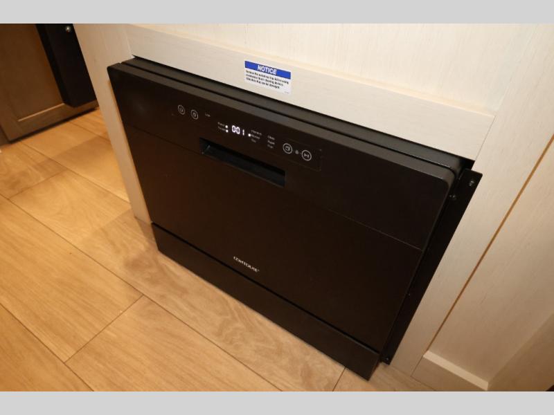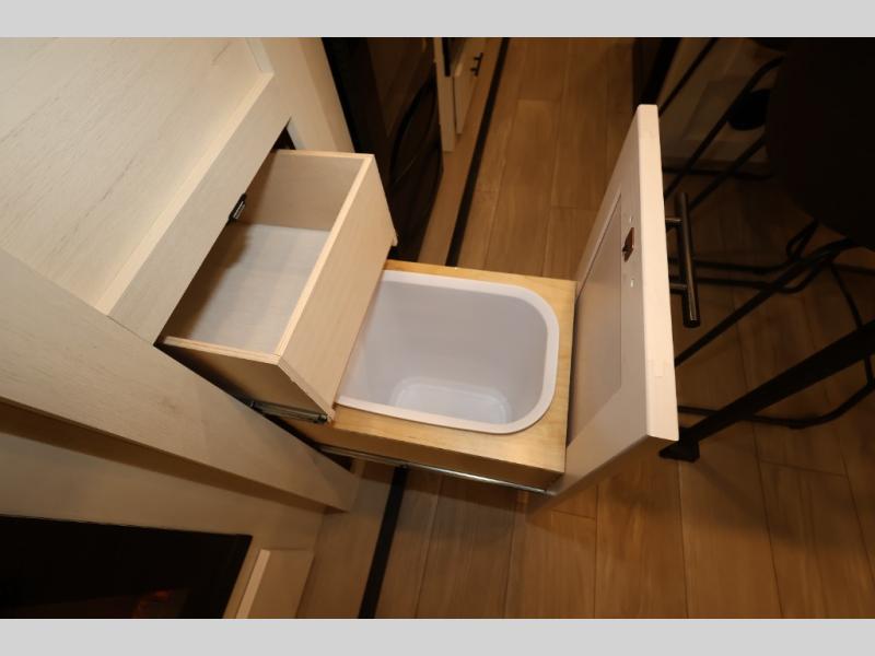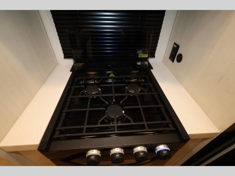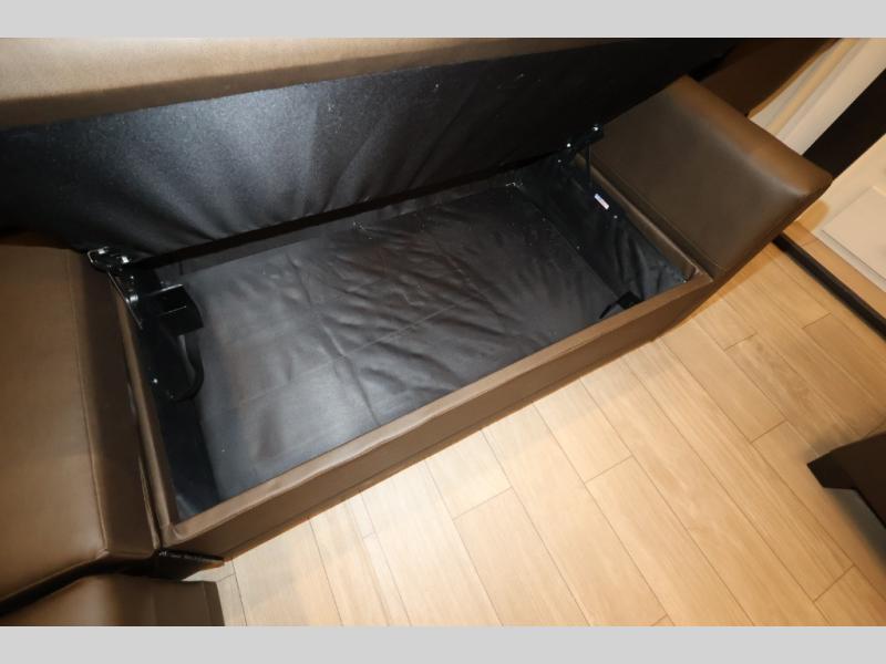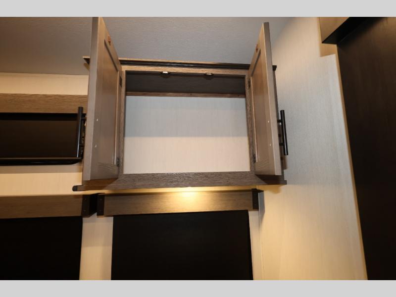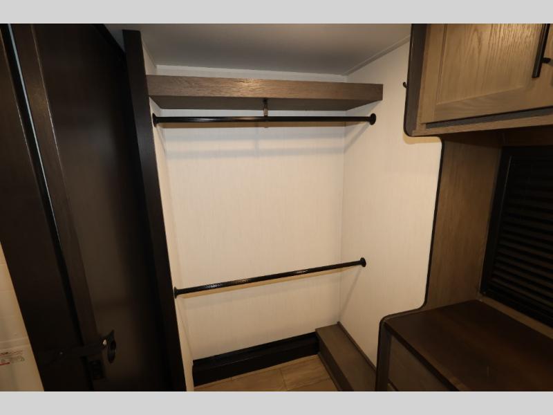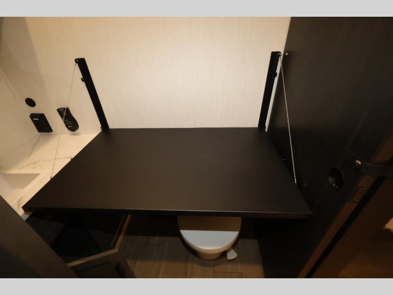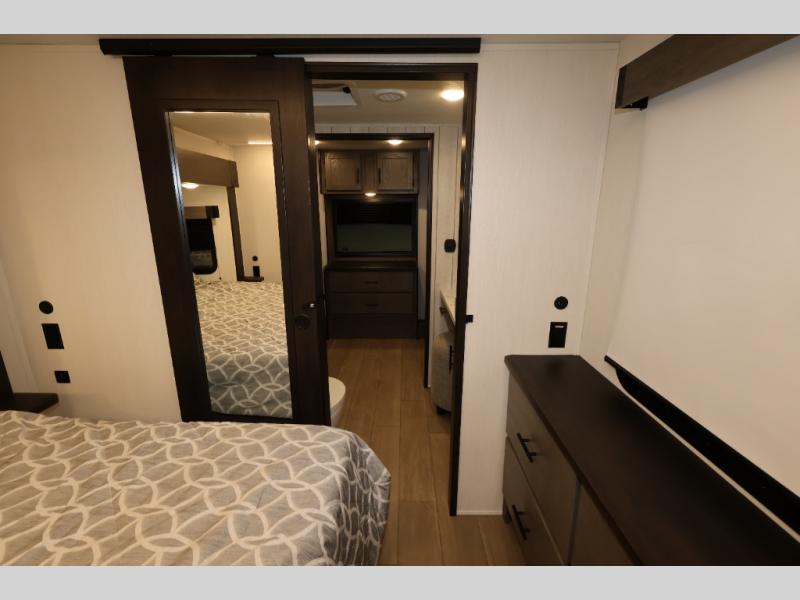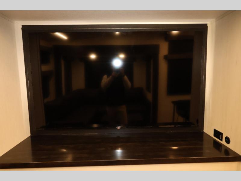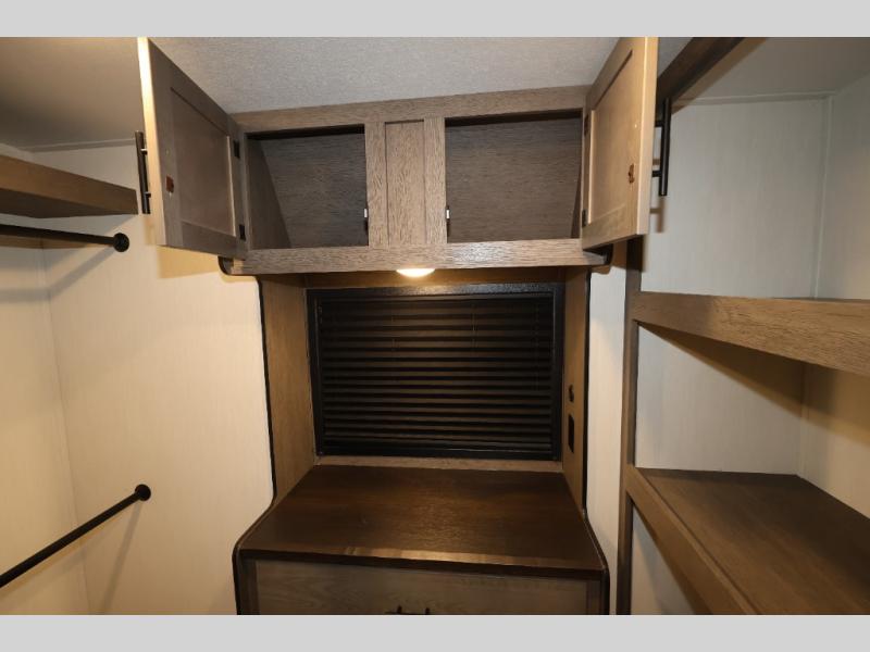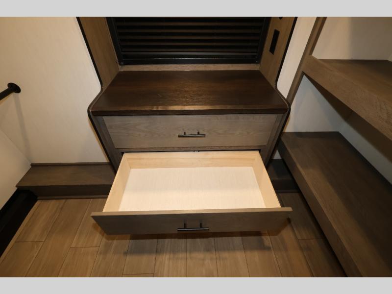 This thoughtfully arranged floorplan is built for extended stays and easy daily living. The rear lounge centers around an L-shaped sectional facing the entertainment wall and fireplace, with a nearby desk for work or hobbies. The kitchen’s island anchors a generous prep area, oversized pantry, and full cooking suite, so meals are simple whether you’re weekending or full-timing. Mid-coach, the guest half bath is convenient for all. Up front, the private bedroom’s king bed slide connects to a spa-style bath with large shower and dressing space, plus a substantial wardrobe to keep clutter out of sight. Outside, enjoy the campsite under dual power awnings that stretch along the patio side.