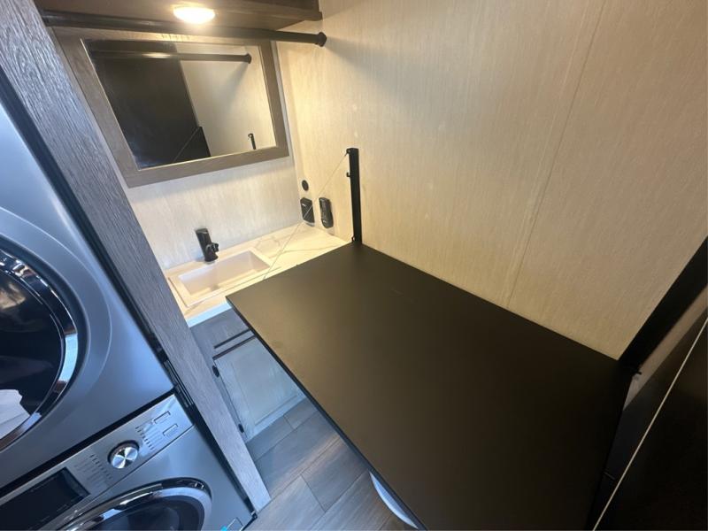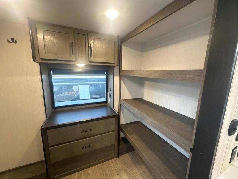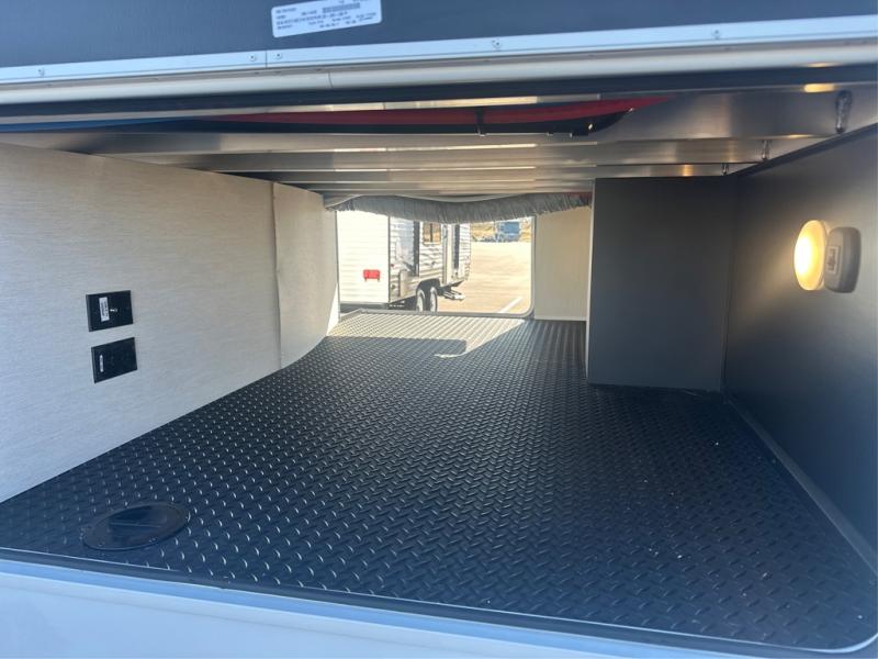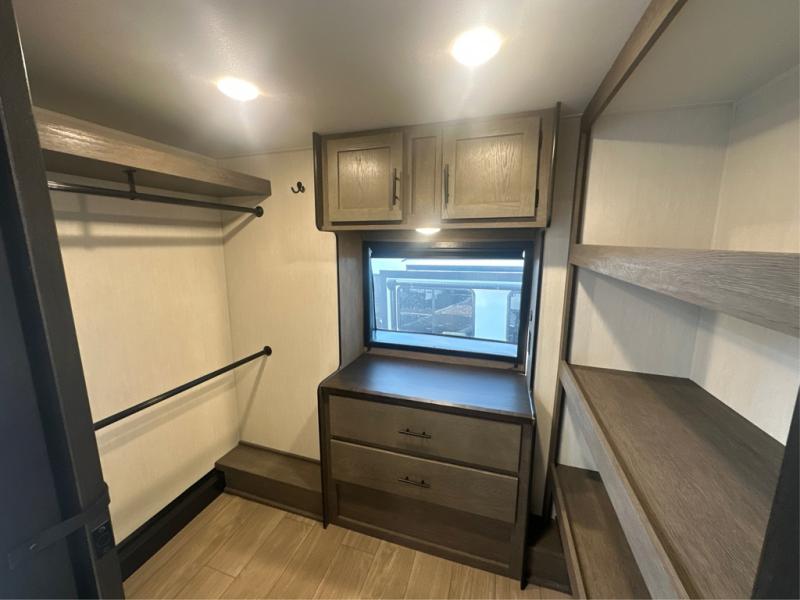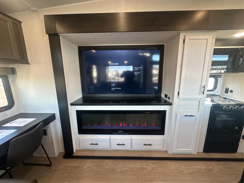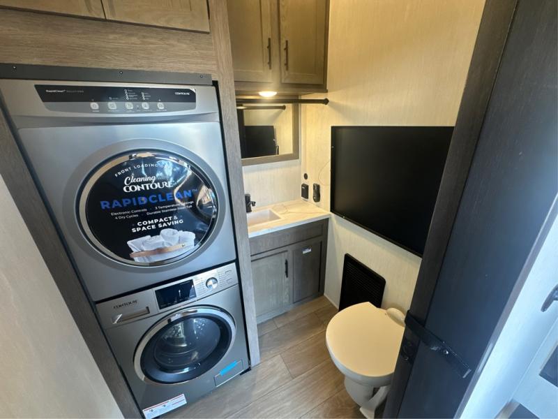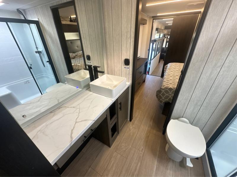 This thoughtfully arranged floorplan is built for extended stays and easy daily living. The rear lounge centers around an L-shaped sectional facing the entertainment wall and fireplace, with a nearby desk for work or hobbies. The kitchen’s island anchors a generous prep area, oversized pantry, and full cooking suite, so meals are simple whether you’re weekending or full-timing. Mid-coach, the guest half bath is convenient for all. Up front, the private bedroom’s king bed slide connects to a spa-style bath with large shower and dressing space, plus a substantial wardrobe to keep clutter out of sight. Outside, enjoy the campsite under dual power awnings that stretch along the patio side.