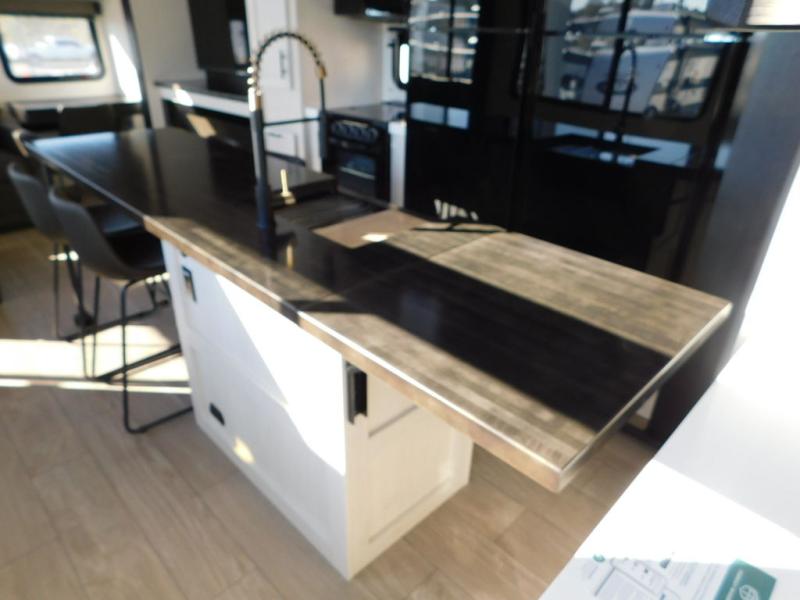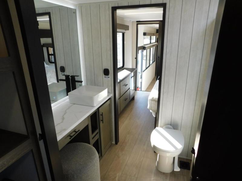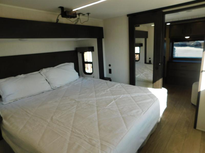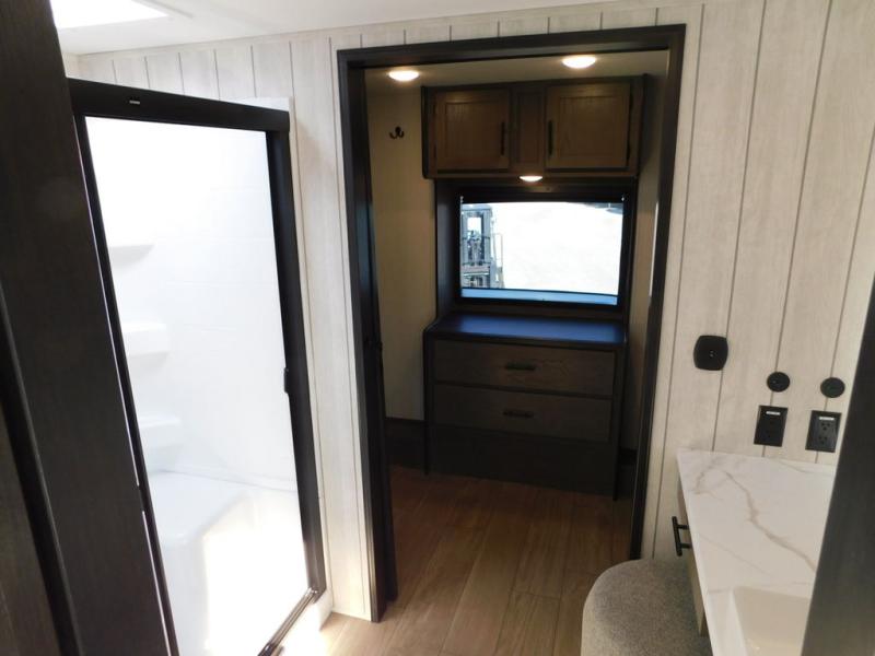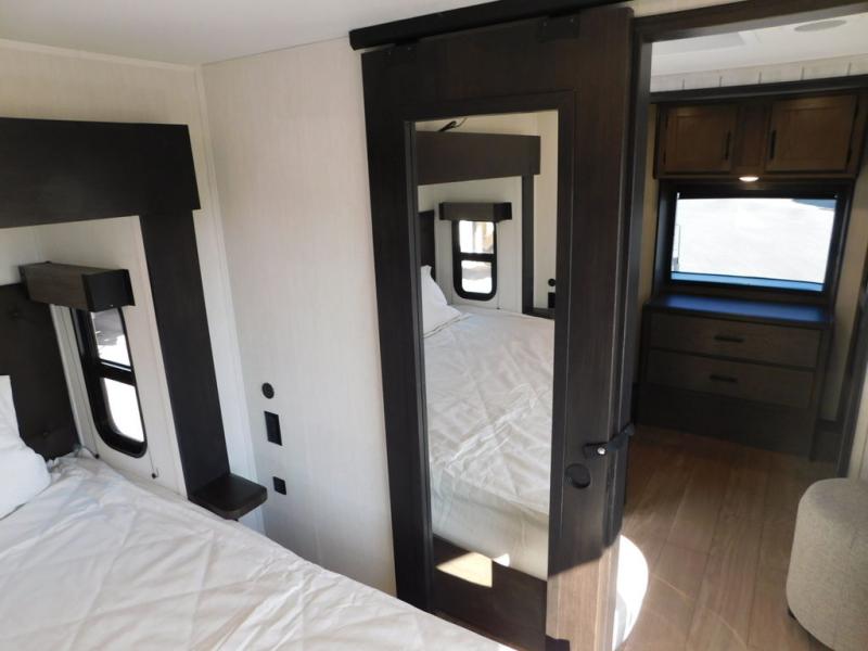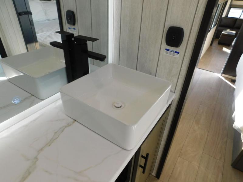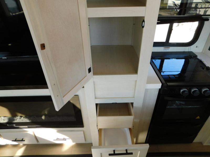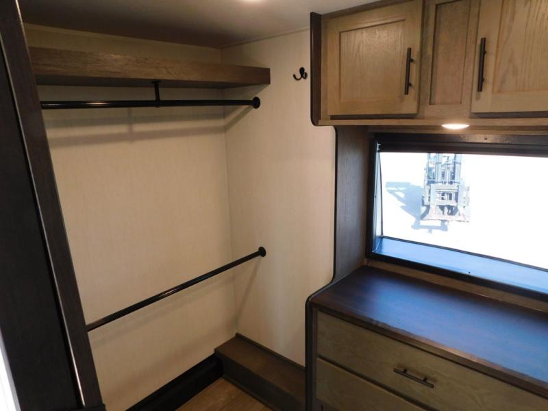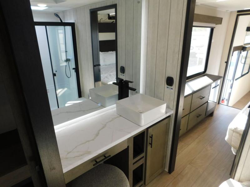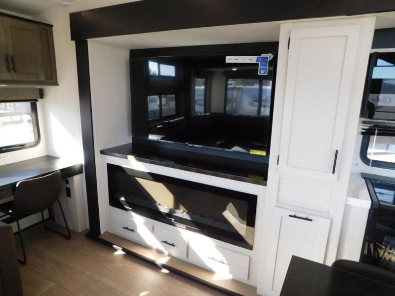 This thoughtfully arranged floorplan is built for extended stays and easy daily living. The rear lounge centers around an L-shaped sectional facing the entertainment wall and fireplace, with a nearby desk for work or hobbies. The kitchen’s island anchors a generous prep area, oversized pantry, and full cooking suite, so meals are simple whether you’re weekending or full-timing. Mid-coach, the guest half bath is convenient for all. Up front, the private bedroom’s king bed slide connects to a spa-style bath with large shower and dressing space, plus a substantial wardrobe to keep clutter out of sight. Outside, enjoy the campsite under dual power awnings that stretch along the patio side.