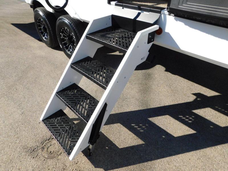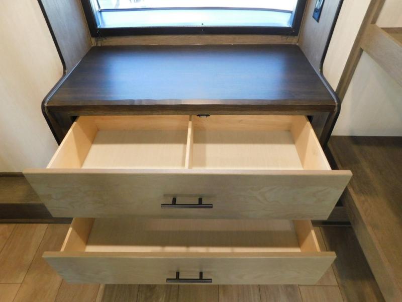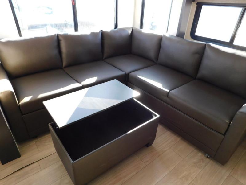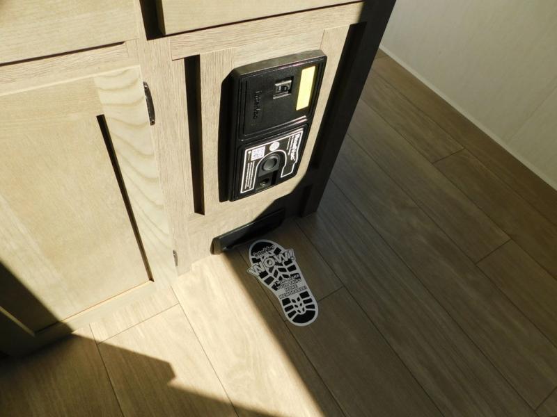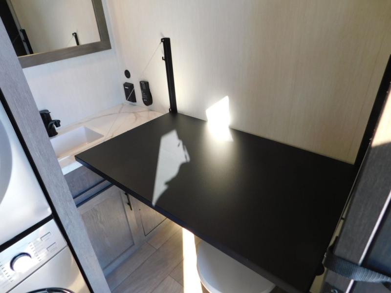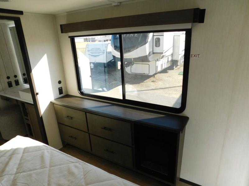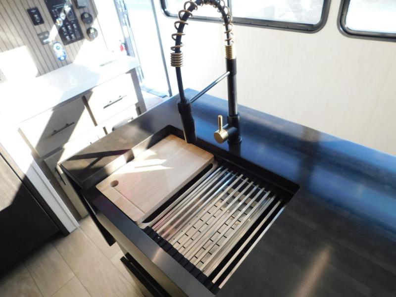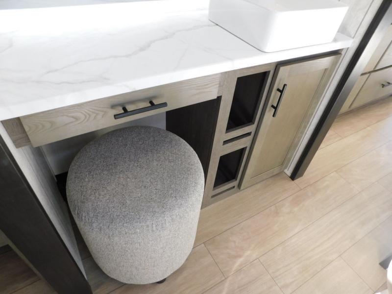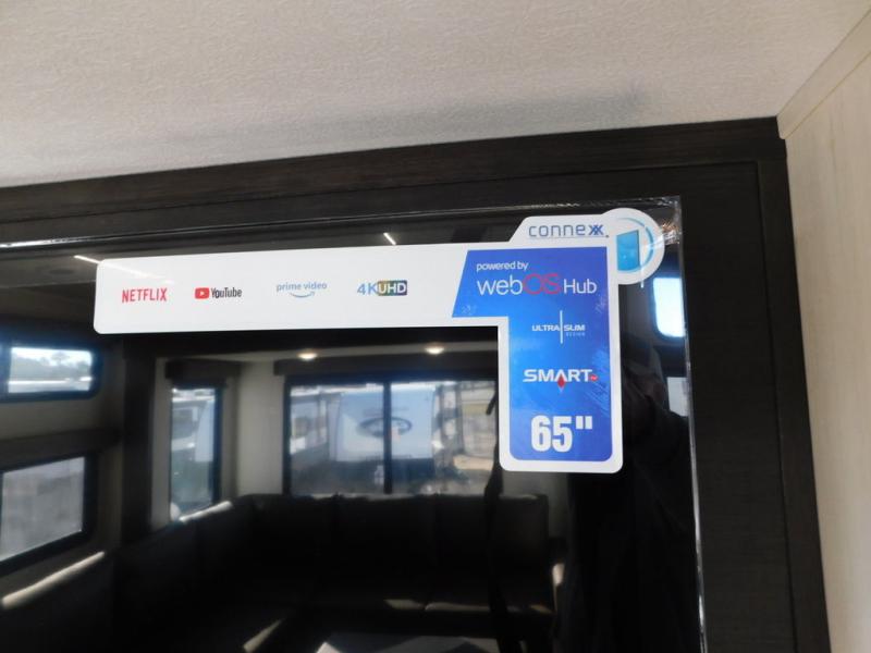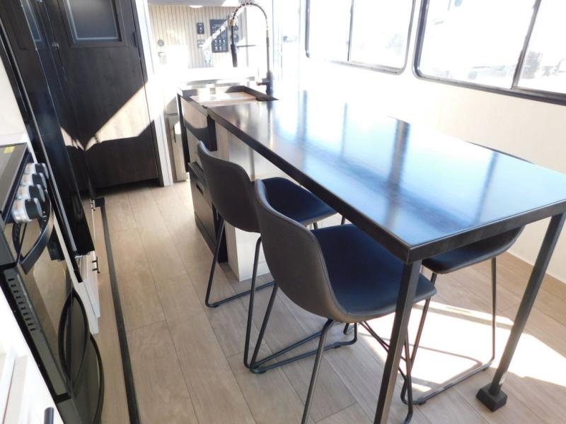 This thoughtfully arranged floorplan is built for extended stays and easy daily living. The rear lounge centers around an L-shaped sectional facing the entertainment wall and fireplace, with a nearby desk for work or hobbies. The kitchen’s island anchors a generous prep area, oversized pantry, and full cooking suite, so meals are simple whether you’re weekending or full-timing. Mid-coach, the guest half bath is convenient for all. Up front, the private bedroom’s king bed slide connects to a spa-style bath with large shower and dressing space, plus a substantial wardrobe to keep clutter out of sight. Outside, enjoy the campsite under dual power awnings that stretch along the patio side.