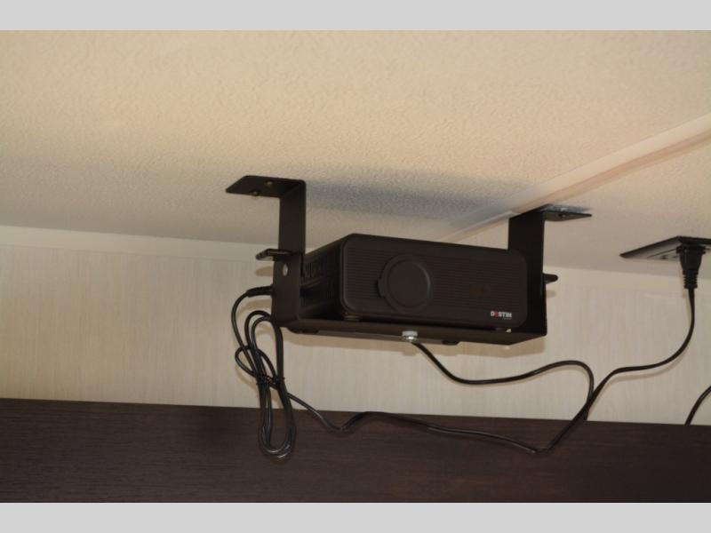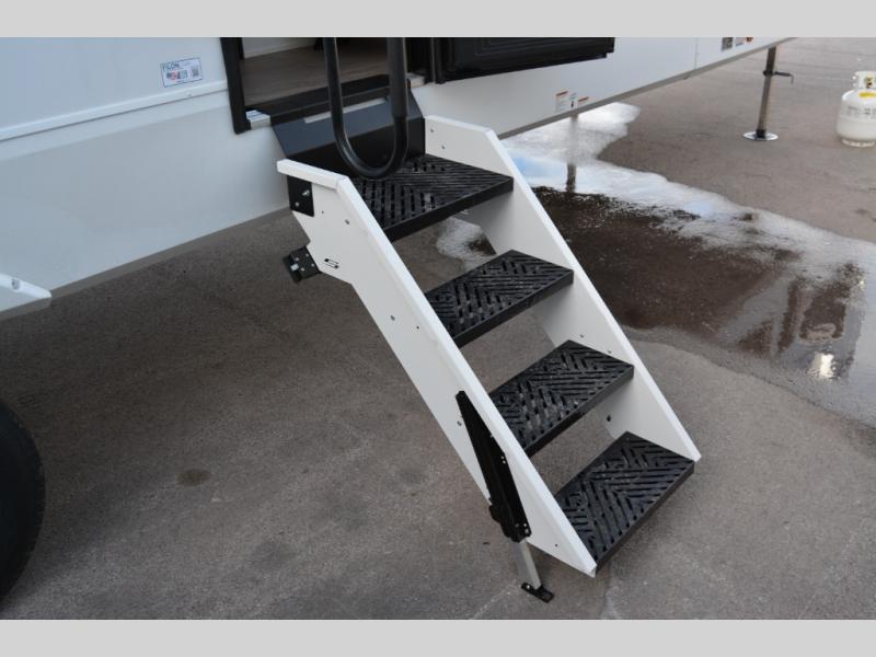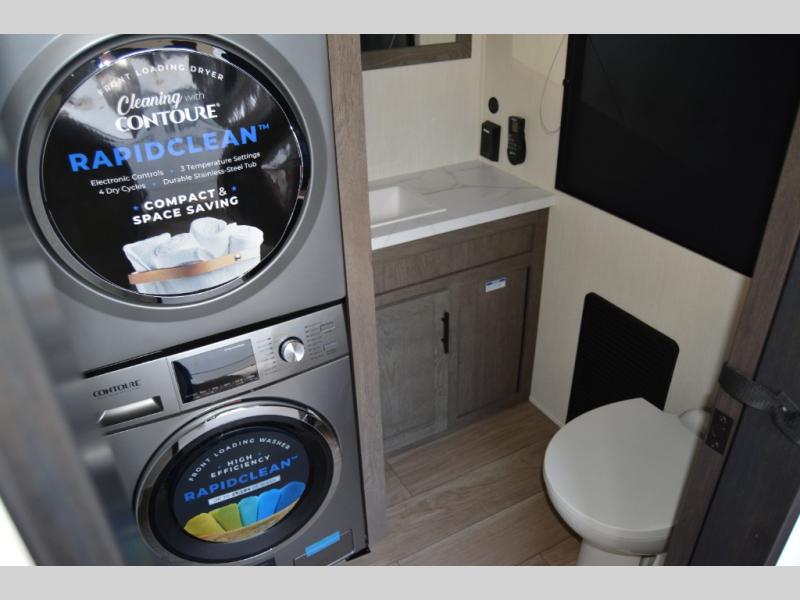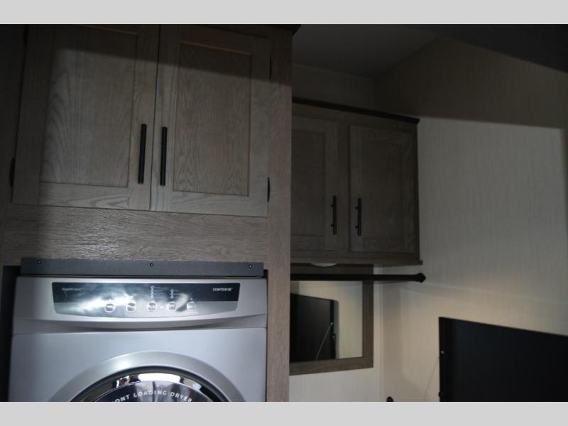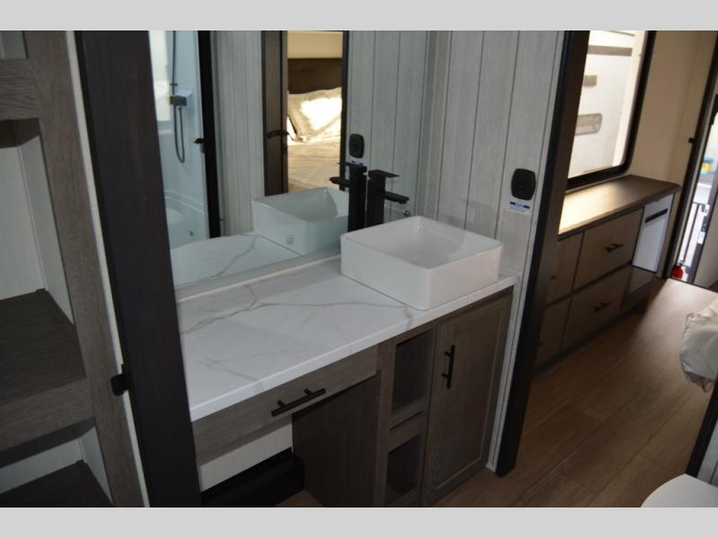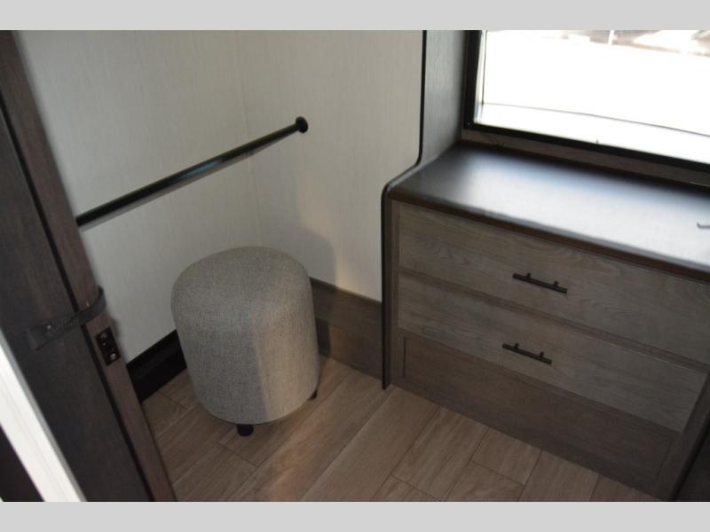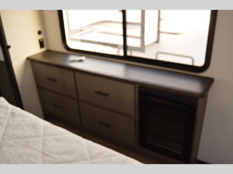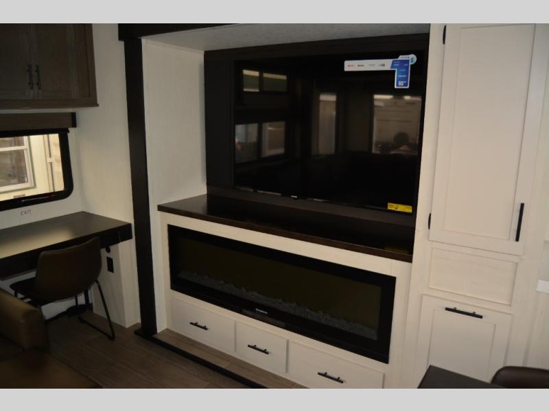 This thoughtfully arranged floorplan is built for extended stays and easy daily living. The rear lounge centers around an L-shaped sectional facing the entertainment wall and fireplace, with a nearby desk for work or hobbies. The kitchen’s island anchors a generous prep area, oversized pantry, and full cooking suite, so meals are simple whether you’re weekending or full-timing. Mid-coach, the guest half bath is convenient for all. Up front, the private bedroom’s king bed slide connects to a spa-style bath with large shower and dressing space, plus a substantial wardrobe to keep clutter out of sight. Outside, enjoy the campsite under dual power awnings that stretch along the patio side.