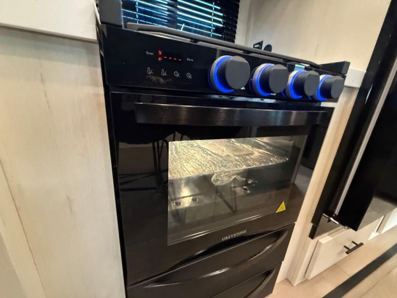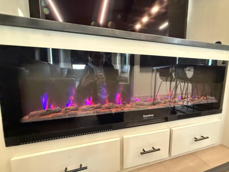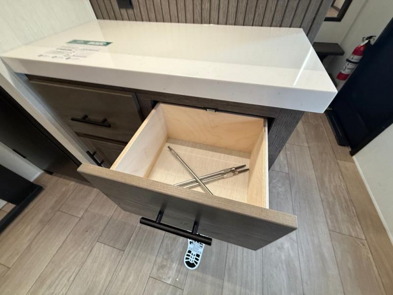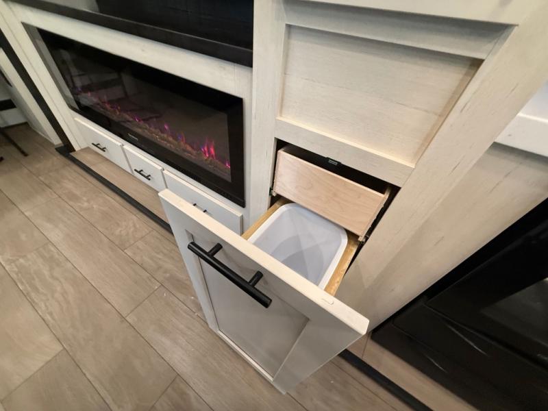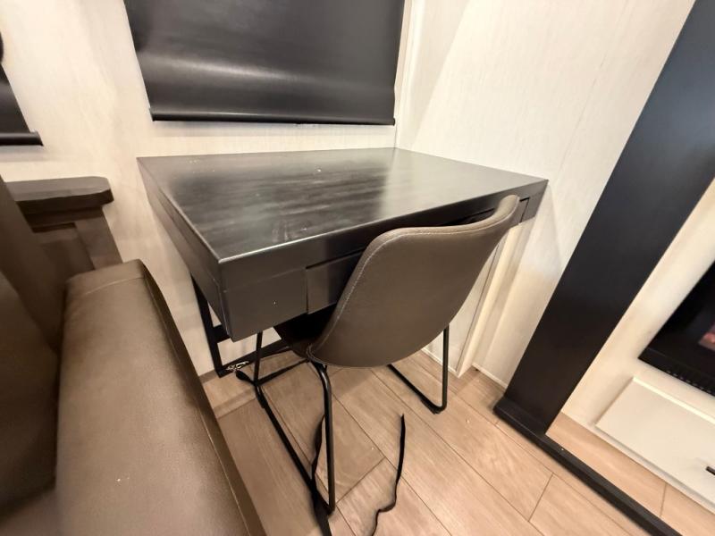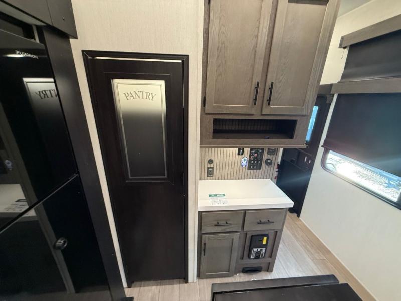 This thoughtfully arranged floorplan is built for extended stays and easy daily living. The rear lounge centers around an L-shaped sectional facing the entertainment wall and fireplace, with a nearby desk for work or hobbies. The kitchen’s island anchors a generous prep area, oversized pantry, and full cooking suite, so meals are simple whether you’re weekending or full-timing. Mid-coach, the guest half bath is convenient for all. Up front, the private bedroom’s king bed slide connects to a spa-style bath with large shower and dressing space, plus a substantial wardrobe to keep clutter out of sight. Outside, enjoy the campsite under dual power awnings that stretch along the patio side.