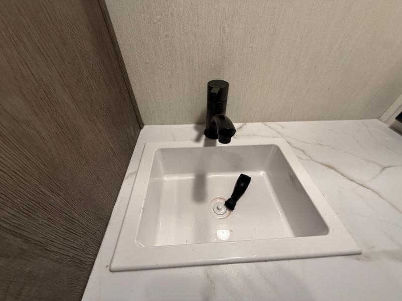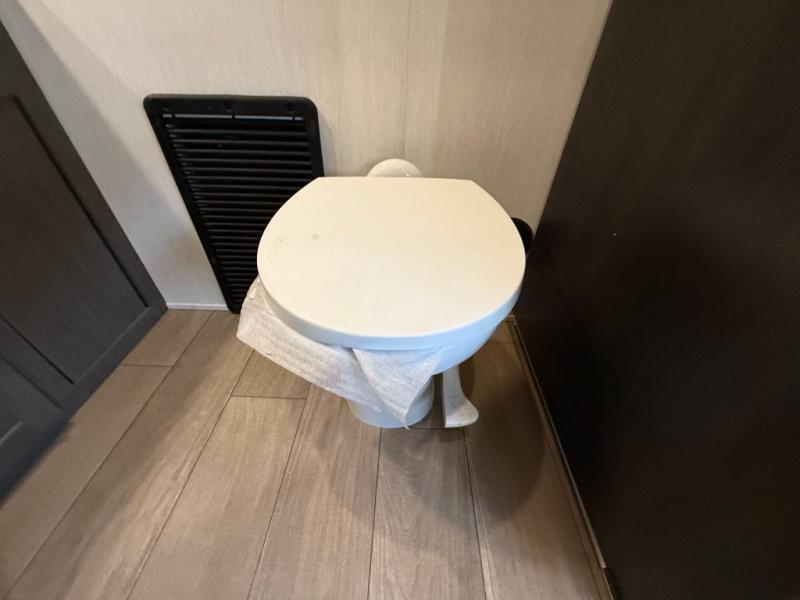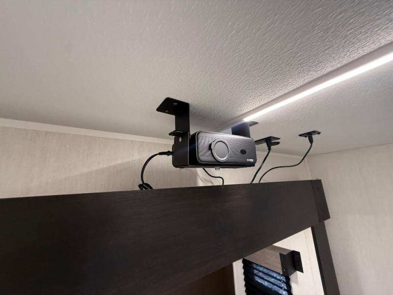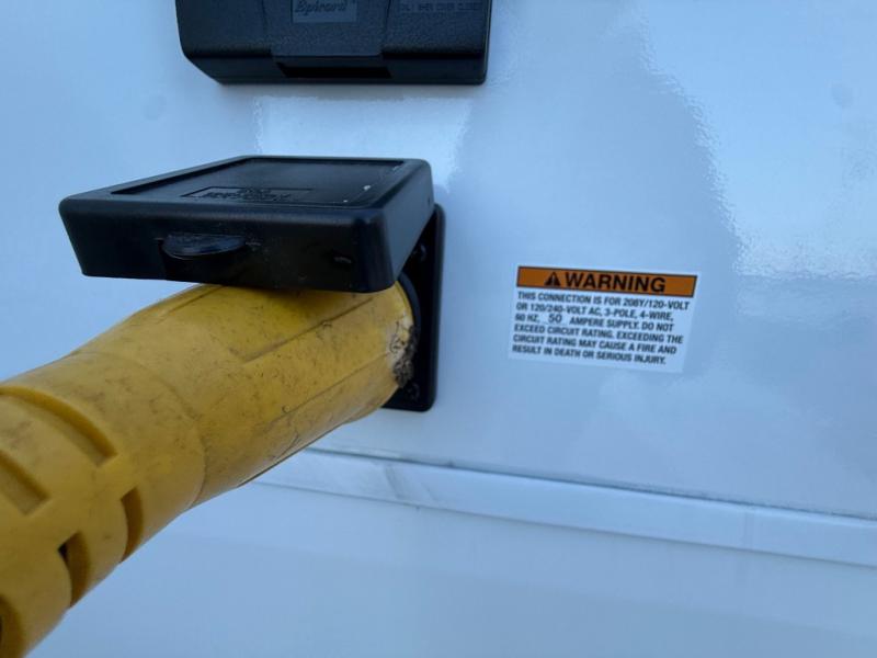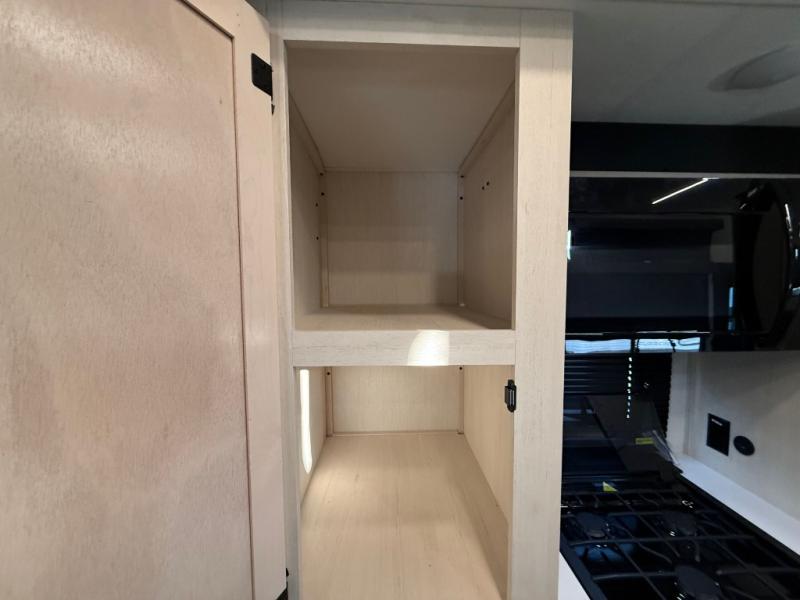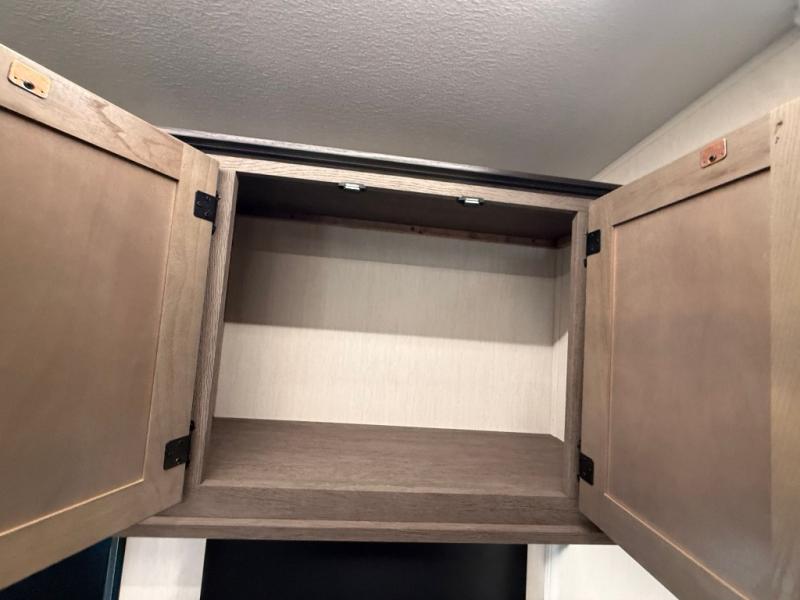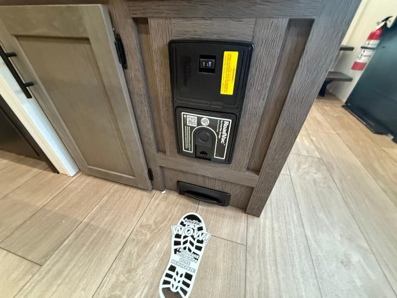 This thoughtfully arranged floorplan is built for extended stays and easy daily living. The rear lounge centers around an L-shaped sectional facing the entertainment wall and fireplace, with a nearby desk for work or hobbies. The kitchen’s island anchors a generous prep area, oversized pantry, and full cooking suite, so meals are simple whether you’re weekending or full-timing. Mid-coach, the guest half bath is convenient for all. Up front, the private bedroom’s king bed slide connects to a spa-style bath with large shower and dressing space, plus a substantial wardrobe to keep clutter out of sight. Outside, enjoy the campsite under dual power awnings that stretch along the patio side.