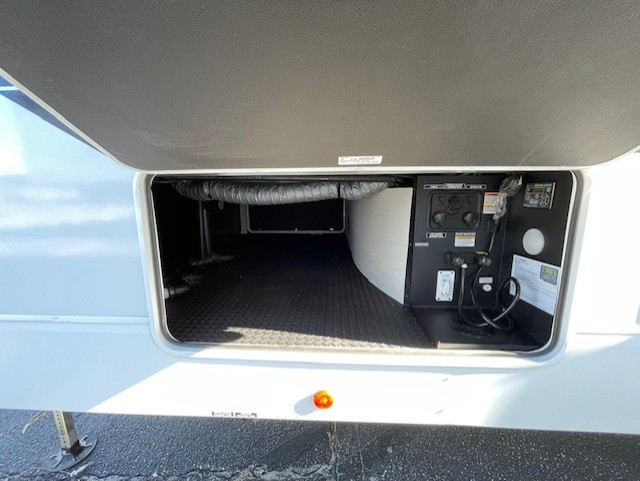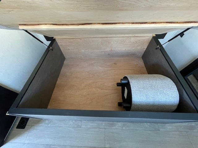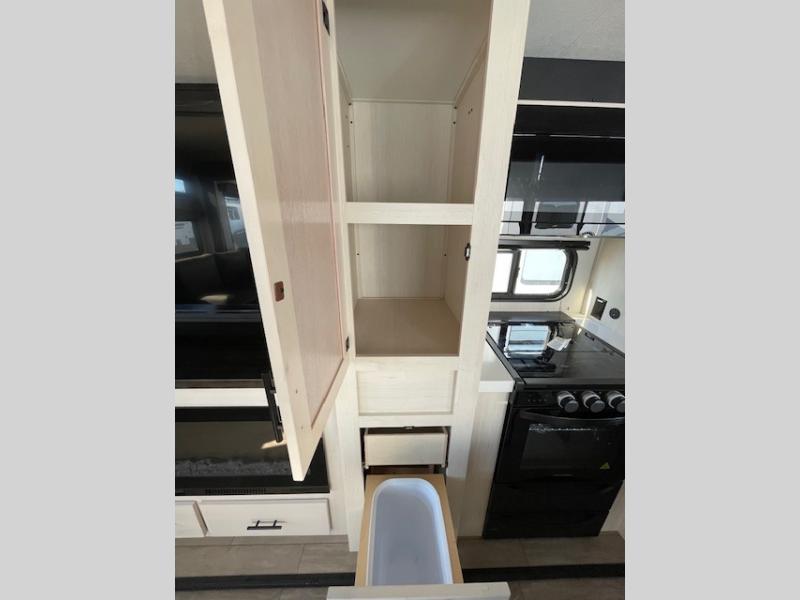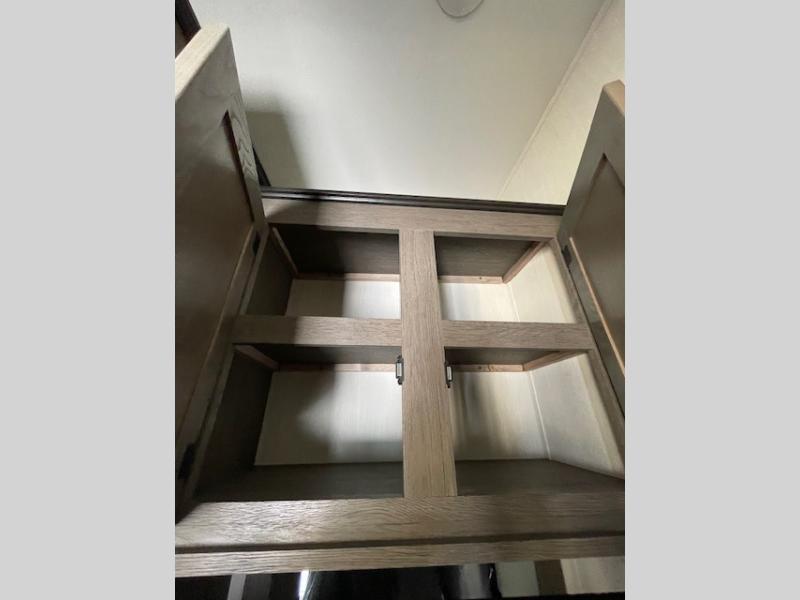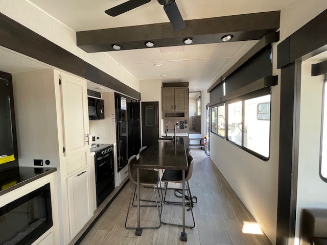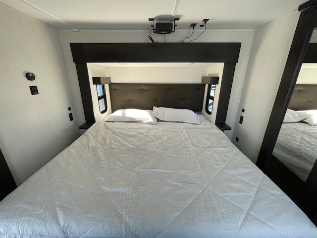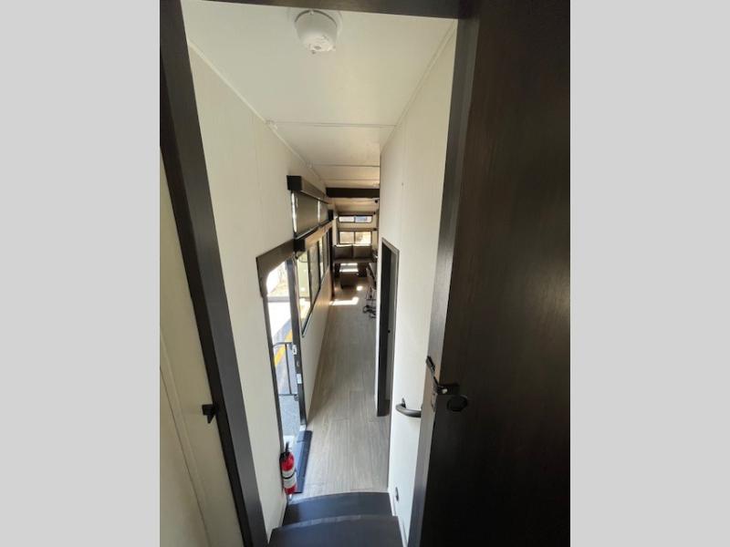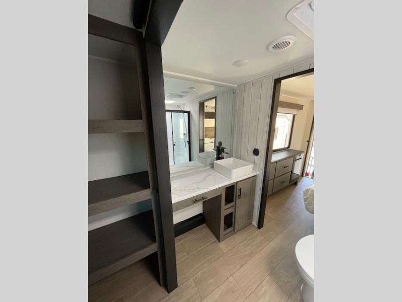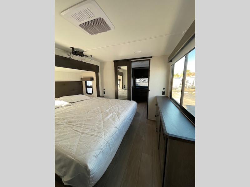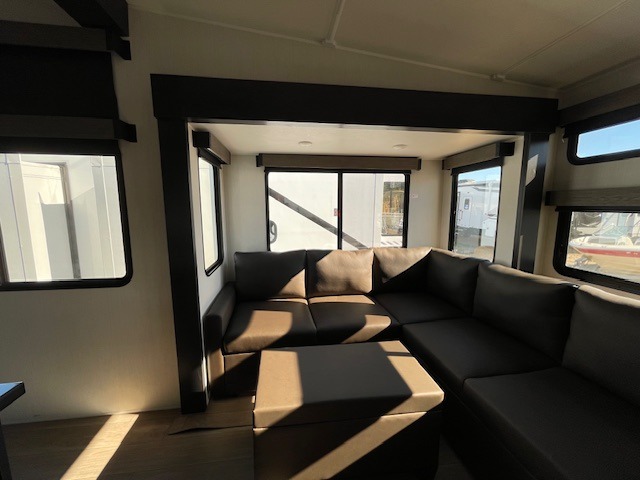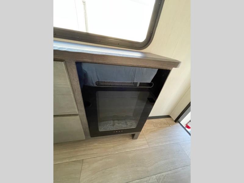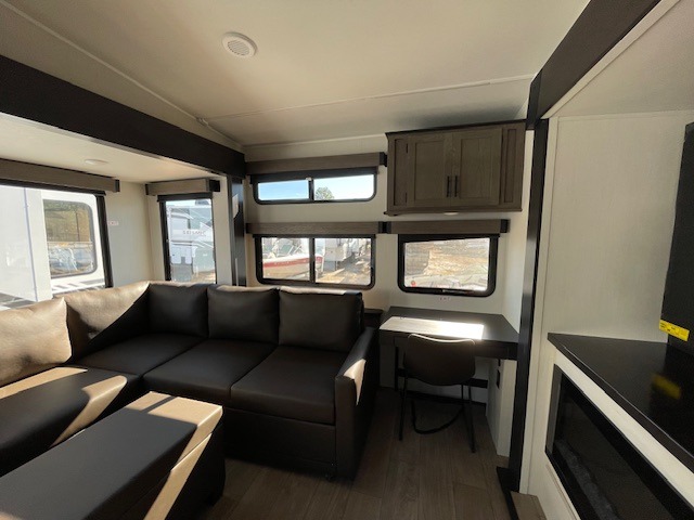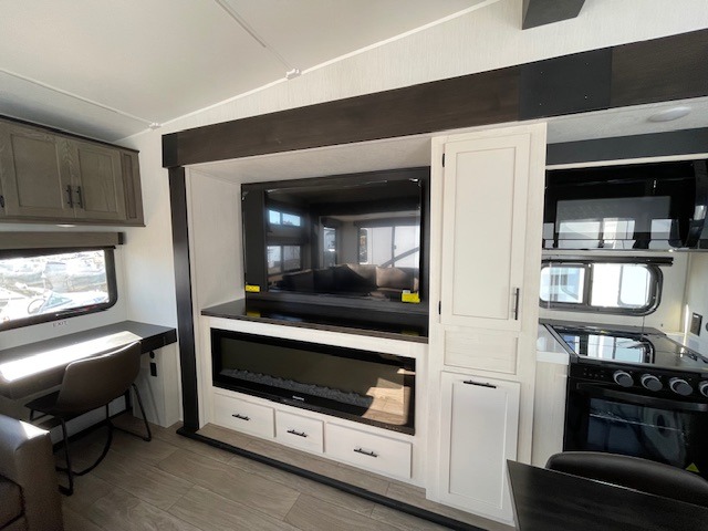This thoughtfully arranged floorplan is built for extended stays and easy daily living. The rear lounge centers around an L-shaped sectional facing the entertainment wall and fireplace, with a nearby desk for work or hobbies. The kitchen’s island anchors a generous prep area, oversized pantry, and full cooking suite, so meals are simple whether you’re weekending or full-timing. Mid-coach, the guest half bath is convenient for all. Up front, the private bedroom’s king bed slide connects to a spa-style bath with large shower and dressing space, plus a substantial wardrobe to keep clutter out of sight. Outside, enjoy the campsite under dual power awnings that stretch along the patio side.