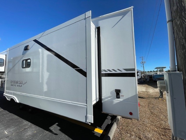 You'll have the very best time tackling outdoor adventures with the Forest River Cherokee Arctic Wolf fifth wheel! Each model has been constructed with a “ToughBend” rigid skirt metal design, Leash Latch pet safety technology, an outside shower with hot/cold water, and a 1x engineered wood “SuperTruss” roof structure with 3/8" decking for added durability. There is also an automatic leveling and stabilization system, plus 12V heat pads on all holding tanks with help withstand colder temperatures. Inside, you'll love the solid surface kitchen countertops, along with a carpetless floor design, and fully adjustable, slow rise, blackout roller shades. The on-demand tankless hot water heater will provide endless hot water and the central A/C unit with Quick Cool will ensure your comfort during those hot summer camping months. There are many more stand-out features found on these fifth wheels; check them out!