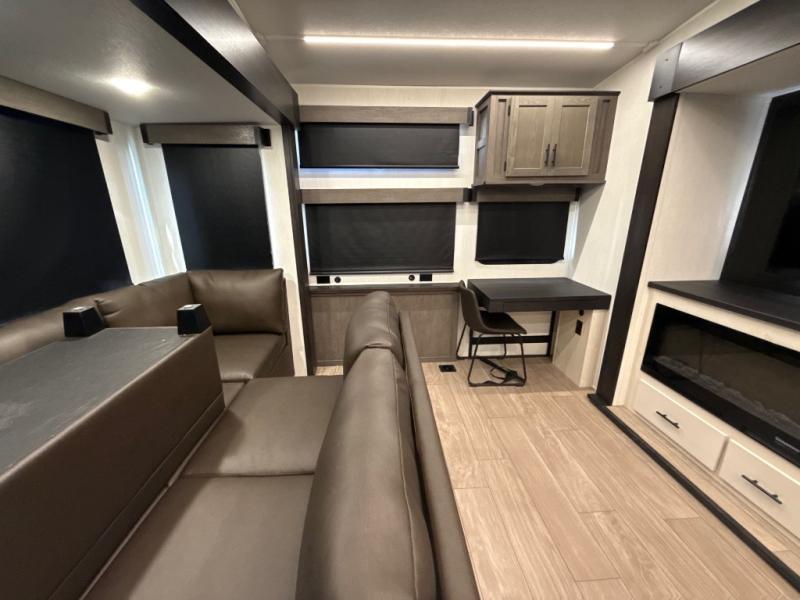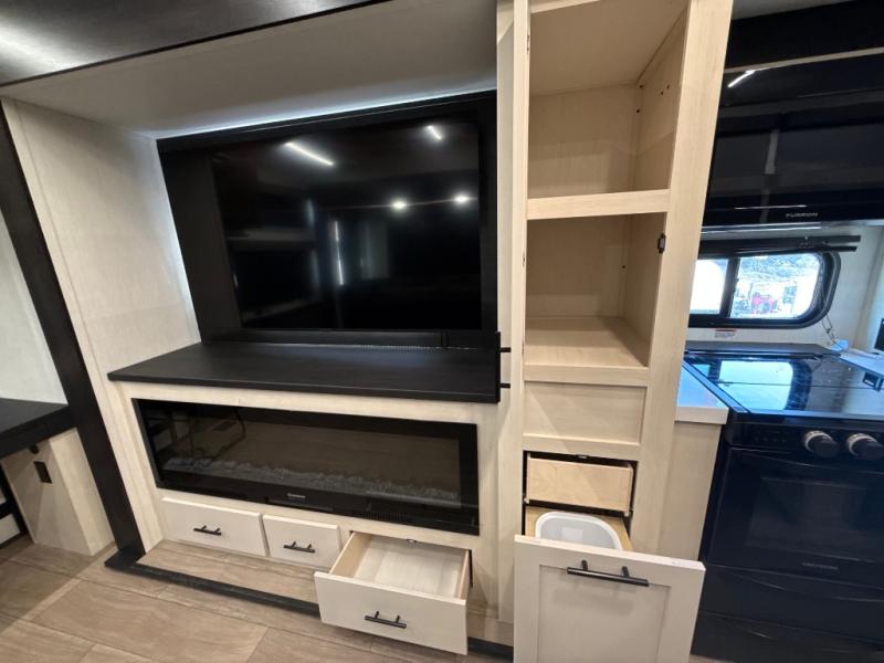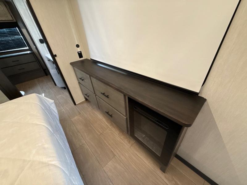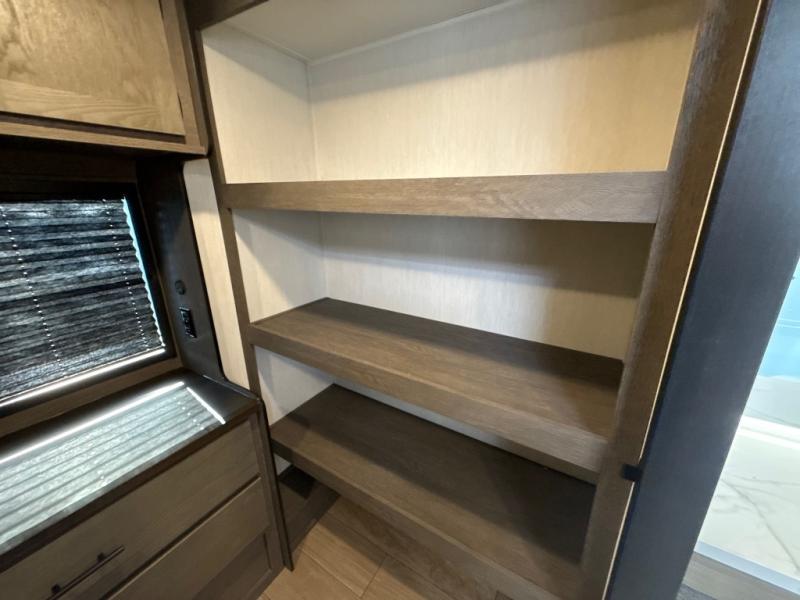 This thoughtfully arranged floorplan is built for extended stays and easy daily living. The rear lounge centers around an L-shaped sectional facing the entertainment wall and fireplace, with a nearby desk for work or hobbies. The kitchen’s island anchors a generous prep area, oversized pantry, and full cooking suite, so meals are simple whether you’re weekending or full-timing. Mid-coach, the guest half bath is convenient for all. Up front, the private bedroom’s king bed slide connects to a spa-style bath with large shower and dressing space, plus a substantial wardrobe to keep clutter out of sight. Outside, enjoy the campsite under dual power awnings that stretch along the patio side.