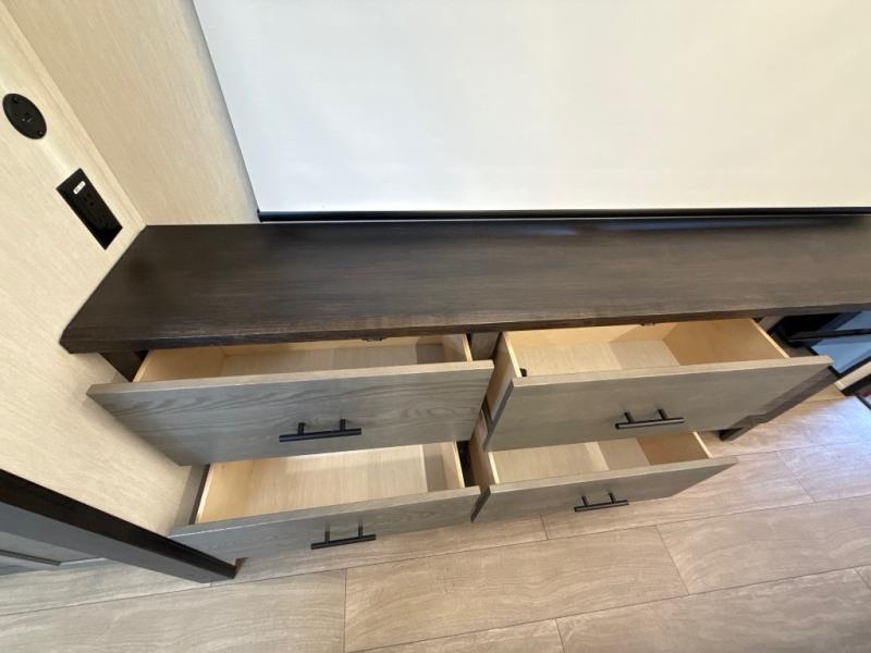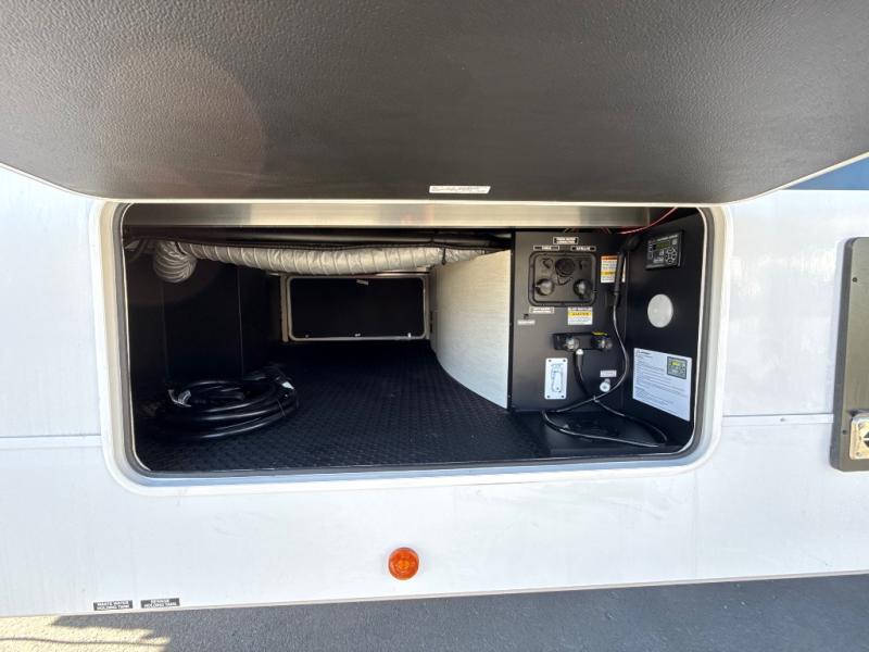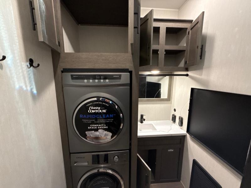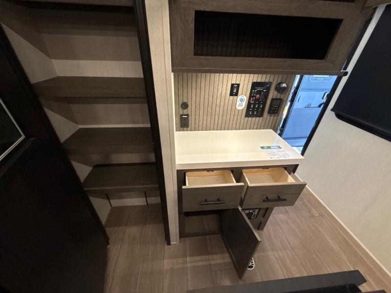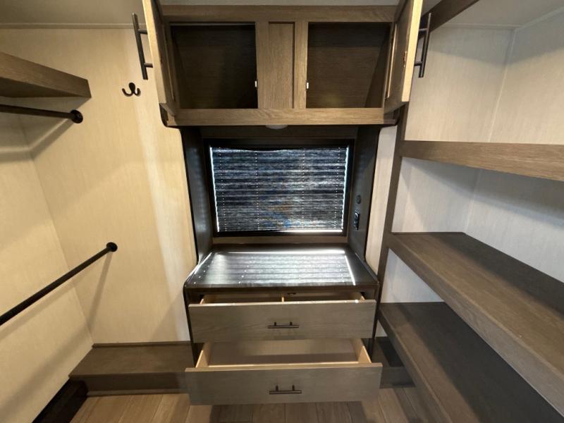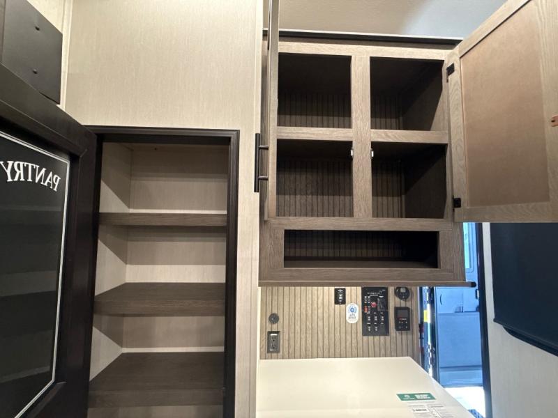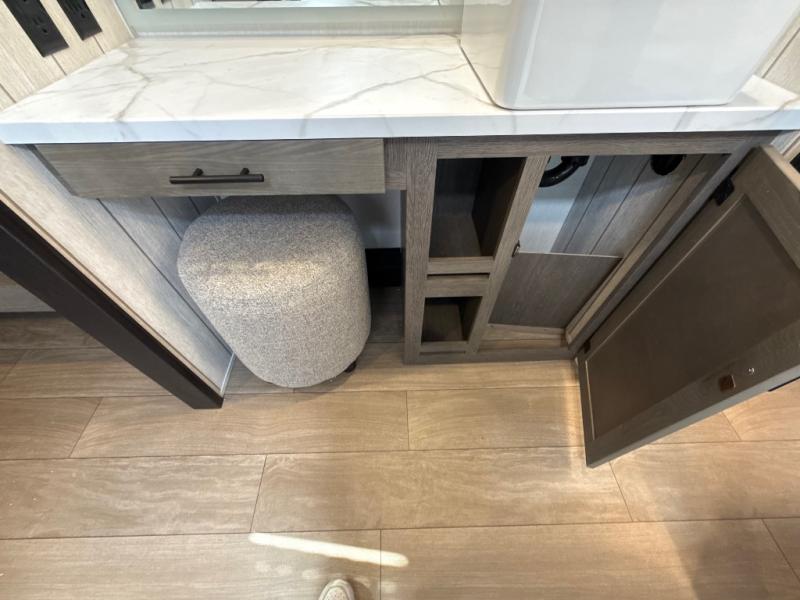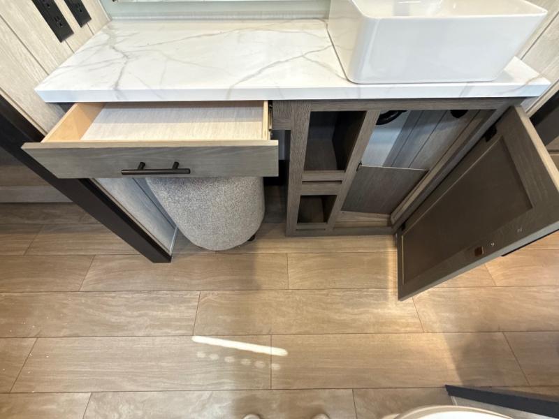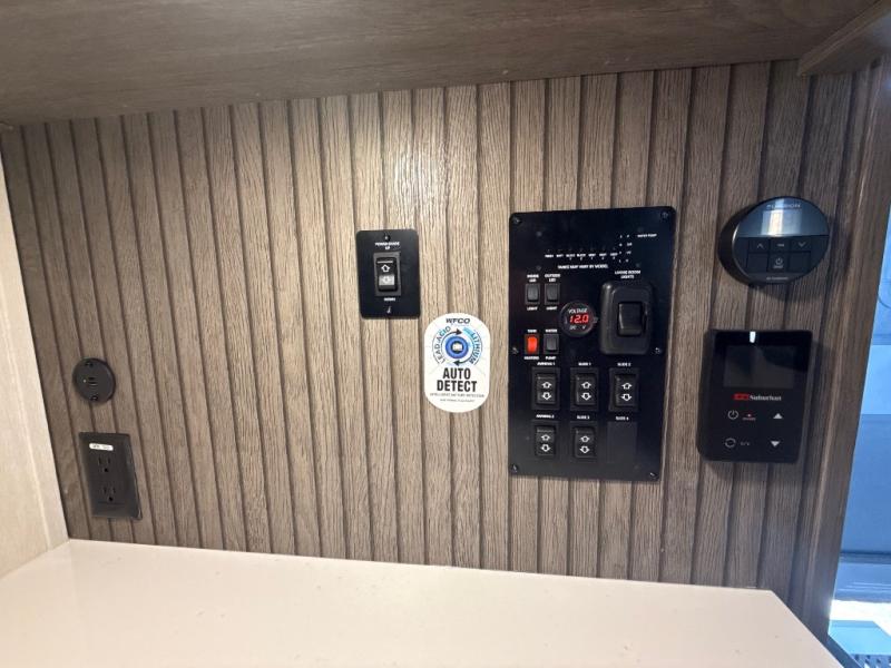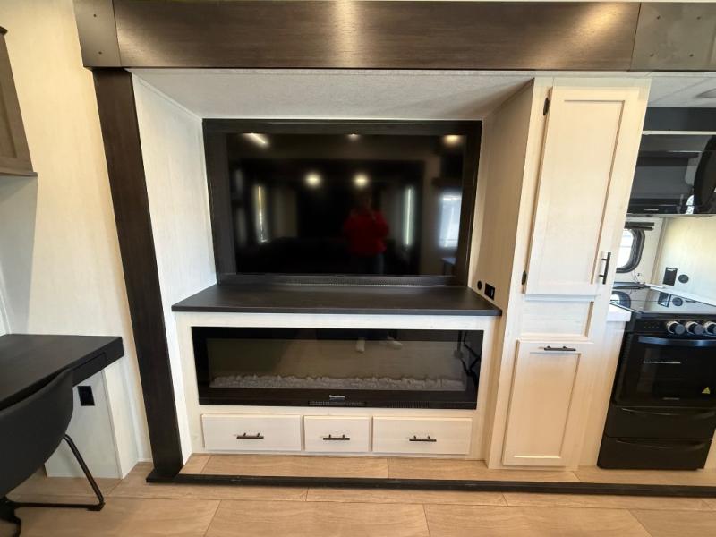 This thoughtfully arranged floorplan is built for extended stays and easy daily living. The rear lounge centers around an L-shaped sectional facing the entertainment wall and fireplace, with a nearby desk for work or hobbies. The kitchen’s island anchors a generous prep area, oversized pantry, and full cooking suite, so meals are simple whether you’re weekending or full-timing. Mid-coach, the guest half bath is convenient for all. Up front, the private bedroom’s king bed slide connects to a spa-style bath with large shower and dressing space, plus a substantial wardrobe to keep clutter out of sight. Outside, enjoy the campsite under dual power awnings that stretch along the patio side.
