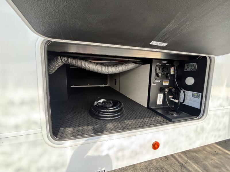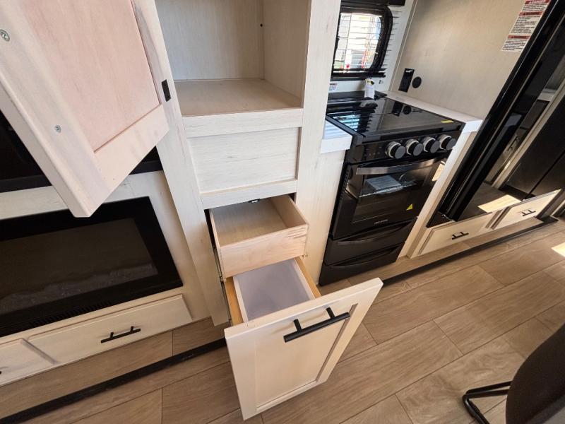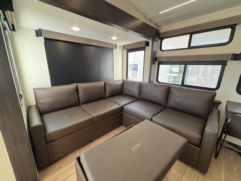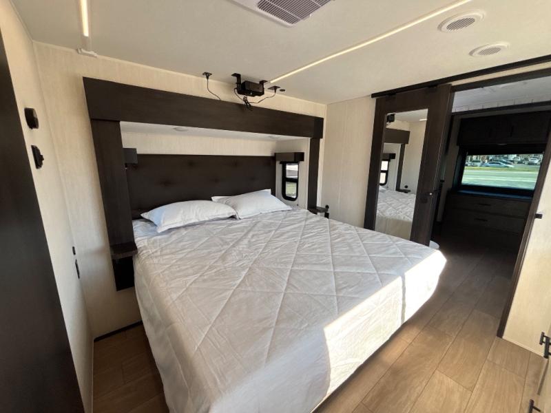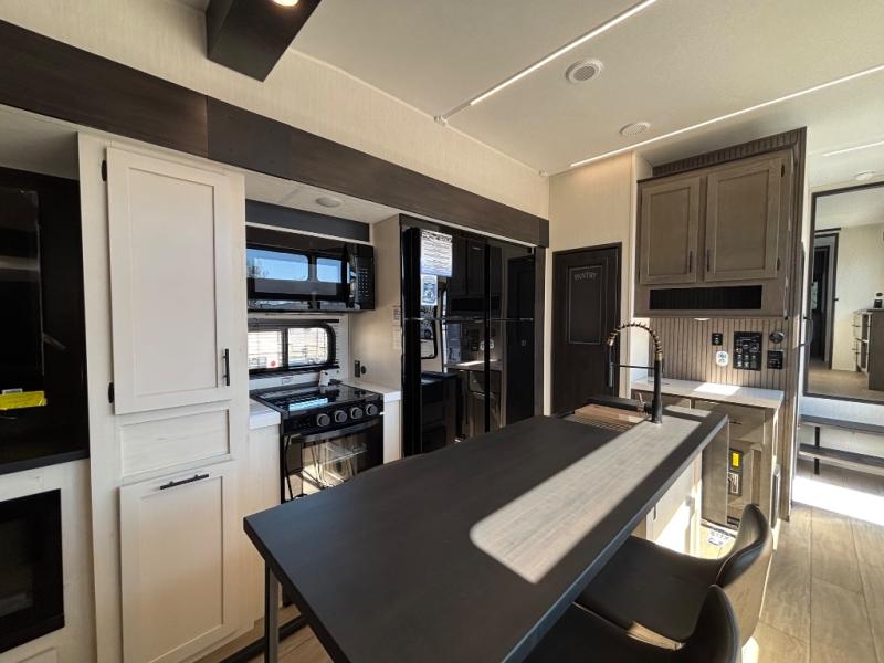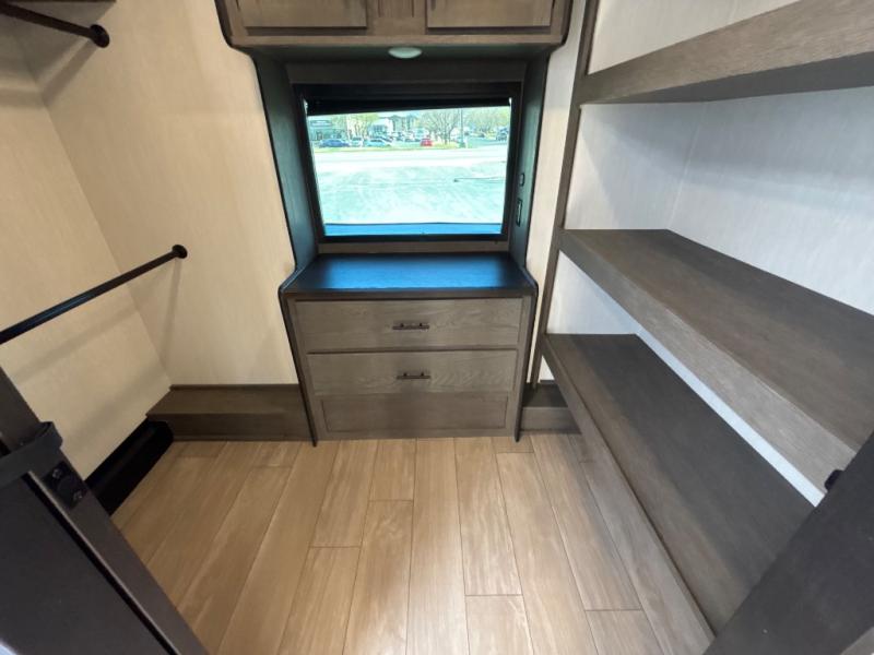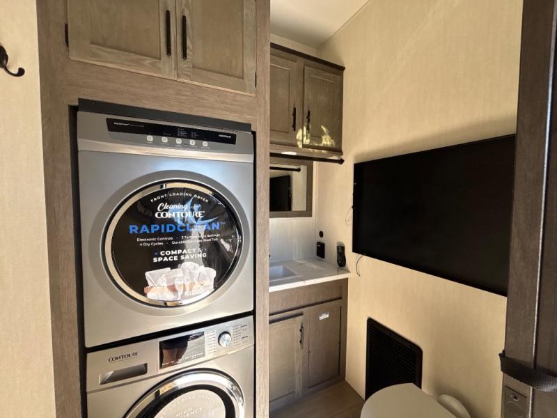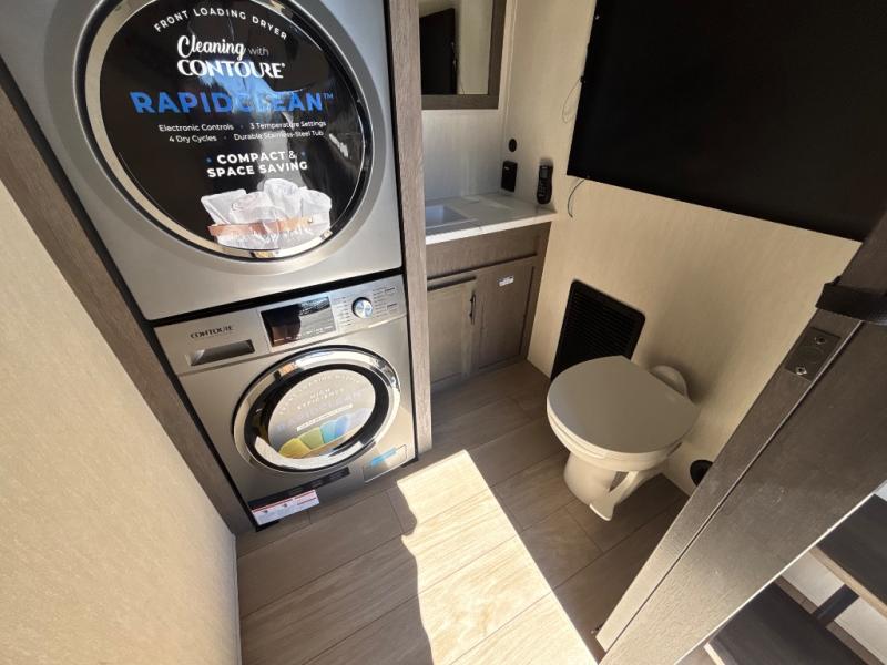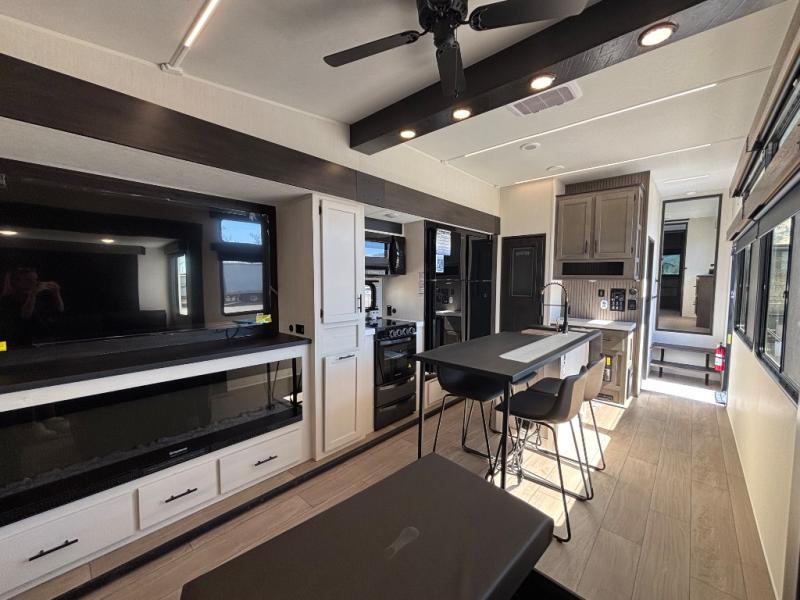 This thoughtfully arranged floorplan is built for extended stays and easy daily living. The rear lounge centers around an L-shaped sectional facing the entertainment wall and fireplace, with a nearby desk for work or hobbies. The kitchen’s island anchors a generous prep area, oversized pantry, and full cooking suite, so meals are simple whether you’re weekending or full-timing. Mid-coach, the guest half bath is convenient for all. Up front, the private bedroom’s king bed slide connects to a spa-style bath with large shower and dressing space, plus a substantial wardrobe to keep clutter out of sight. Outside, enjoy the campsite under dual power awnings that stretch along the patio side.