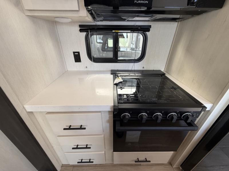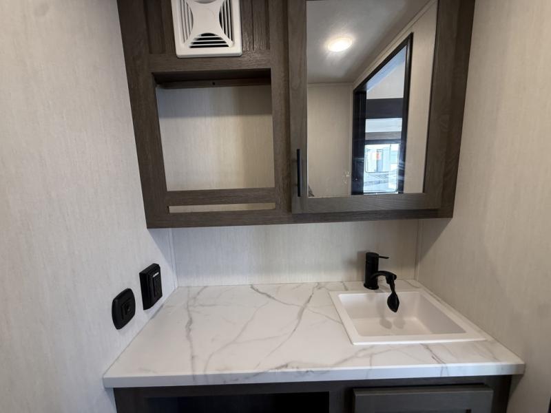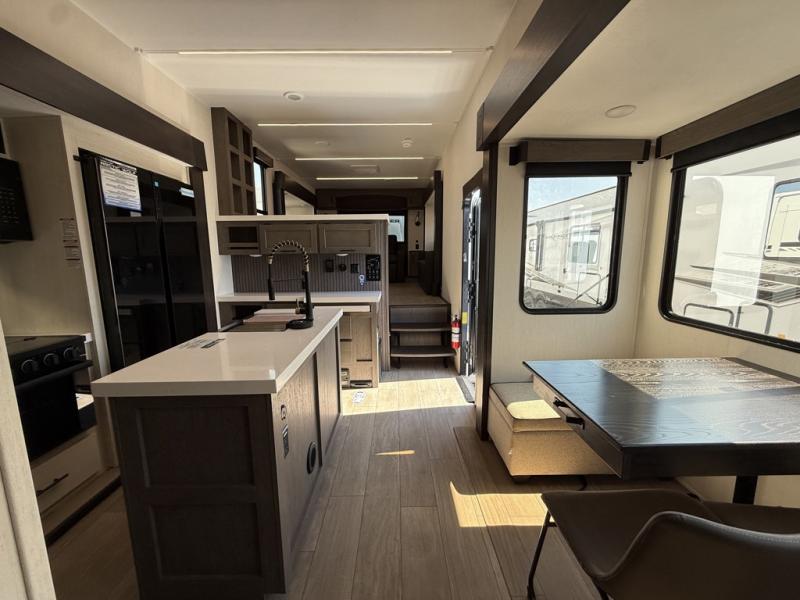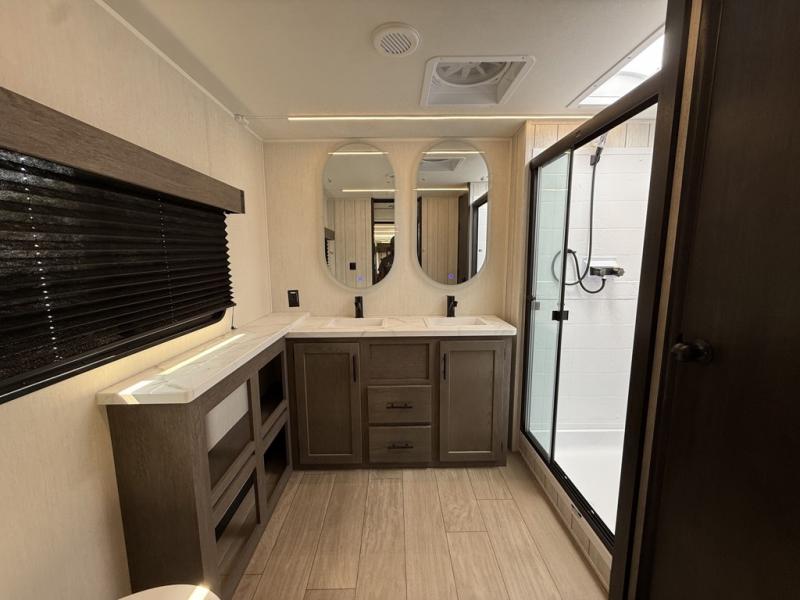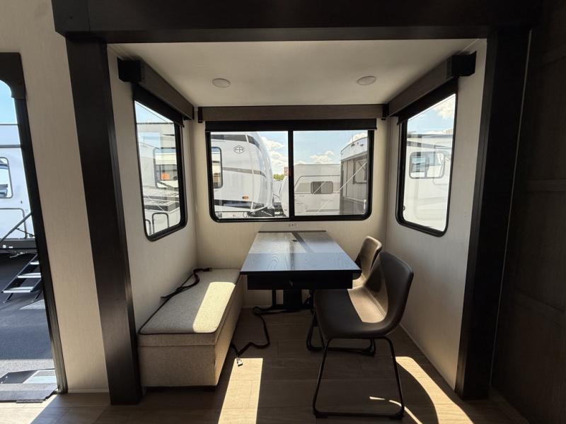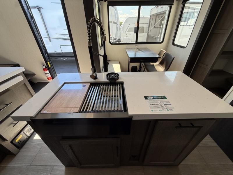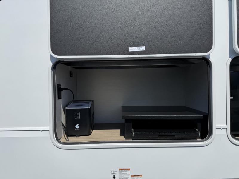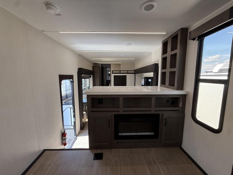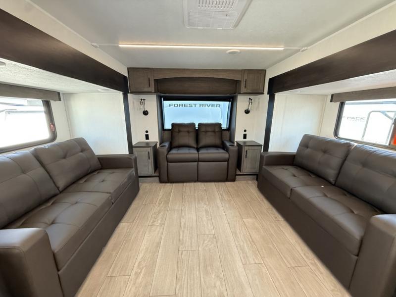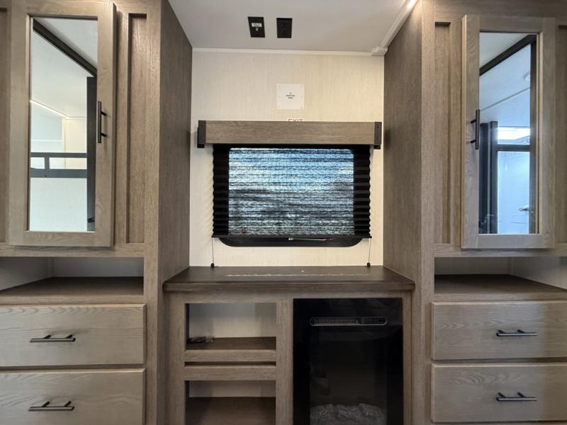 Five slides, a bath and a half, plus sleeping space for six make this fifth wheel the perfect choice! Once you arrive at your destination, prepare lunch on the exterior kitchen. Inside, you'll find a kitchen island, plenty of storage space, plus a free-standing table with chairs and a storage ottoman seat. The front living area will be a favorite place to hang out and this room can double as a bedroom with the two tri-fold sofas. There is also theater seating across from the entertainment center and fireplace, plus storage cabinets for movies or board games. When you're ready to call it a night, head to the master bedroom for a great night's rest on the king bed slide out. You will also love the full rear bath with dual sinks, a spacious shower, plus a closet with stackable washer and dryer prep!