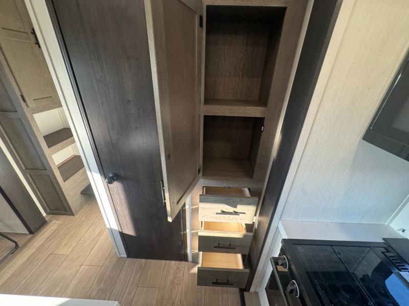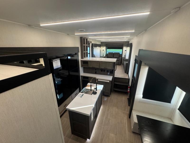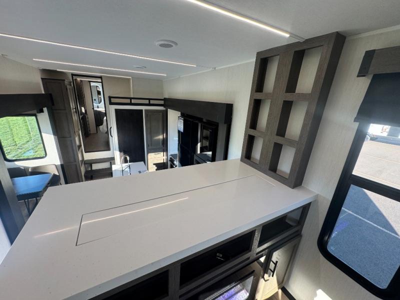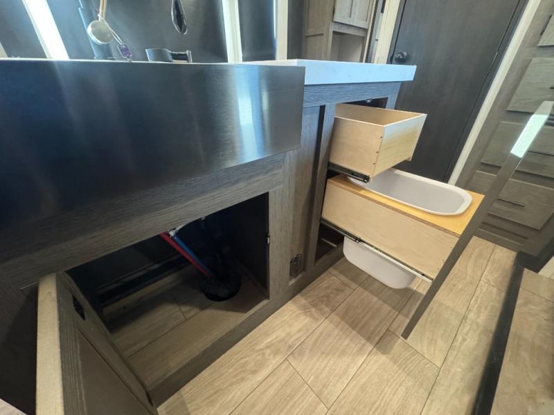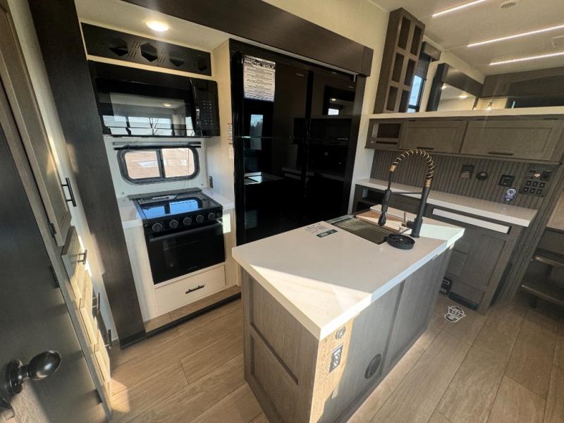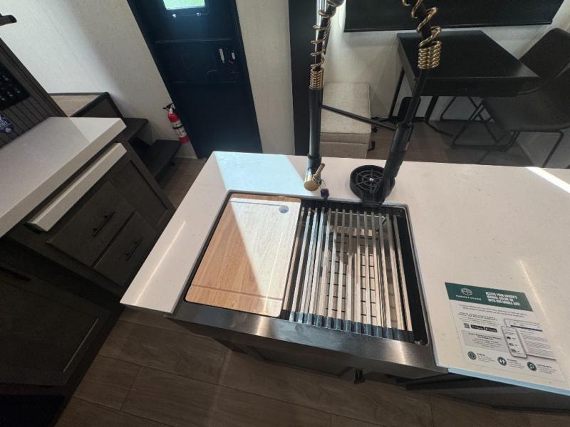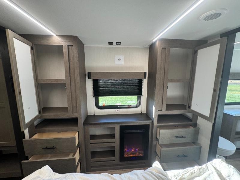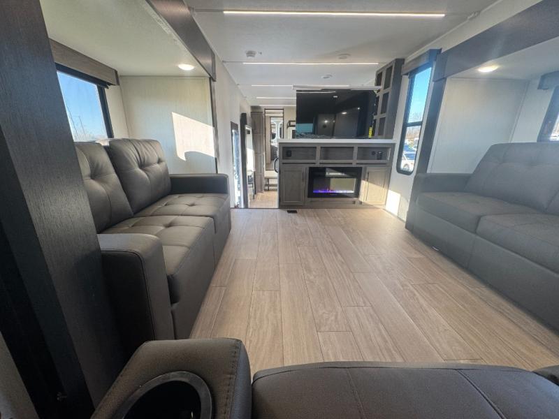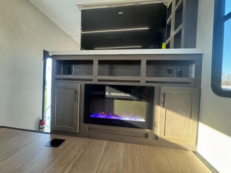 Five slides, a bath and a half, plus sleeping space for six make this fifth wheel the perfect choice! Once you arrive at your destination, prepare lunch on the exterior kitchen. Inside, you'll find a kitchen island, plenty of storage space, plus a free-standing table with chairs and a storage ottoman seat. The front living area will be a favorite place to hang out and this room can double as a bedroom with the two tri-fold sofas. There is also theater seating across from the entertainment center and fireplace, plus storage cabinets for movies or board games. When you're ready to call it a night, head to the master bedroom for a great night's rest on the king bed slide out. You will also love the full rear bath with dual sinks, a spacious shower, plus a closet with stackable washer and dryer prep!