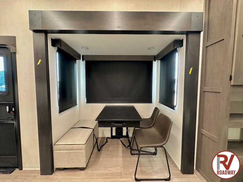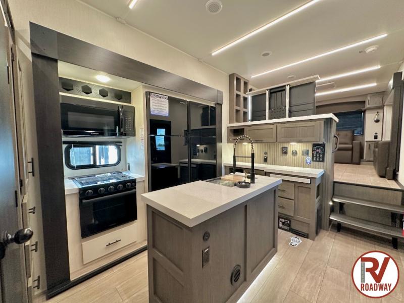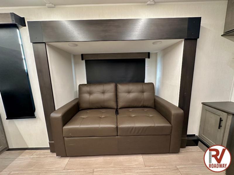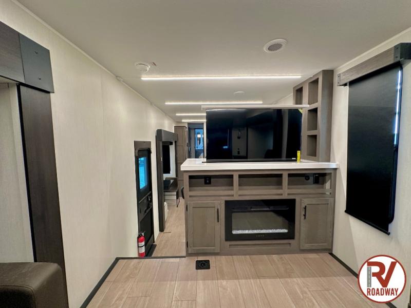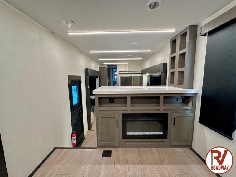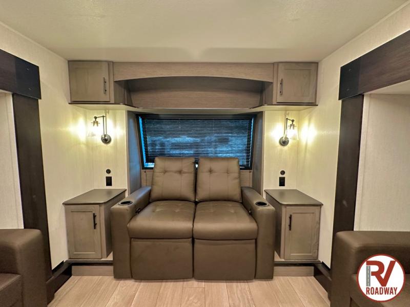 Five slides, a bath and a half, plus sleeping space for six make this fifth wheel the perfect choice! Once you arrive at your destination, prepare lunch on the exterior kitchen. Inside, you'll find a kitchen island, plenty of storage space, plus a free-standing table with chairs and a storage ottoman seat. The front living area will be a favorite place to hang out and this room can double as a bedroom with the two tri-fold sofas. There is also theater seating across from the entertainment center and fireplace, plus storage cabinets for movies or board games. When you're ready to call it a night, head to the master bedroom for a great night's rest on the king bed slide out. You will also love the full rear bath with dual sinks, a spacious shower, plus a closet with stackable washer and dryer prep!