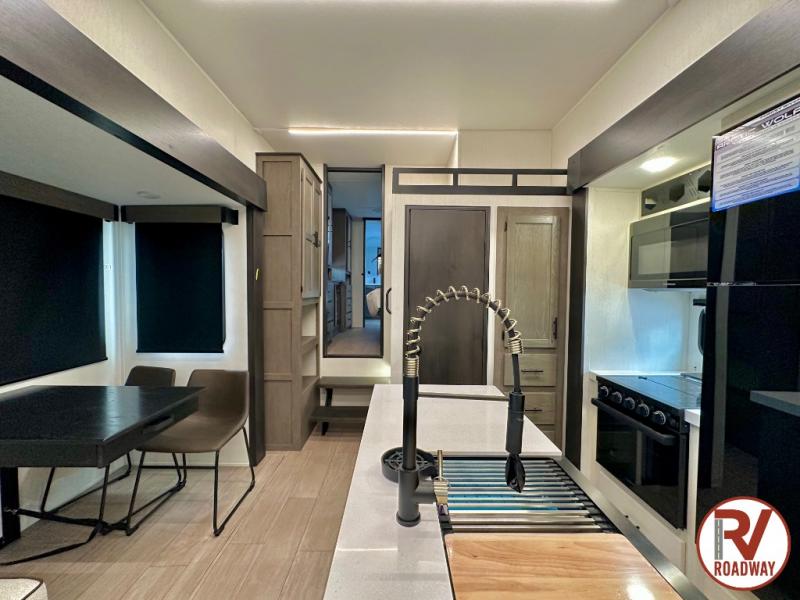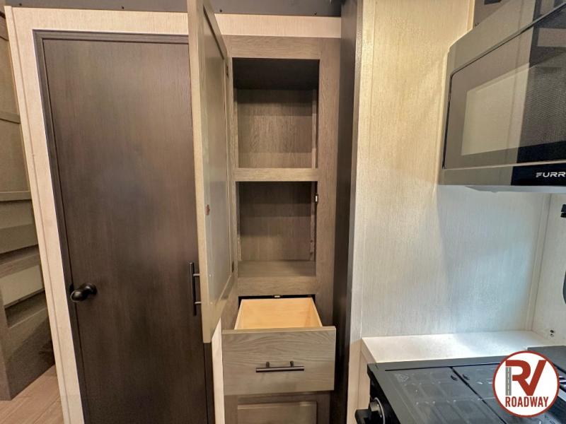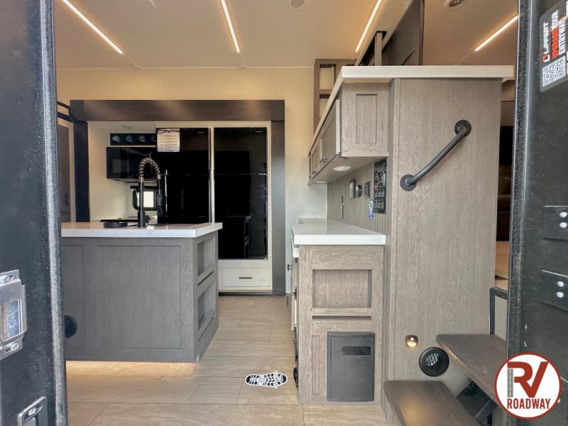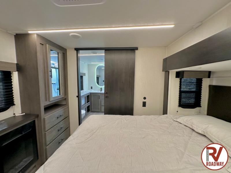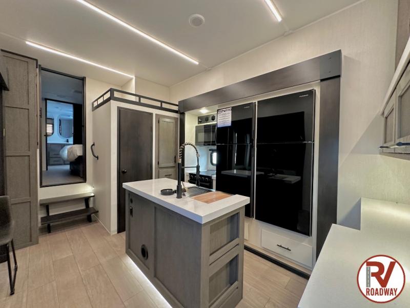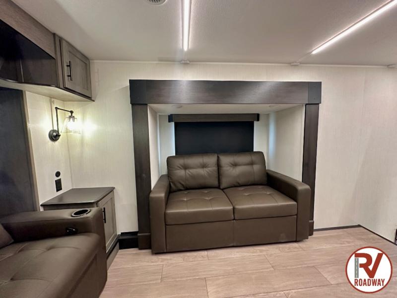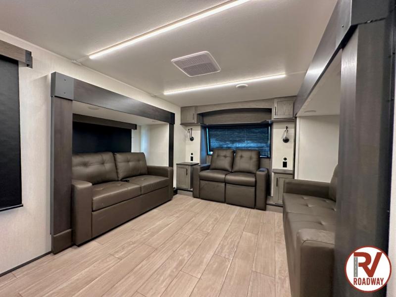 Five slides, a bath and a half, plus sleeping space for six make this fifth wheel the perfect choice! Once you arrive at your destination, prepare lunch on the exterior kitchen. Inside, you'll find a kitchen island, plenty of storage space, plus a free-standing table with chairs and a storage ottoman seat. The front living area will be a favorite place to hang out and this room can double as a bedroom with the two tri-fold sofas. There is also theater seating across from the entertainment center and fireplace, plus storage cabinets for movies or board games. When you're ready to call it a night, head to the master bedroom for a great night's rest on the king bed slide out. You will also love the full rear bath with dual sinks, a spacious shower, plus a closet with stackable washer and dryer prep!