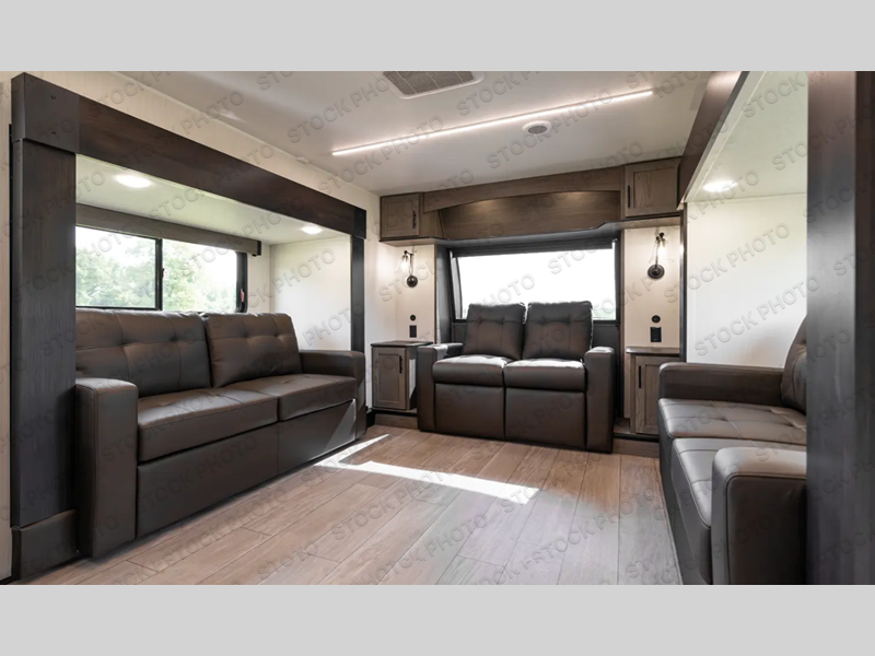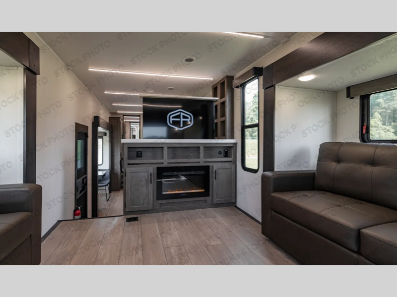 Five slides, a bath and a half, plus sleeping space for six make this fifth wheel the perfect choice! Once you arrive at your destination, prepare lunch on the exterior kitchen. Inside, you'll find a kitchen island, plenty of storage space, plus a free-standing table with chairs and a storage ottoman seat. The front living area will be a favorite place to hang out and this room can double as a bedroom with the two tri-fold sofas. There is also theater seating across from the entertainment center and fireplace, plus storage cabinets for movies or board games. When you're ready to call it a night, head to the master bedroom for a great night's rest on the king bed slide out. You will also love the full rear bath with dual sinks, a spacious shower, plus a closet with stackable washer and dryer prep!