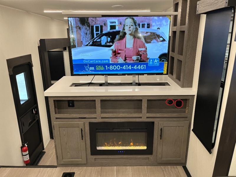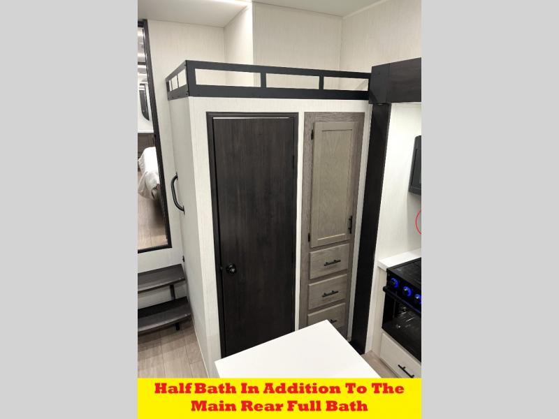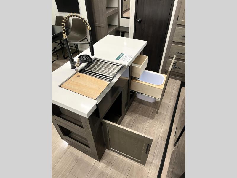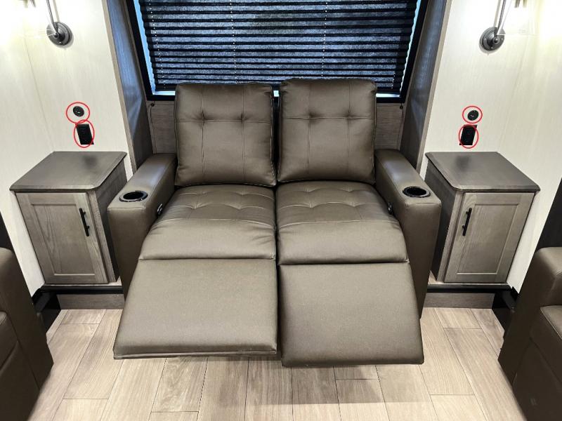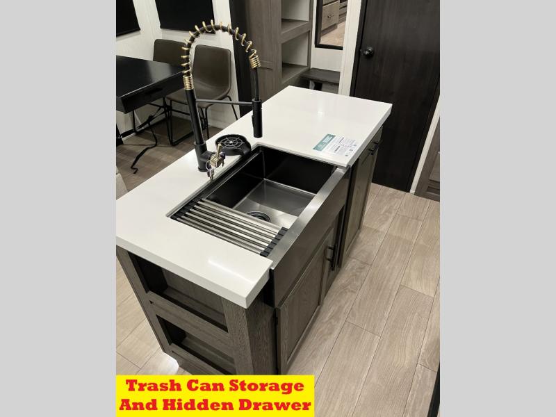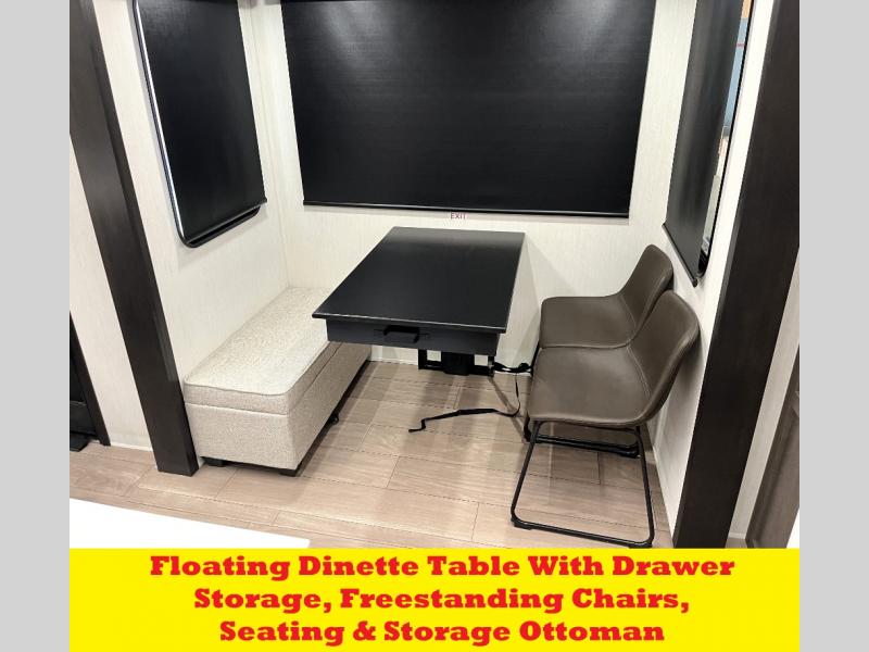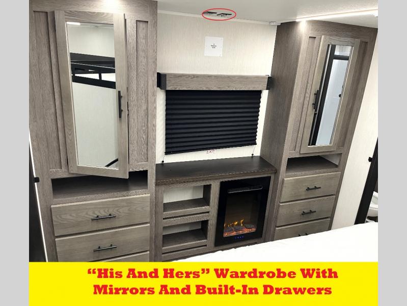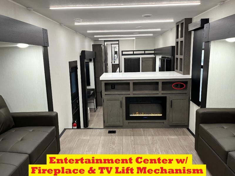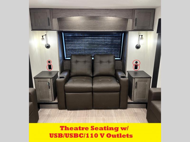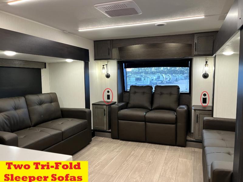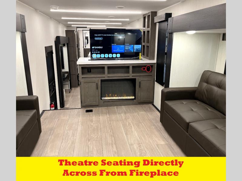 Five slides, a bath and a half, plus sleeping space for six make this fifth wheel the perfect choice! Once you arrive at your destination, prepare lunch on the exterior kitchen. Inside, you'll find a kitchen island, plenty of storage space, plus a free-standing table with chairs and a storage ottoman seat. The front living area will be a favorite place to hang out and this room can double as a bedroom with the two tri-fold sofas. There is also theater seating across from the entertainment center and fireplace, plus storage cabinets for movies or board games. When you're ready to call it a night, head to the master bedroom for a great night's rest on the king bed slide out. You will also love the full rear bath with dual sinks, a spacious shower, plus a closet with stackable washer and dryer prep!
