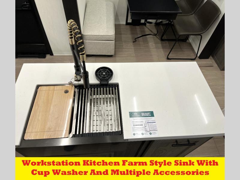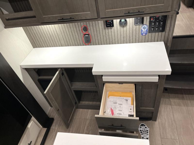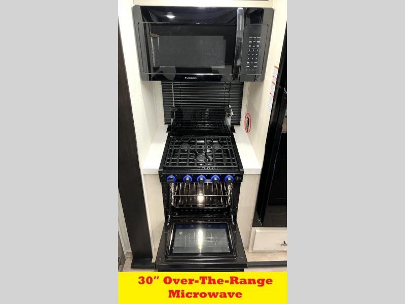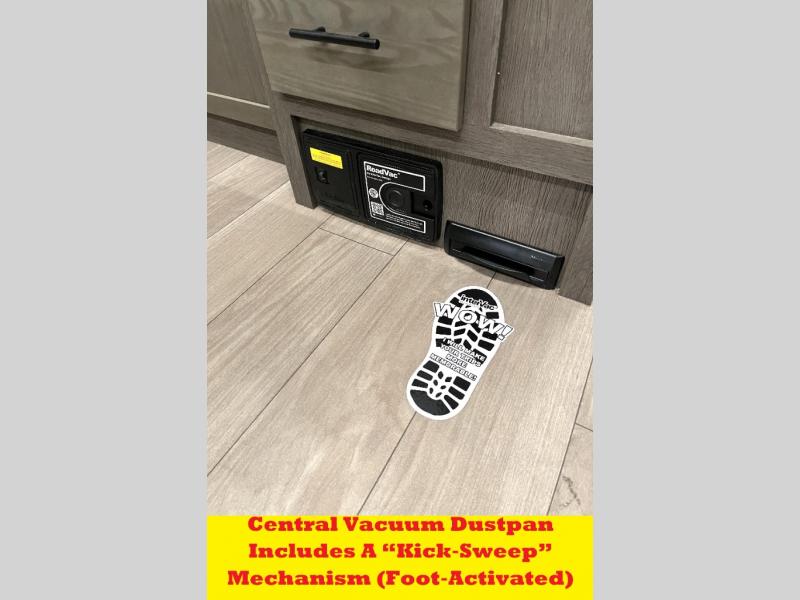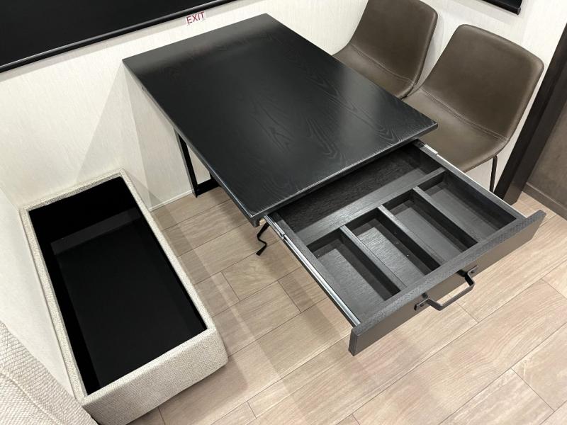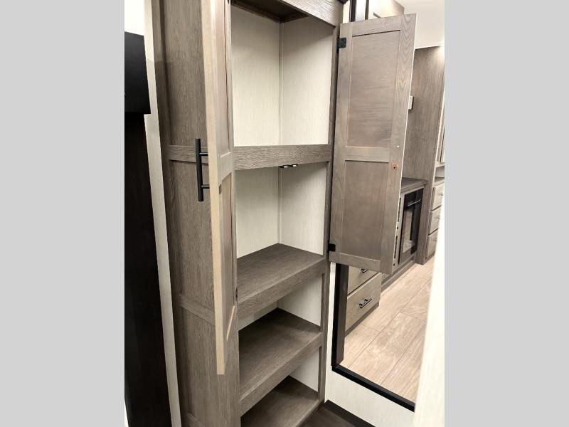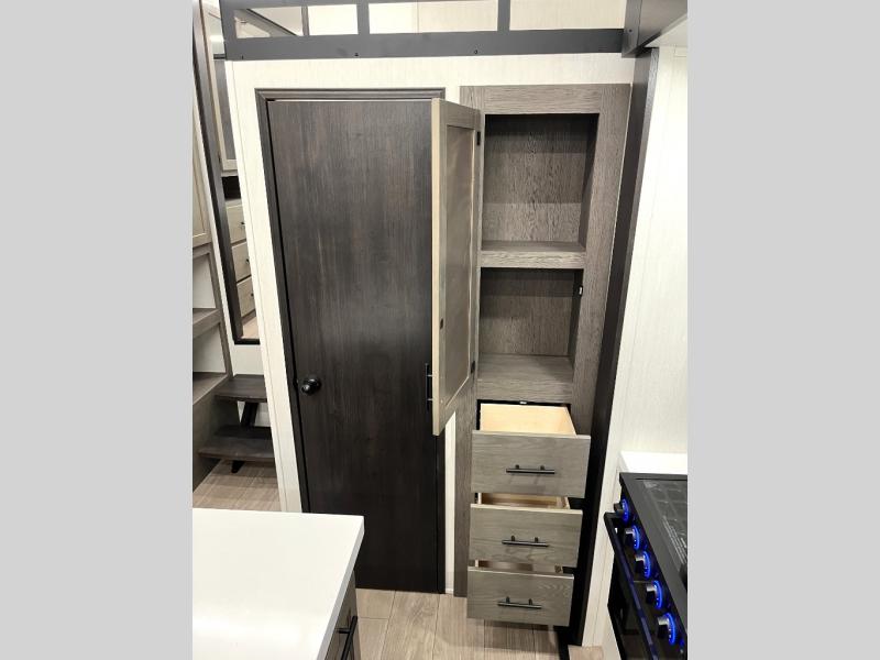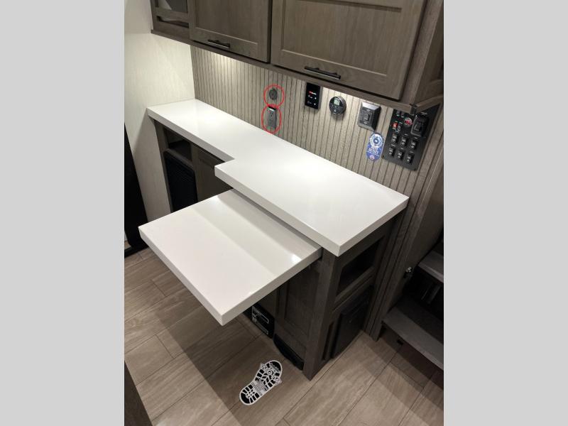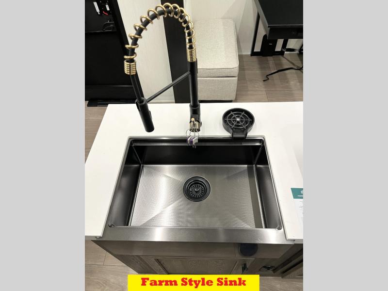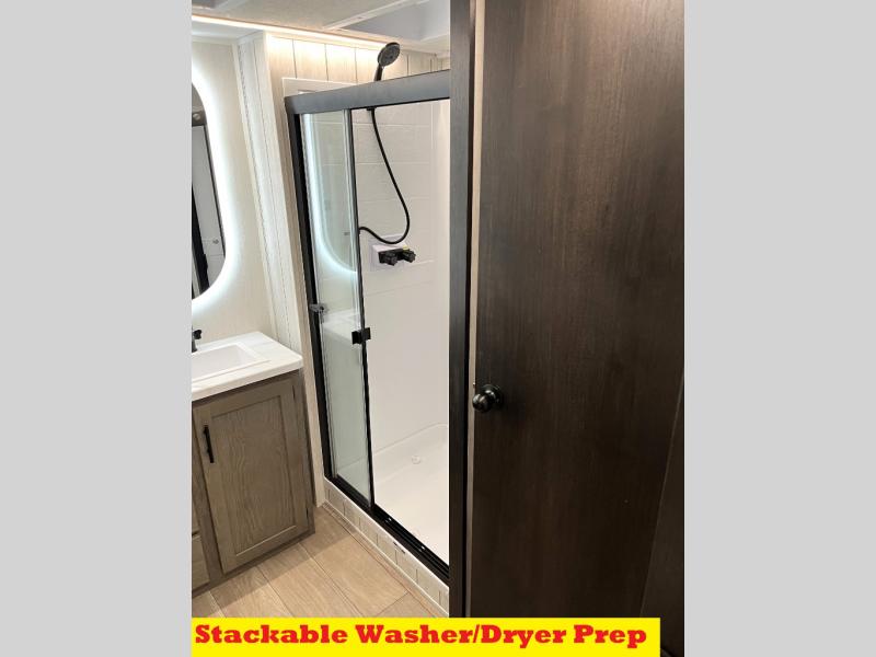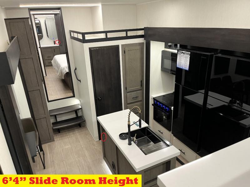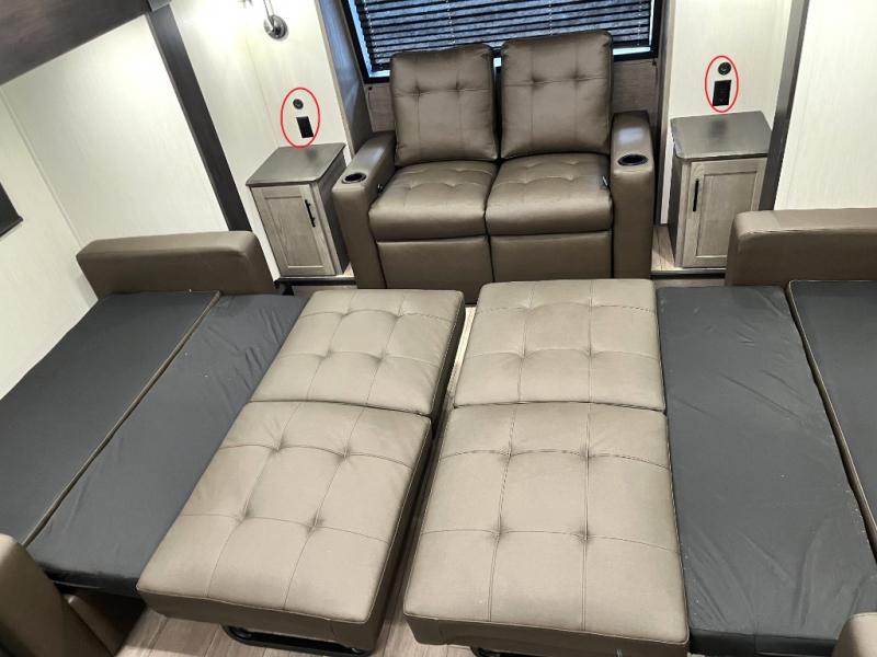 Five slides, a bath and a half, plus sleeping space for six make this fifth wheel the perfect choice! Once you arrive at your destination, prepare lunch on the exterior kitchen. Inside, you'll find a kitchen island, plenty of storage space, plus a free-standing table with chairs and a storage ottoman seat. The front living area will be a favorite place to hang out and this room can double as a bedroom with the two tri-fold sofas. There is also theater seating across from the entertainment center and fireplace, plus storage cabinets for movies or board games. When you're ready to call it a night, head to the master bedroom for a great night's rest on the king bed slide out. You will also love the full rear bath with dual sinks, a spacious shower, plus a closet with stackable washer and dryer prep!