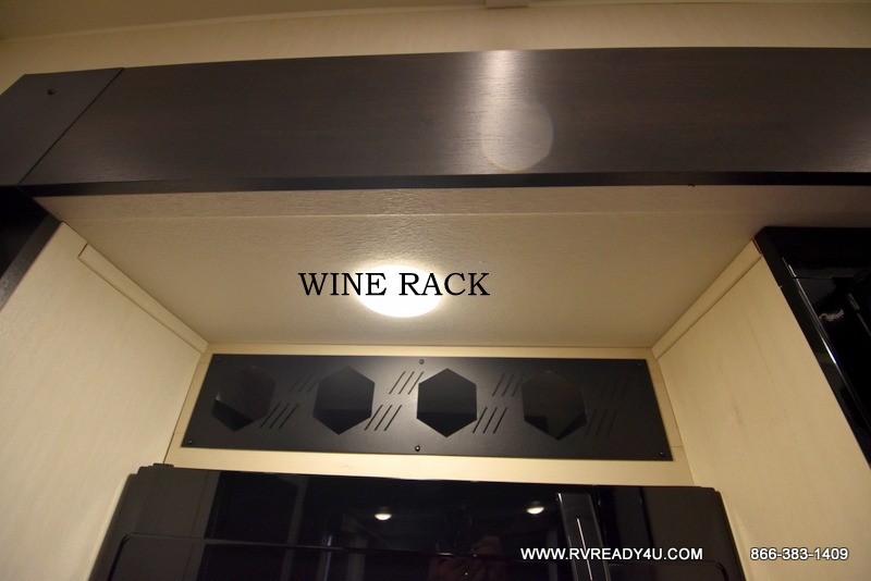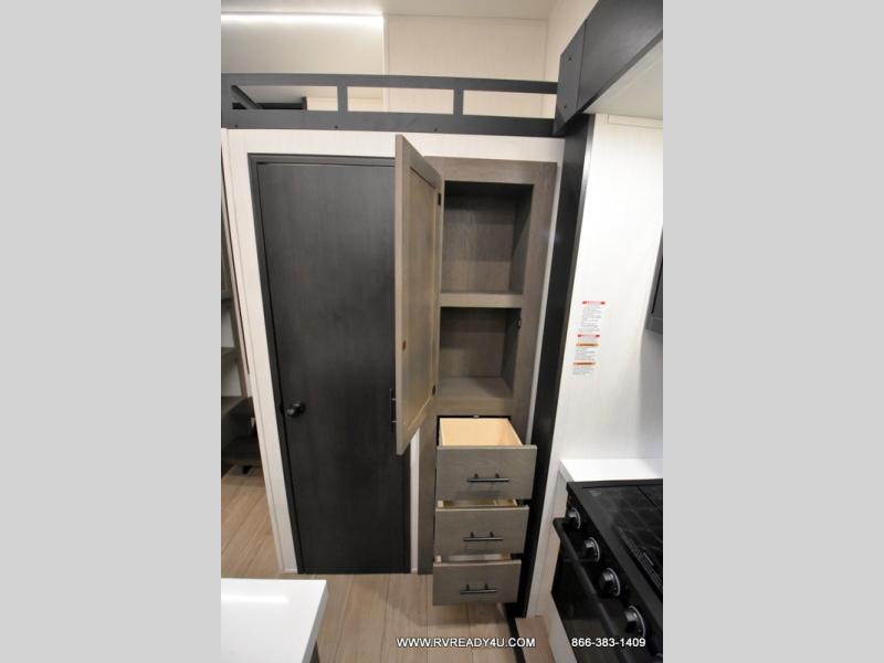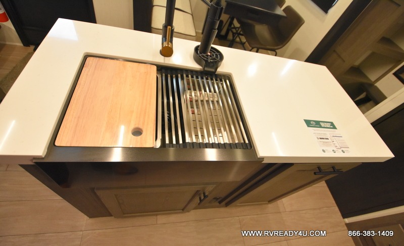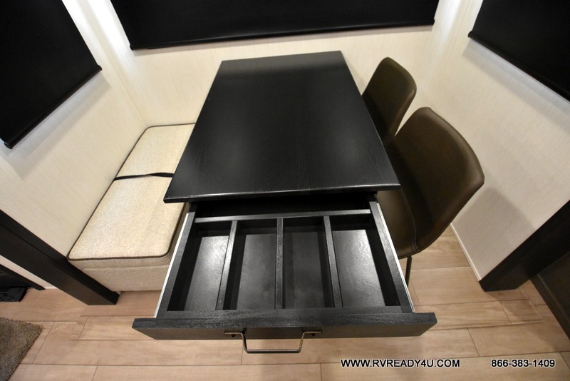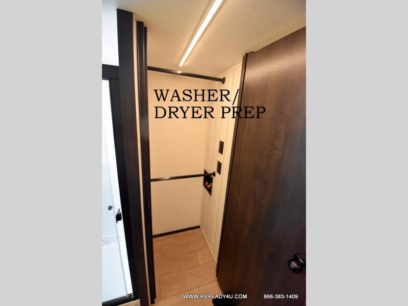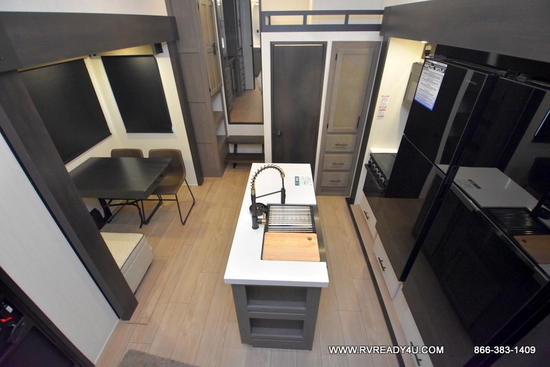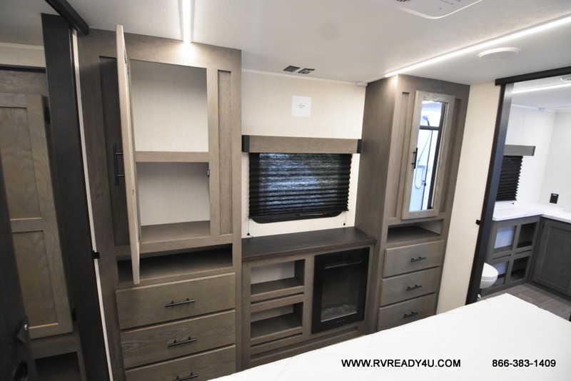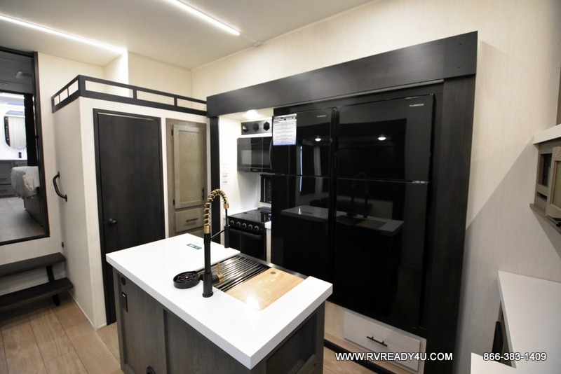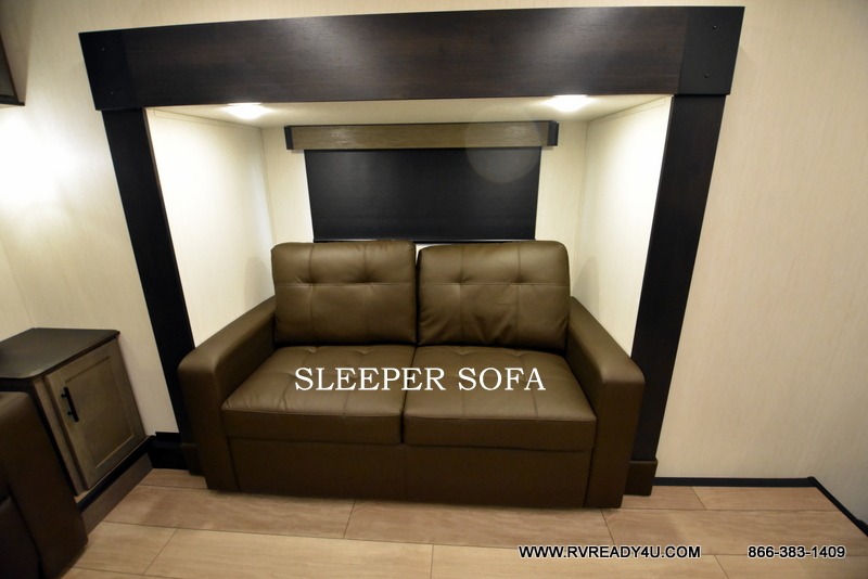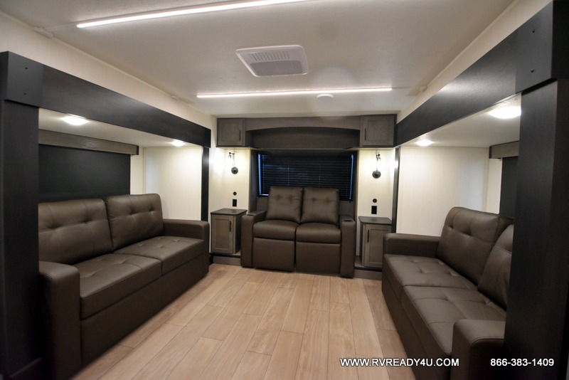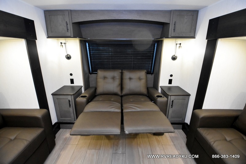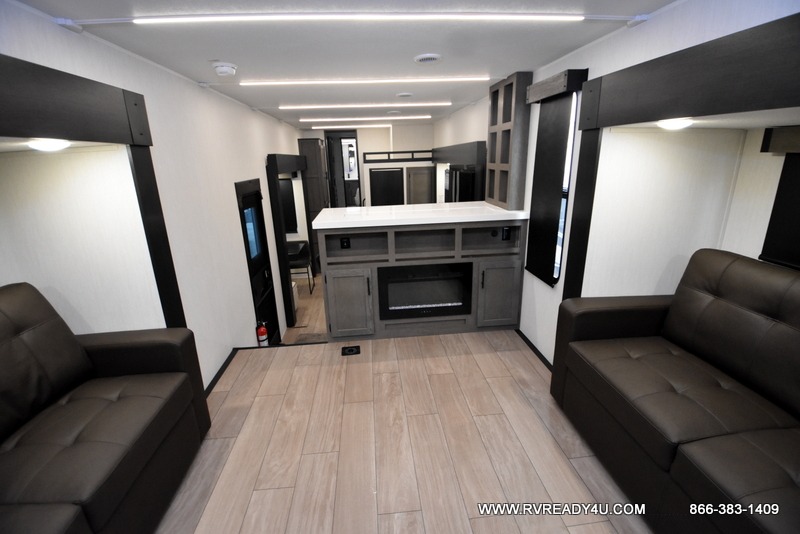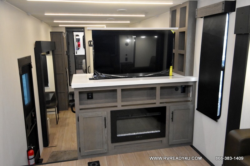 Five slides, a bath and a half, plus sleeping space for six make this fifth wheel the perfect choice! Once you arrive at your destination, prepare lunch on the exterior kitchen. Inside, you'll find a kitchen island, plenty of storage space, plus a free-standing table with chairs and a storage ottoman seat. The front living area will be a favorite place to hang out and this room can double as a bedroom with the two tri-fold sofas. There is also theater seating across from the entertainment center and fireplace, plus storage cabinets for movies or board games. When you're ready to call it a night, head to the master bedroom for a great night's rest on the king bed slide out. You will also love the full rear bath with dual sinks, a spacious shower, plus a closet with stackable washer and dryer prep!