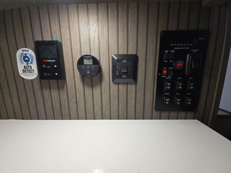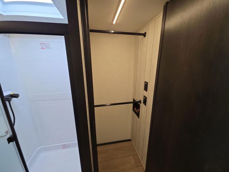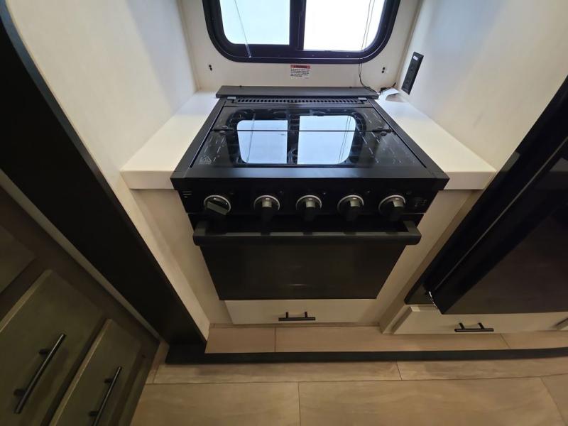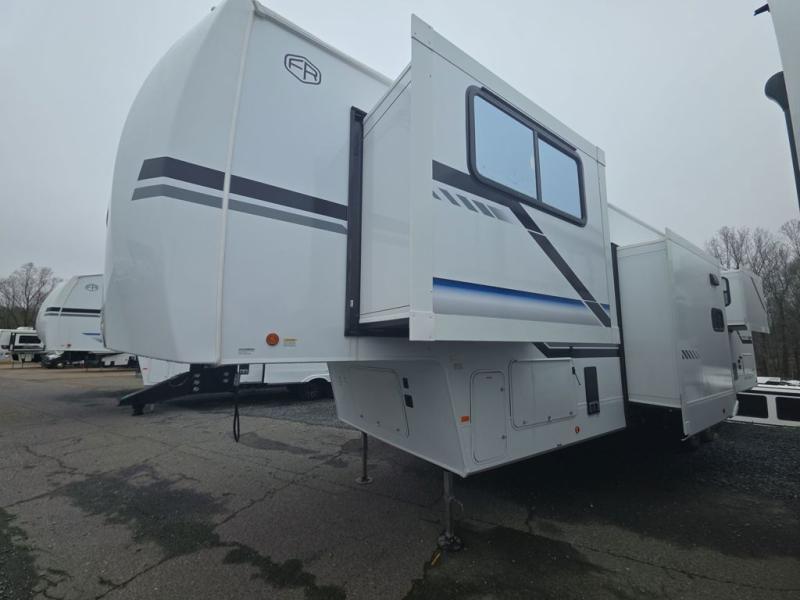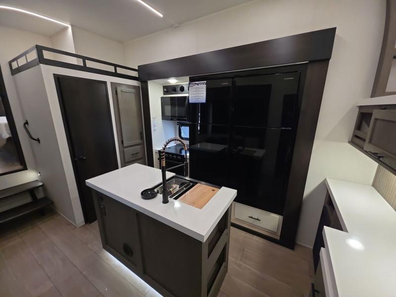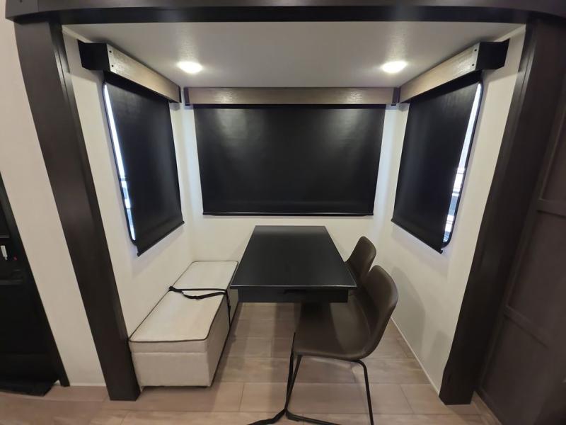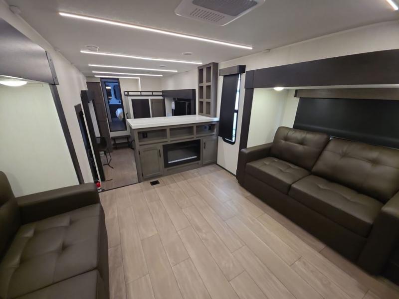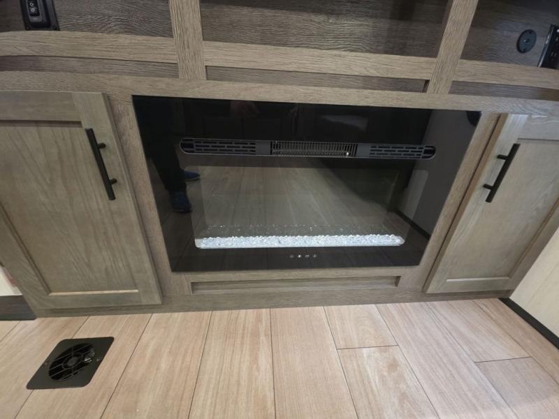 Five slides, a bath and a half, plus sleeping space for six make this fifth wheel the perfect choice! Once you arrive at your destination, prepare lunch on the exterior kitchen. Inside, you'll find a kitchen island, plenty of storage space, plus a free-standing table with chairs and a storage ottoman seat. The front living area will be a favorite place to hang out and this room can double as a bedroom with the two tri-fold sofas. There is also theater seating across from the entertainment center and fireplace, plus storage cabinets for movies or board games. When you're ready to call it a night, head to the master bedroom for a great night's rest on the king bed slide out. You will also love the full rear bath with dual sinks, a spacious shower, plus a closet with stackable washer and dryer prep!