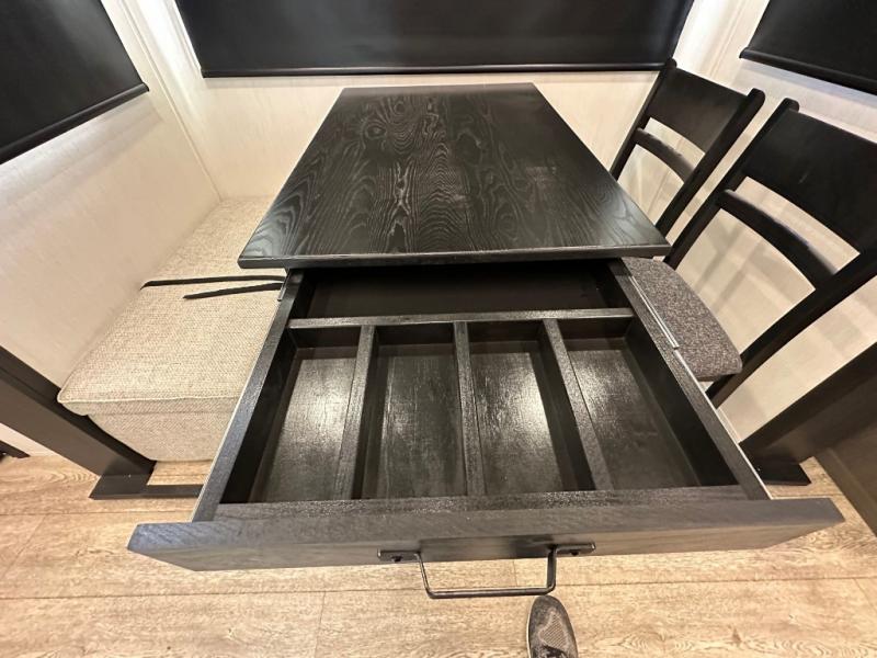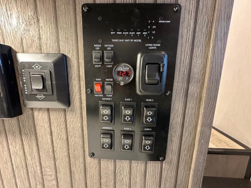 Five slides, a bath and a half, plus sleeping space for six make this fifth wheel the perfect choice! Once you arrive at your destination, prepare lunch on the exterior kitchen. Inside, you'll find a kitchen island, plenty of storage space, plus a free-standing table with chairs and a storage ottoman seat. The front living area will be a favorite place to hang out and this room can double as a bedroom with the two tri-fold sofas. There is also theater seating across from the entertainment center and fireplace, plus storage cabinets for movies or board games. When you're ready to call it a night, head to the master bedroom for a great night's rest on the king bed slide out. You will also love the full rear bath with dual sinks, a spacious shower, plus a closet with stackable washer and dryer prep!
