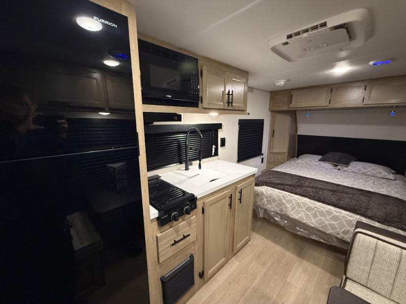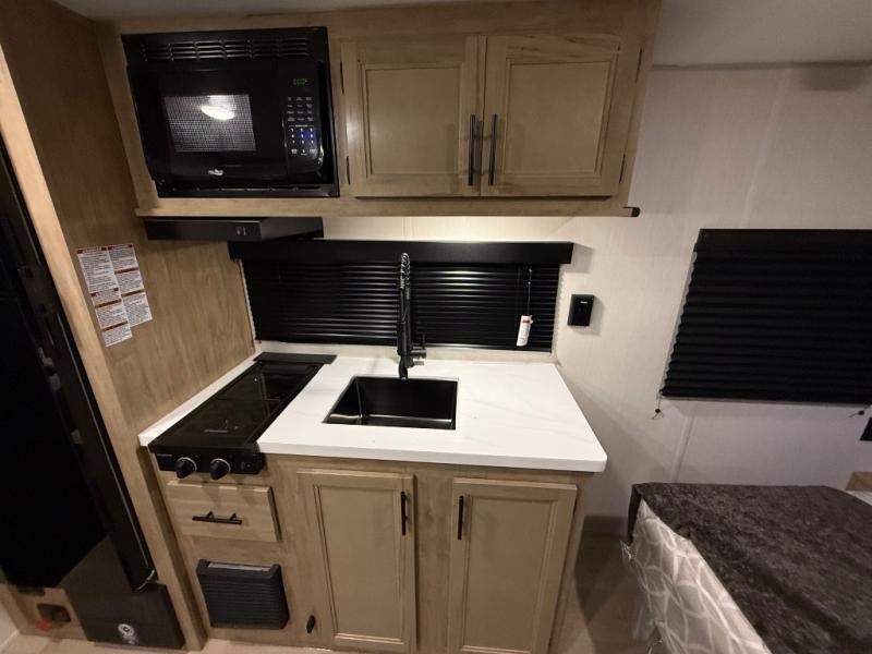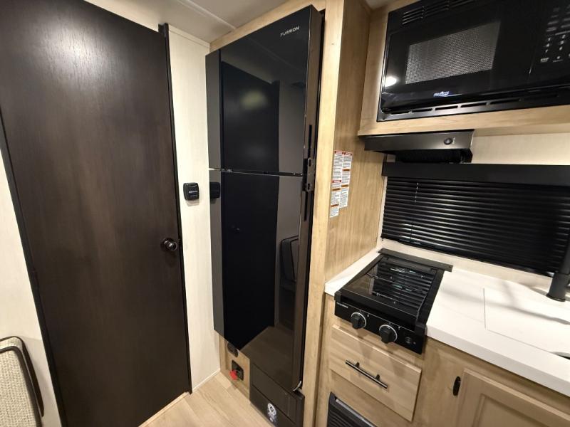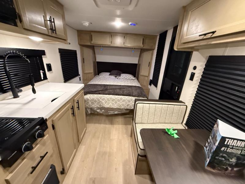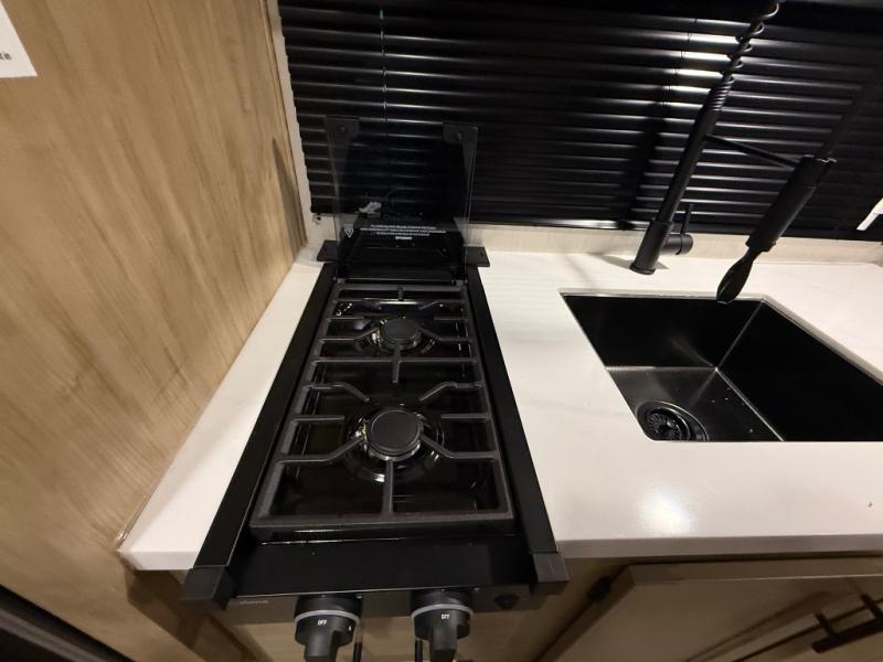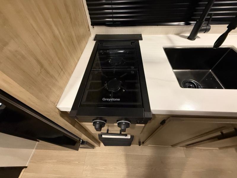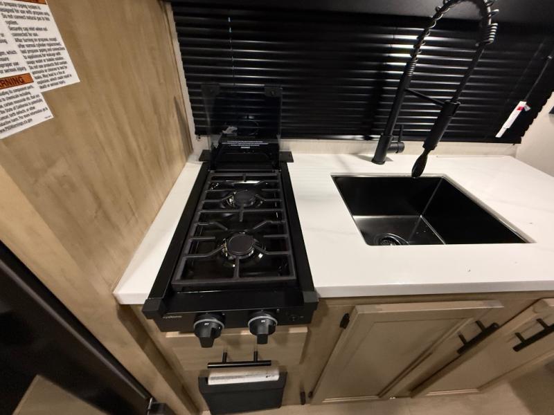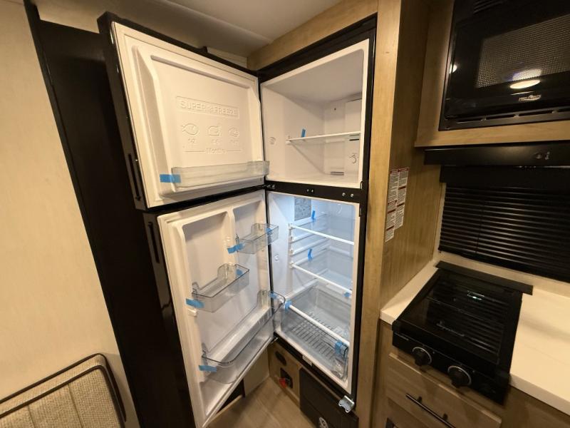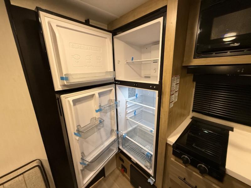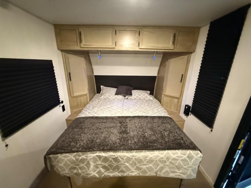 You will love camping in this travel trailer with your own queen bed up front! Freshen up each morning in the full rear bathroom with the tub/shower, toilet, and sink. Fill your bellies with the perishables stored in the 12V high efficiency refrigerator and cook them on the high output cooktop. You could even prepare a meal while breathing in some fresh air at the outside mini kitchen while staying protected by the 12' power awning. Easily store all of your outdoor gear in the outside storage area too!