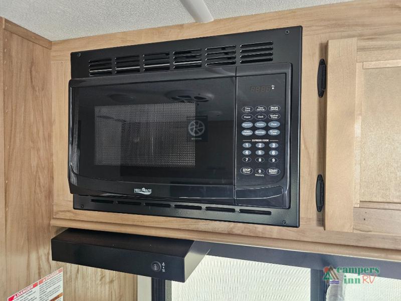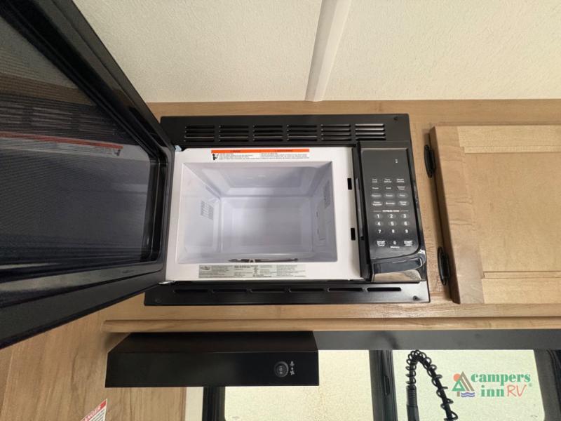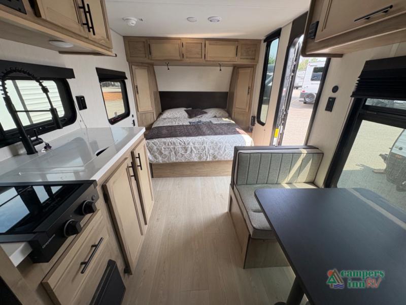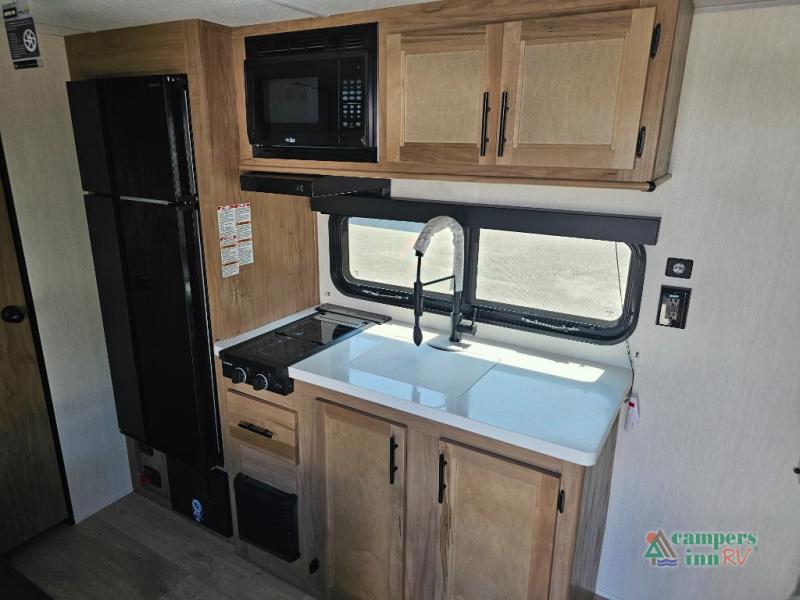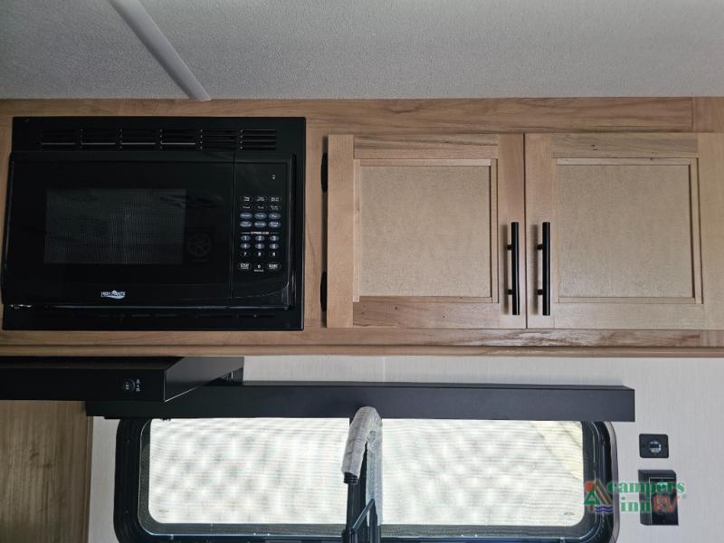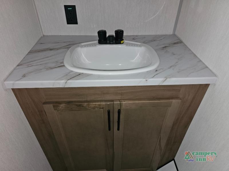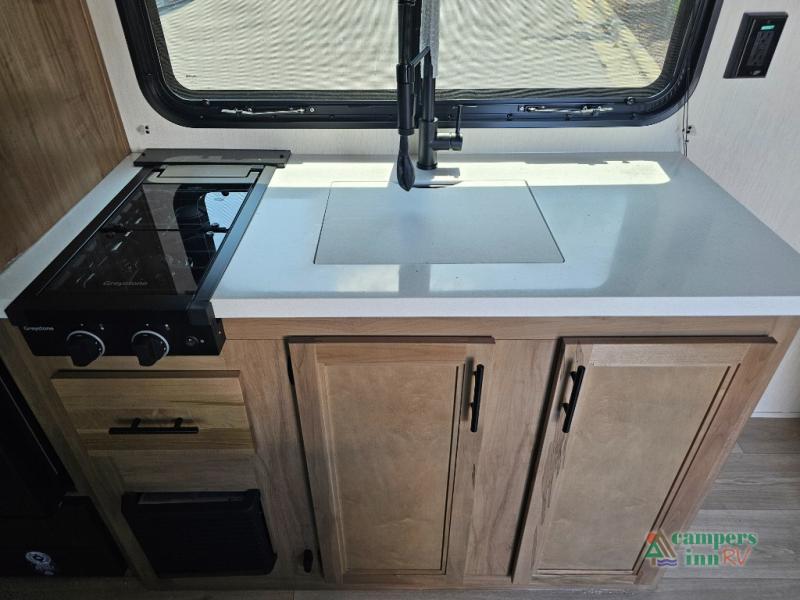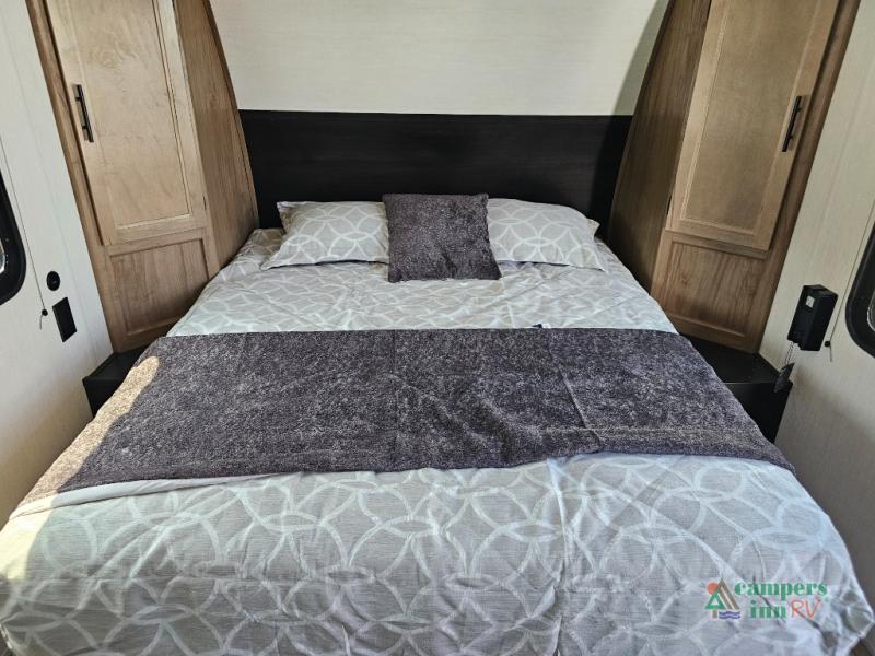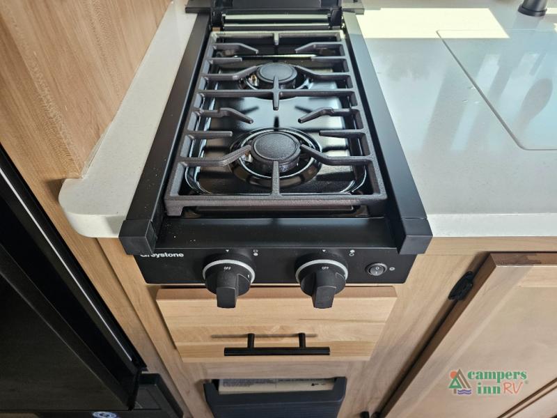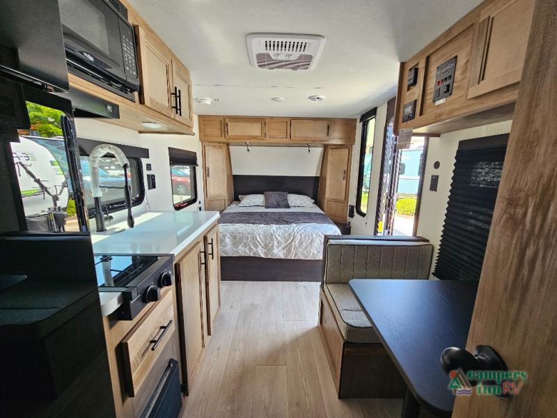 You will love camping in this travel trailer with your own queen bed up front! Freshen up each morning in the full rear bathroom with the tub/shower, toilet, and sink. Fill your bellies with the perishables stored in the 12V high efficiency refrigerator and cook them on the high output cooktop. You could even prepare a meal while breathing in some fresh air at the outside mini kitchen while staying protected by the 12' power awning. Easily store all of your outdoor gear in the outside storage area too!