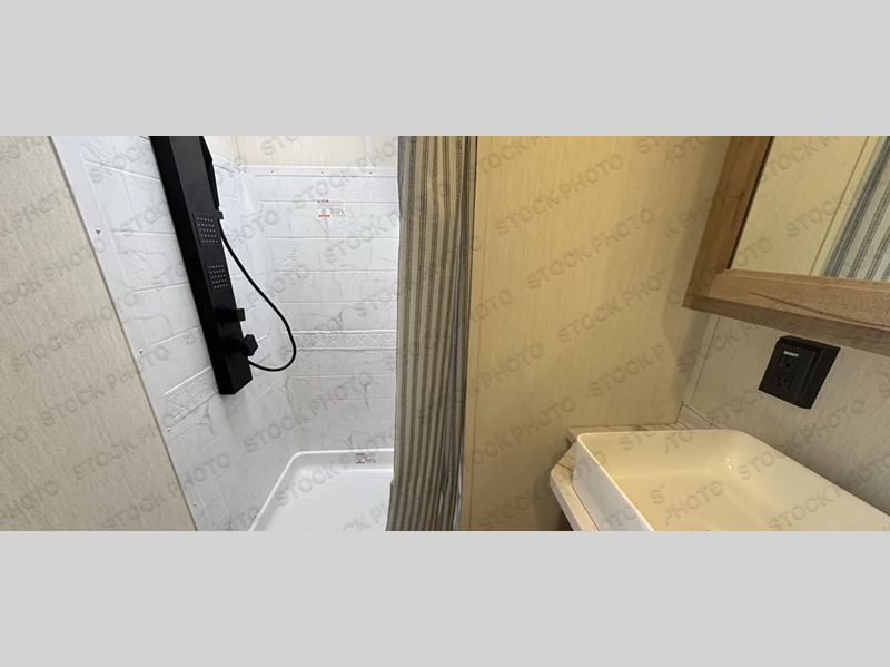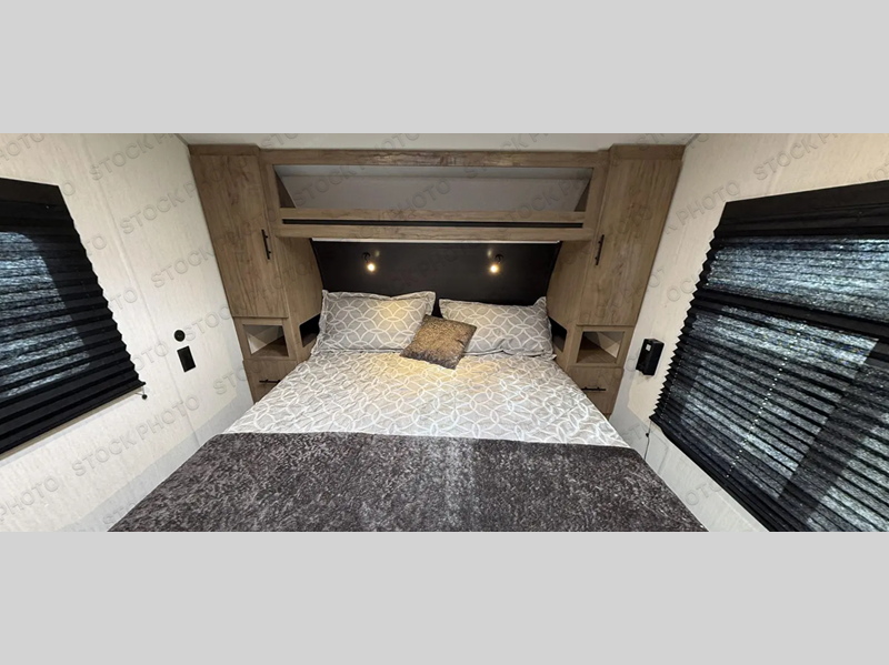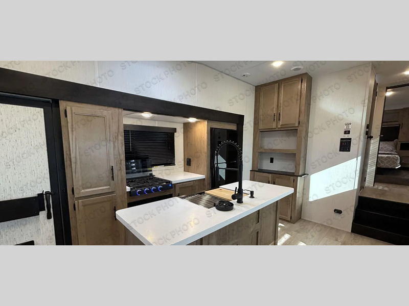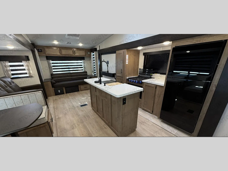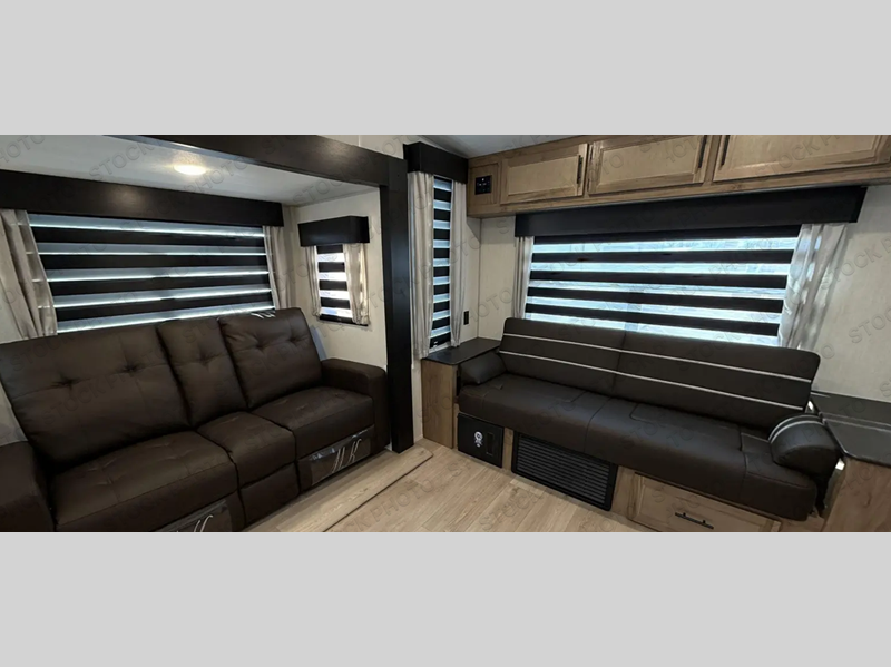 Camping trips are made complete in this spacious fifth wheel! There are dual opposing slides in the main living area plus a kitchen island for more counter space. The sofa, booth dinette, and theater seating provide comfortable seating spaces, and there is a fireplace with hidden shelves for smart storage solutions. The chef of your group will have all the appliances needed to cook meals, along with a hutch and pantry for even more storage. A full bath will let you freshen up after a day at the lake, and the RV king bed is sure to provide a great night's rest. There are also dual wardrobes to keep your space tidy, along with a linen closet with a washer/dryer option!