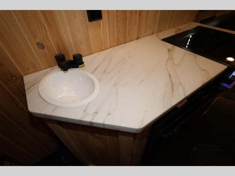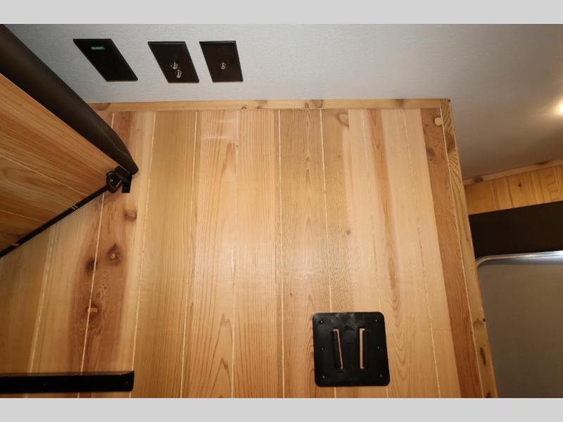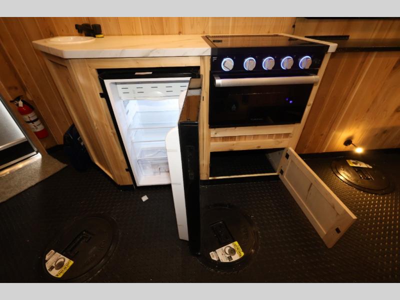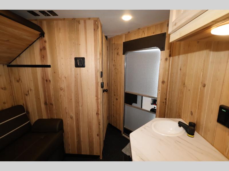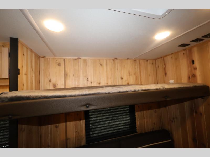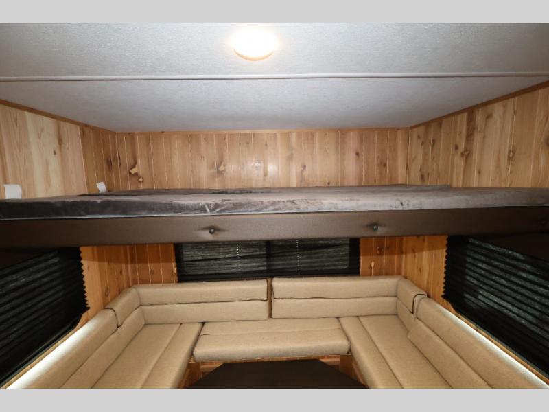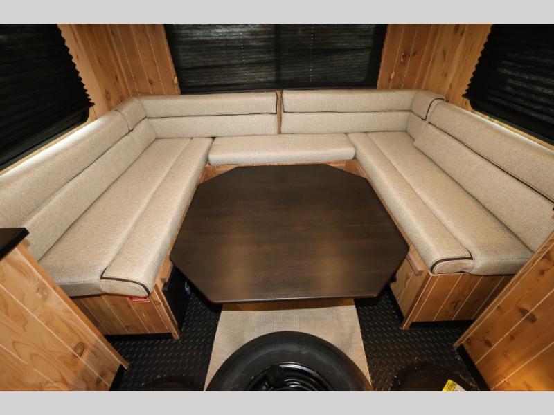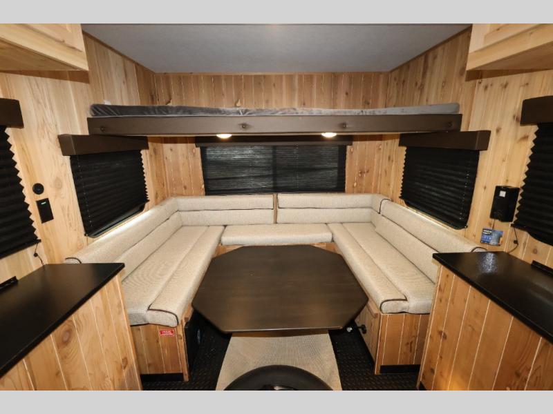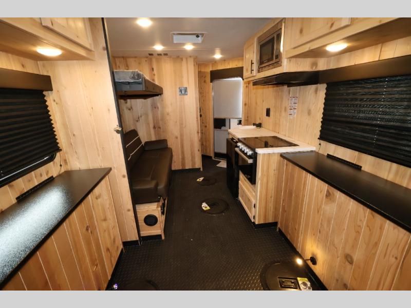 Come experience your next fishing trip in comfort and style with this Cherokee Grey Wolf fish house. You can visit with your family while relaxing on the sofa with a flip-up bunk above or the U-shaped dinette with an electric lift bunk above. When you need a break from fishing, then easily whip up a snack at the cooktop. Throughout this unit you will find overhead cabinets for you to keep things neat and tidy, and with six fishing holes throughout this model, you can easily find your favorite fishing spot!