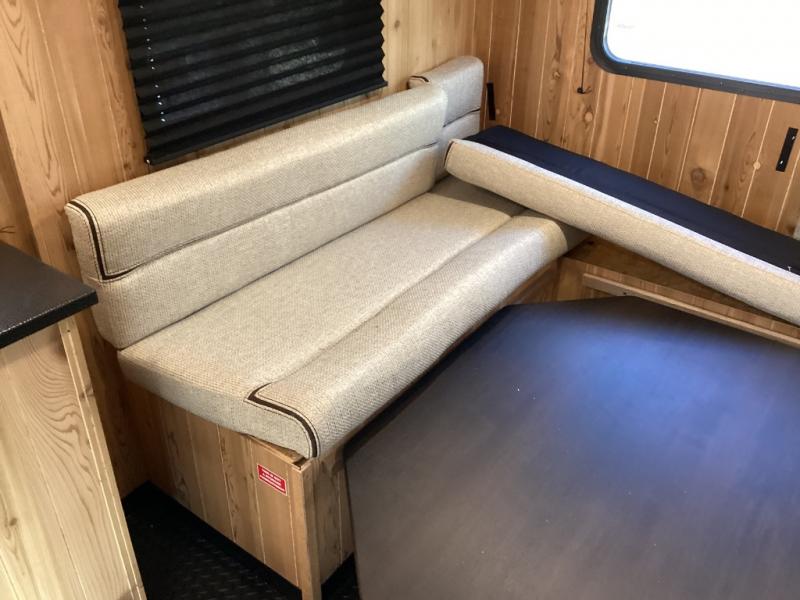 Rear U-shaped dinette converts into extra sleeping space, while a lift-up bunk keeps the area flexible and open. -