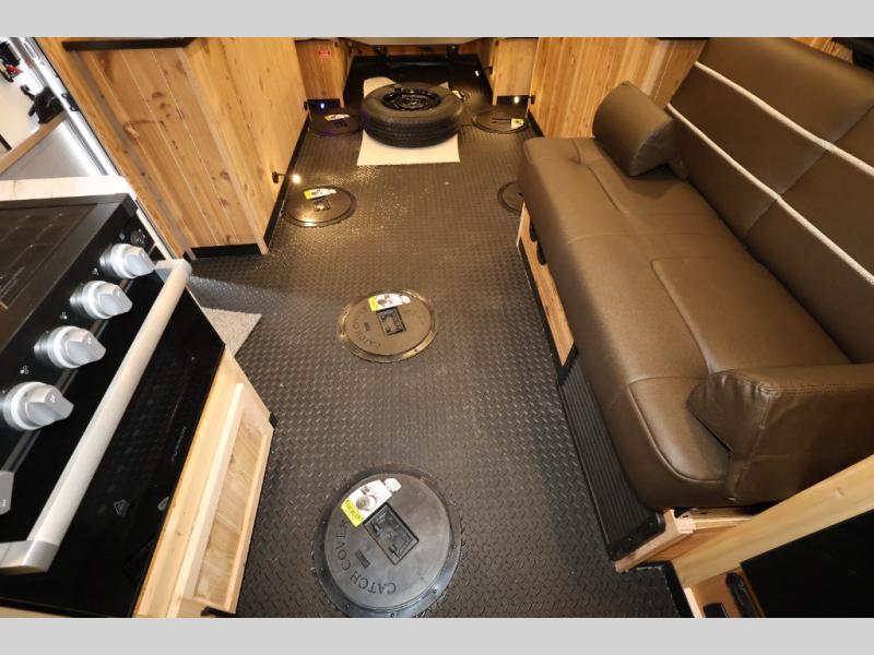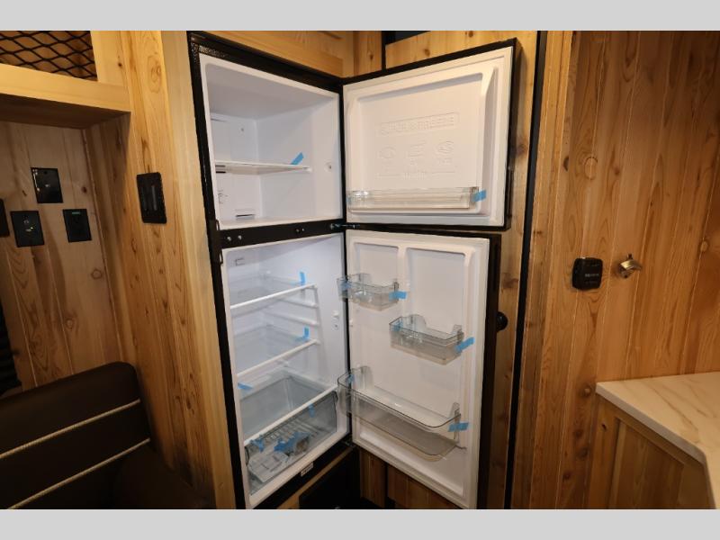 The Cherokee Grey Wolf fish houses by Forest River are constructed with a fully walkable residential trussed roof system, dual pane windows, and a thermofoil wrapped roof for additional insulation. You will also find a heavy duty rubber floor, a diamond plate exterior base, and a V-nose design for better towability. There is convenient rod storage inside, along with multiple fishing holes, LED fishing hole lights, and a 12V refrigerator!