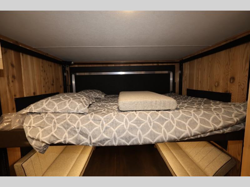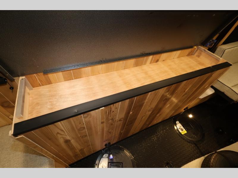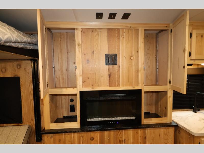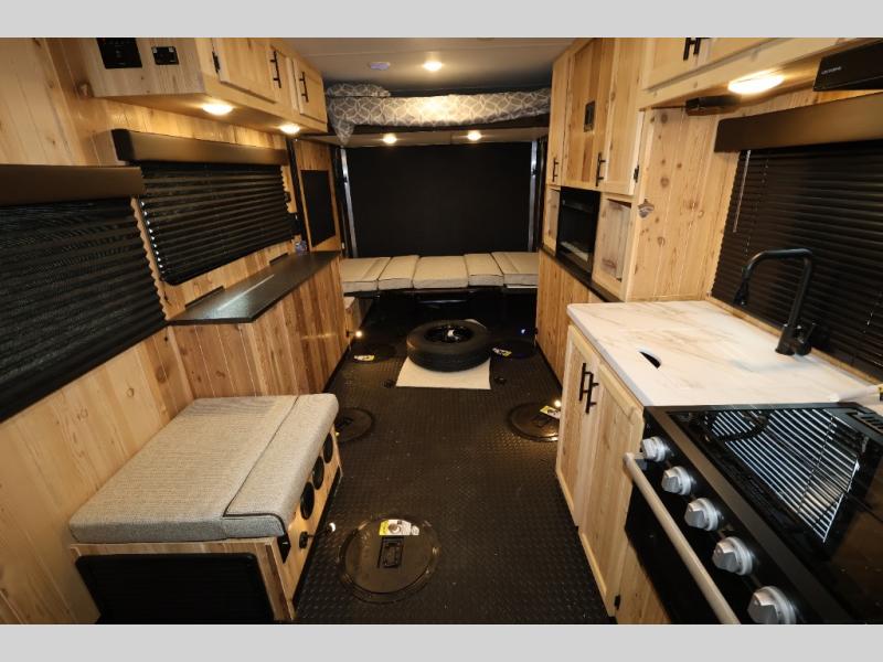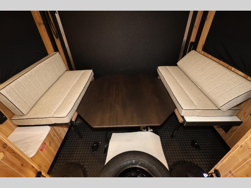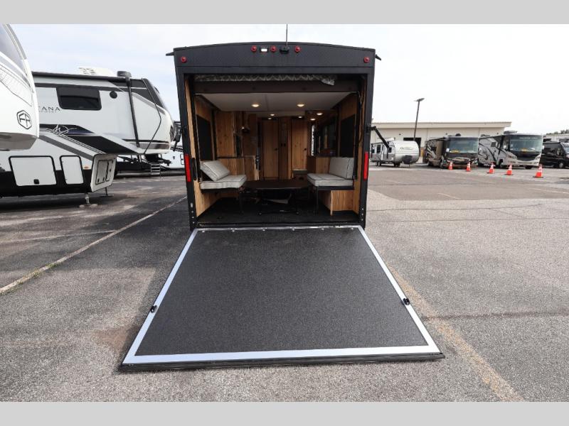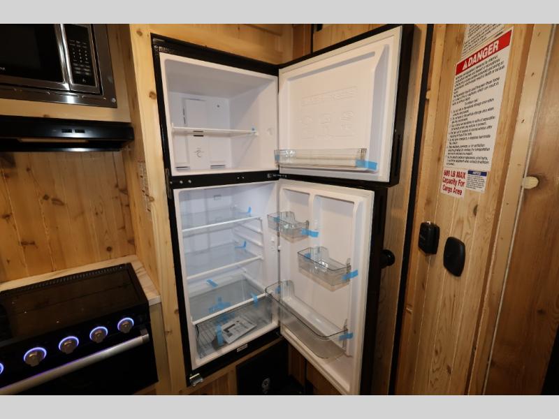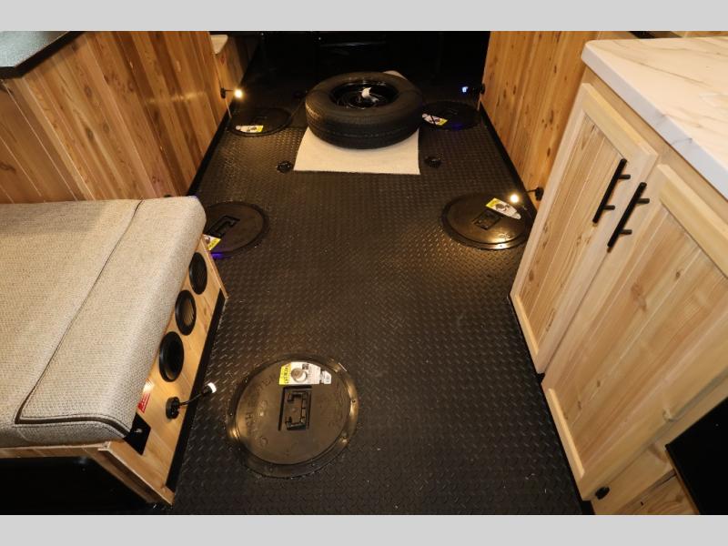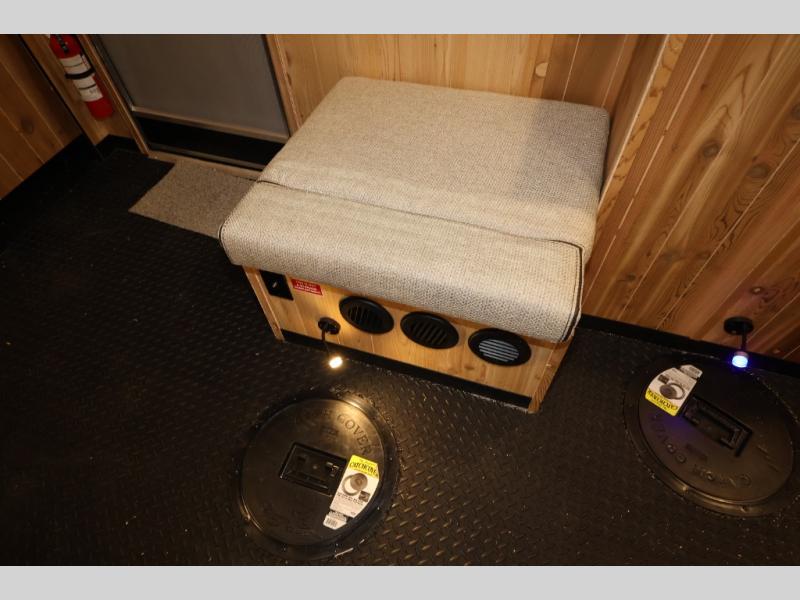 The Cherokee Grey Wolf fish houses by Forest River are constructed with a fully walkable residential trussed roof system, dual pane windows, and a thermofoil wrapped roof for additional insulation. You will also find a heavy duty rubber floor, a diamond plate exterior base, and a V-nose design for better towability. There is convenient rod storage inside, along with multiple fishing holes, LED fishing hole lights, and a 12V refrigerator!