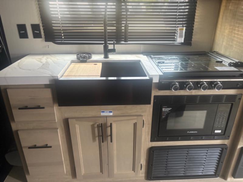 Enjoy a fully equipped kitchen with a two-burner cooktop, microwave, large 12V refrigerator, and deep sink. Stay entertained with pre-wired TV hookups, Bluetooth stereo, and indoor/outdoor speakers. With durable construction, solid-step entry, and lightweight towing, the Grey Wolf 18RR is ready for every destination.