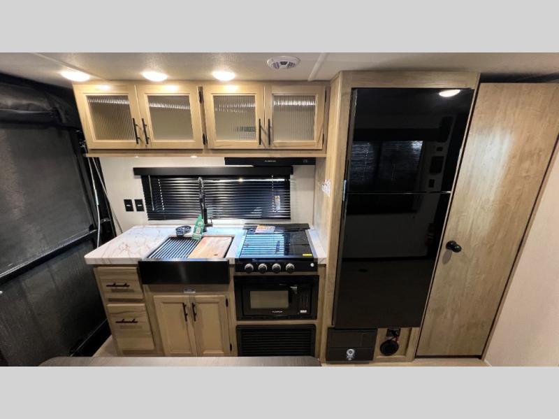 You will undoubtedly love this Cherokee Grey Wolf toy hauler! Because of its ability to have up to 15' 2" of cargo space, you can easily load up the ramp door and head out to your outdoor toy land, and you can bring much more than just your toys since this trailer also comes with exterior storage, a bedside wardrobe, overhead cabinets, an 10-cubic foot refrigerator, and a kitchen pantry. The full bathroom is another feature that is going to allow you to experience a true getaway since you won't need to find public facilities to use while you're gone, and the USB charging stations will allow you to charge your phone inside while you're outside playing.