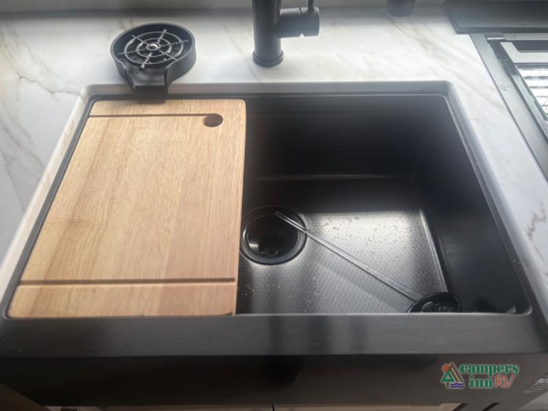 Inside the layout transforms: the fold-down sofa and removable table give you lounge, dining or extra cargo space, and up front you’ve got a queen-size bed for comfortable nights. The kitchen features a 10?cu?ft high-efficiency refrigerator, a tankless water heater, and smart touches that make living on the road feel like home. There’s also a full bathroom with a tub/shower combo so you can skip the campground bathhouse if you like. On the build side, you’ll find things like a walkable residential-trussed roof, dual-pane windows, heavy-duty rubber flooring in the garage area and insulation under the floor — all showing that this isn’t just “throw-away” camping gear, it’s designed to serve.