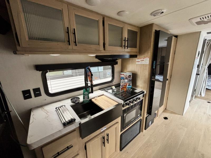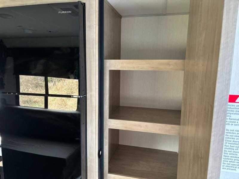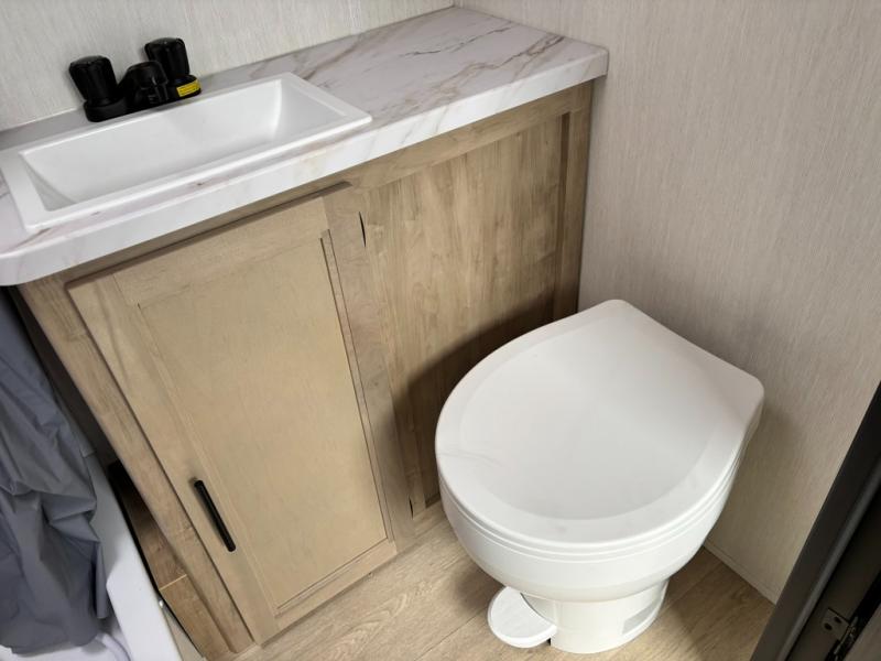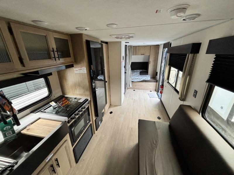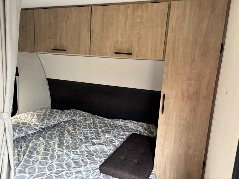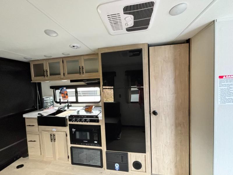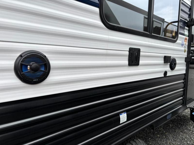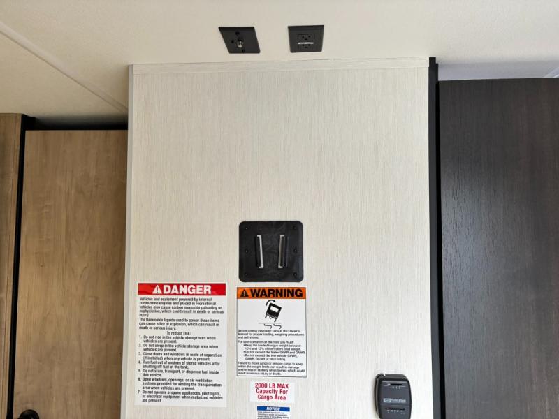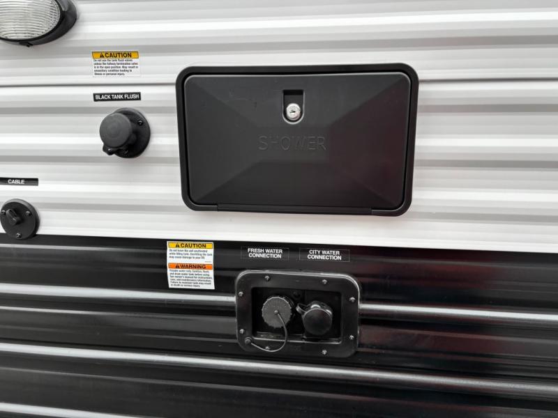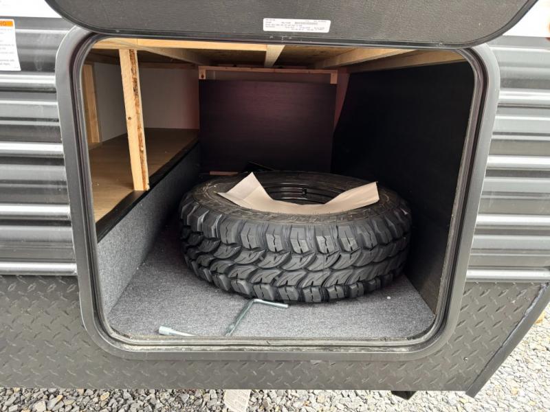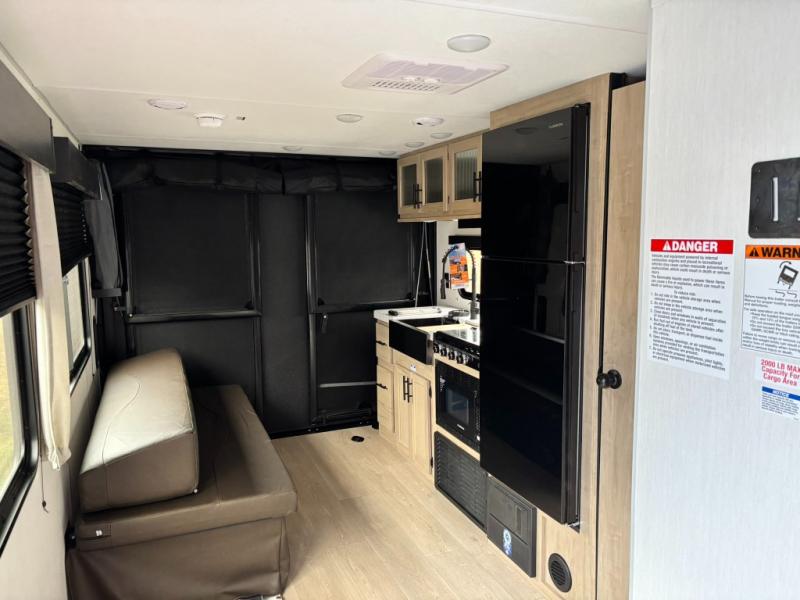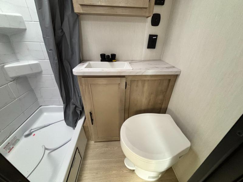 You will undoubtedly love this Cherokee Grey Wolf toy hauler! Because of its ability to have up to 15' 2" of cargo space, you can easily load up the ramp door and head out to your outdoor toy land, and you can bring much more than just your toys since this trailer also comes with exterior storage, a bedside wardrobe, overhead cabinets, a refrigerator, and a kitchen pantry. The full bathroom is another feature that is going to allow you to experience a true getaway since you won't need to find public facilities to use while you're gone, and the USB charging stations will allow you to charge your phone inside while you're outside playing.