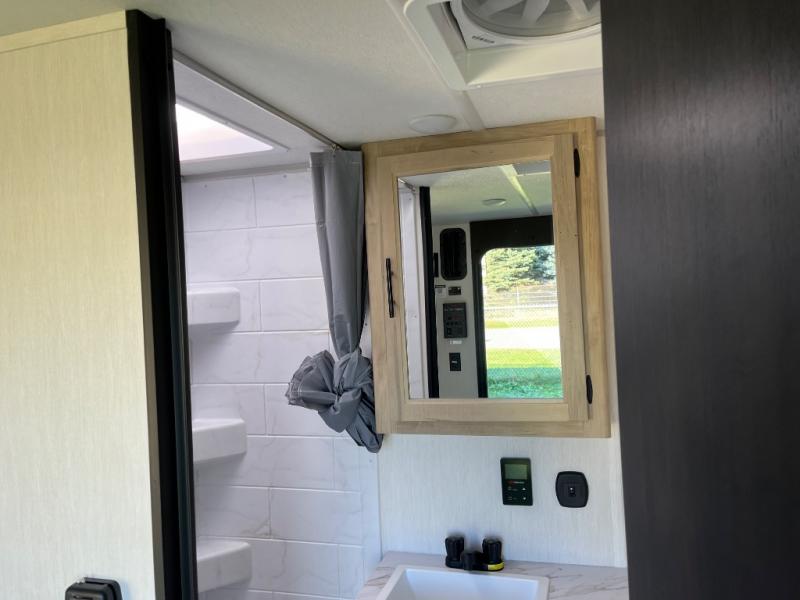 You will undoubtedly love this Cherokee Grey Wolf toy hauler! Because of its ability to have up to 15' 2" of cargo space, you can easily load up the ramp door and head out to your outdoor toy land, and you can bring much more than just your toys since this trailer also comes with exterior storage, a bedside wardrobe, overhead cabinets, a refrigerator, and a kitchen pantry. The full bathroom is another feature that is going to allow you to experience a true getaway since you won't need to find public facilities to use while you're gone, and the USB charging stations will allow you to charge your phone inside while you're outside playing.