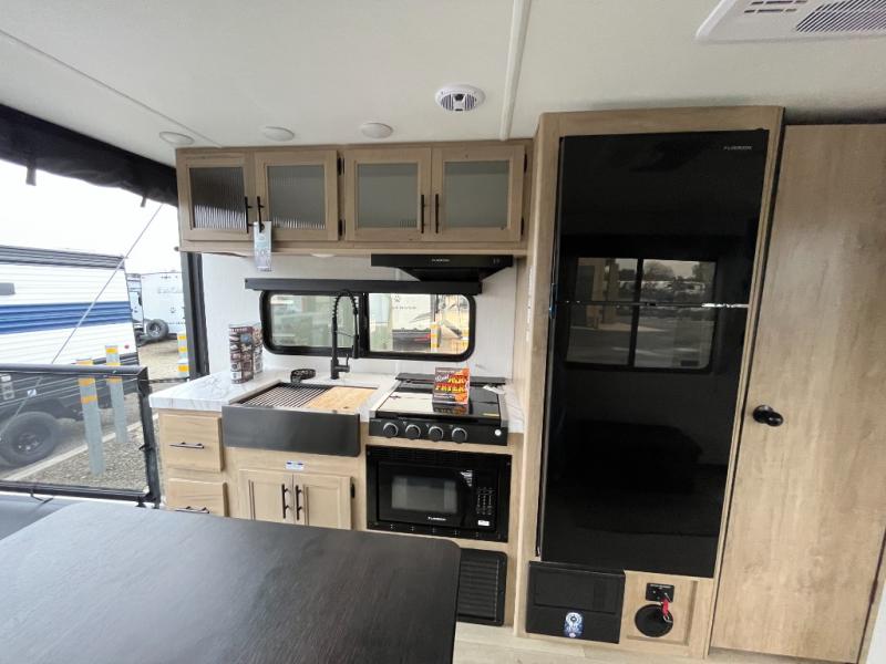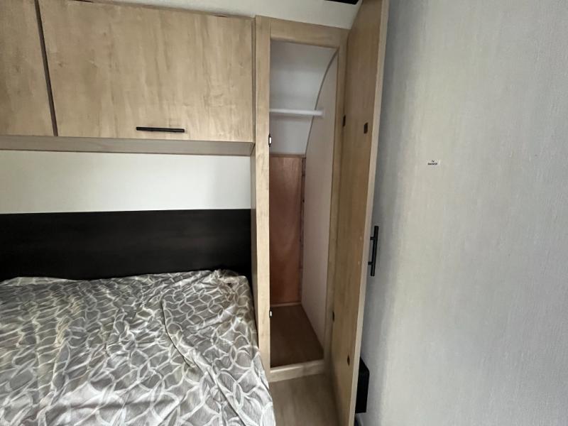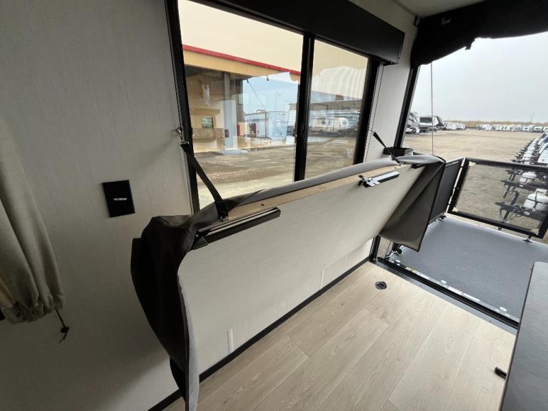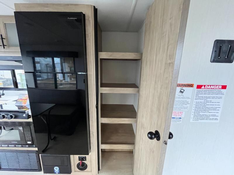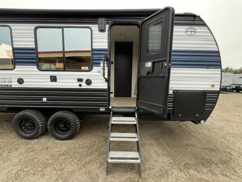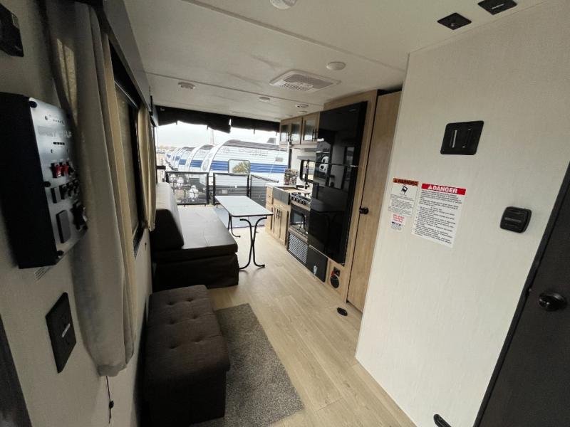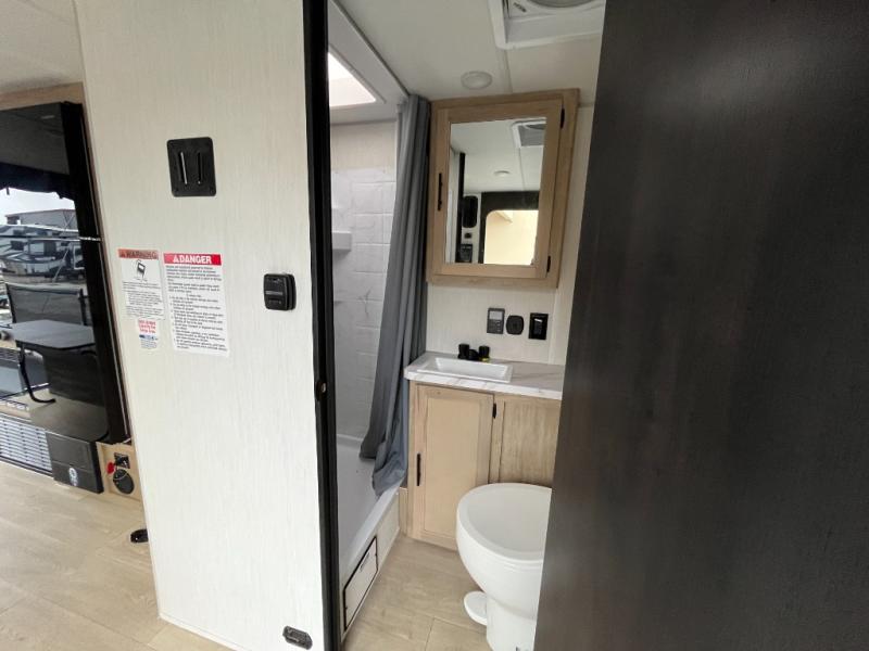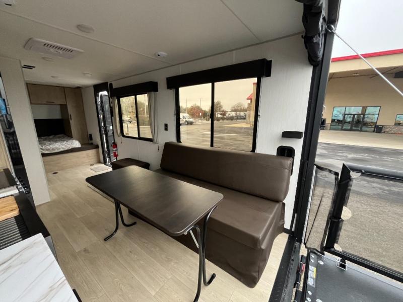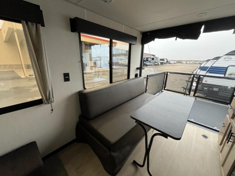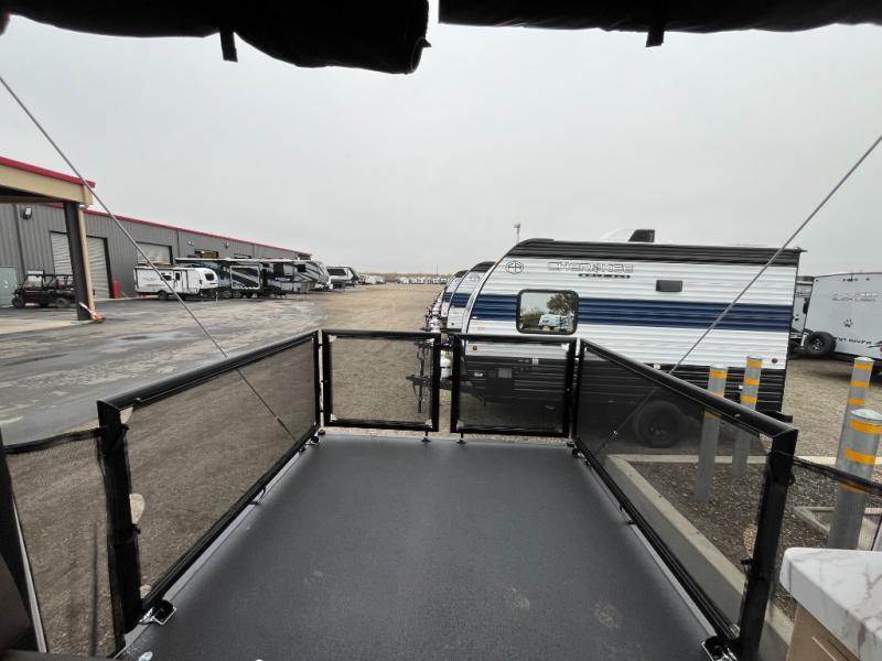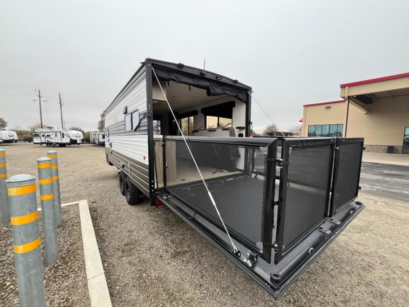 You will undoubtedly love this Cherokee Grey Wolf toy hauler! Because of its ability to have up to 15' 2" of cargo space, you can easily load up the ramp door and head out to your outdoor toy land, and you can bring much more than just your toys since this trailer also comes with exterior storage, a bedside wardrobe, overhead cabinets, a refrigerator, and a kitchen pantry. The full bathroom is another feature that is going to allow you to experience a true getaway since you won't need to find public facilities to use while you're gone, and the USB charging stations will allow you to charge your phone inside while you're outside playing.
