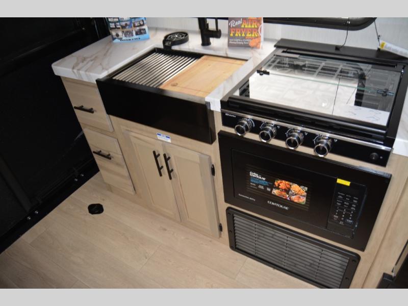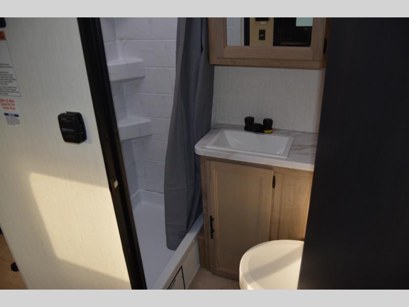 You will undoubtedly love this Cherokee Grey Wolf toy hauler! Because of its ability to have up to 15' 2" of cargo space, you can easily load up the ramp door and head out to your outdoor toy land, and you can bring much more than just your toys since this trailer also comes with exterior storage, a bedside wardrobe, overhead cabinets, a refrigerator, and a kitchen pantry. The full bathroom is another feature that is going to allow you to experience a true getaway since you won't need to find public facilities to use while you're gone, and the USB charging stations will allow you to charge your phone inside while you're outside playing.